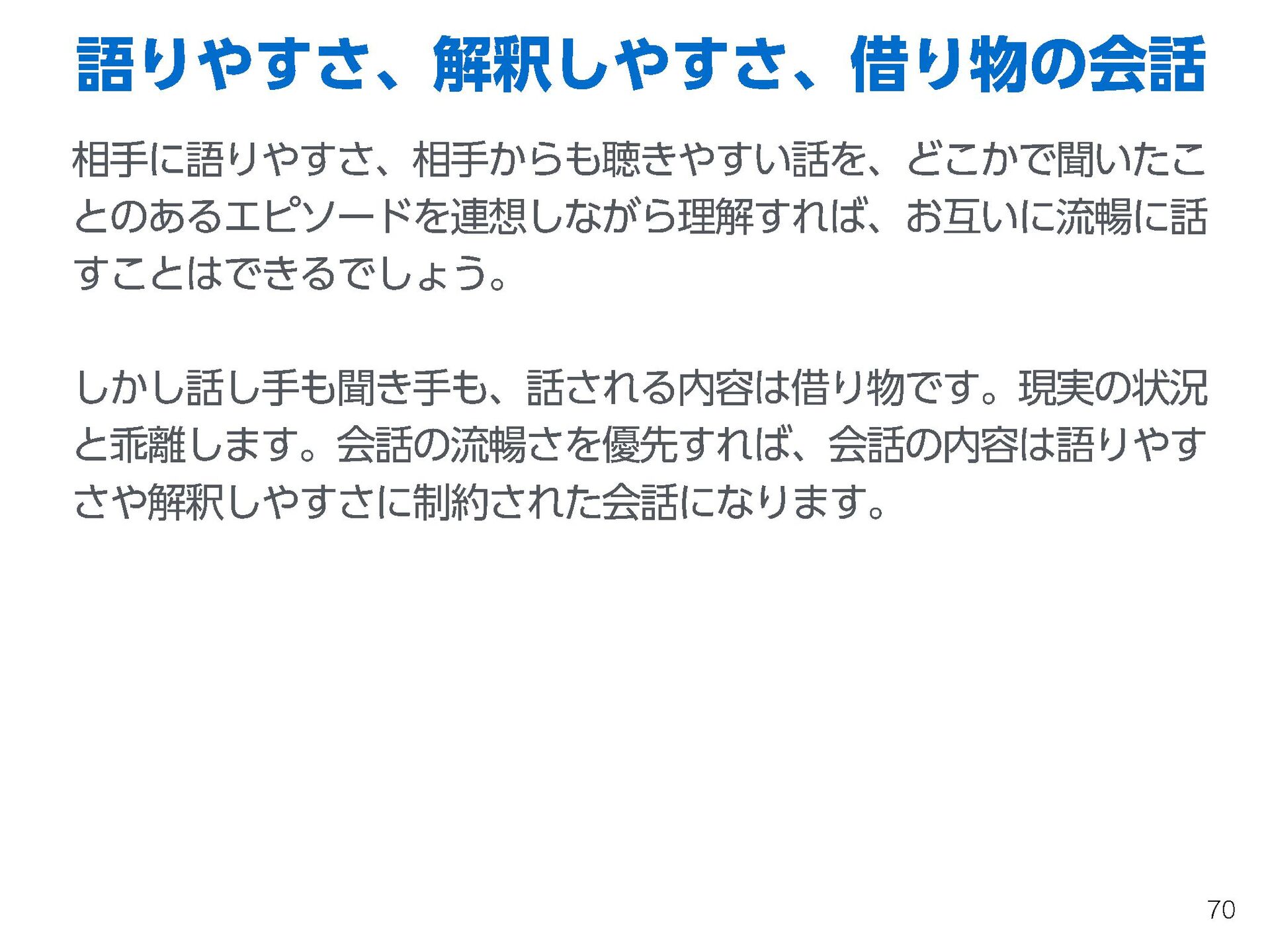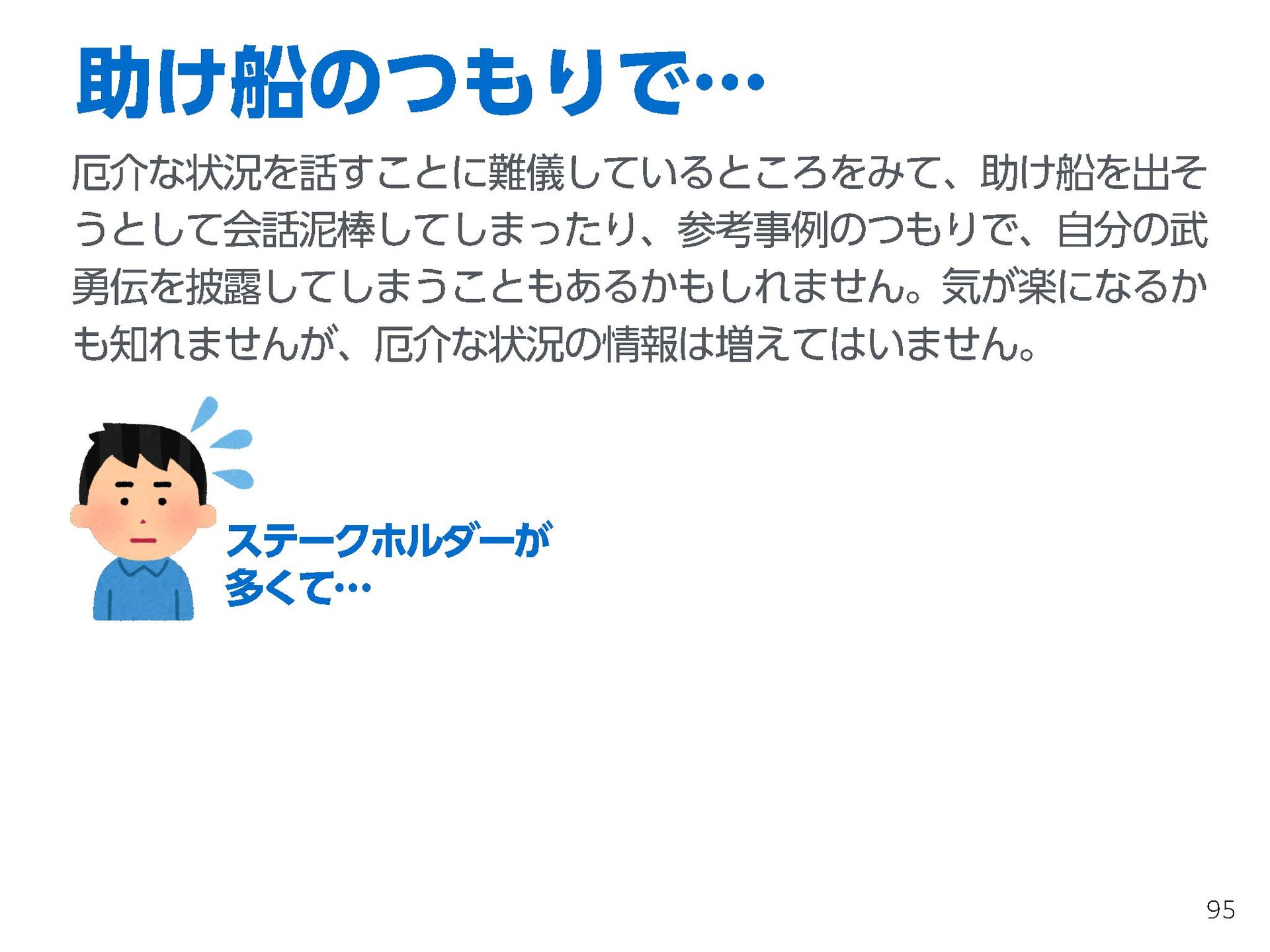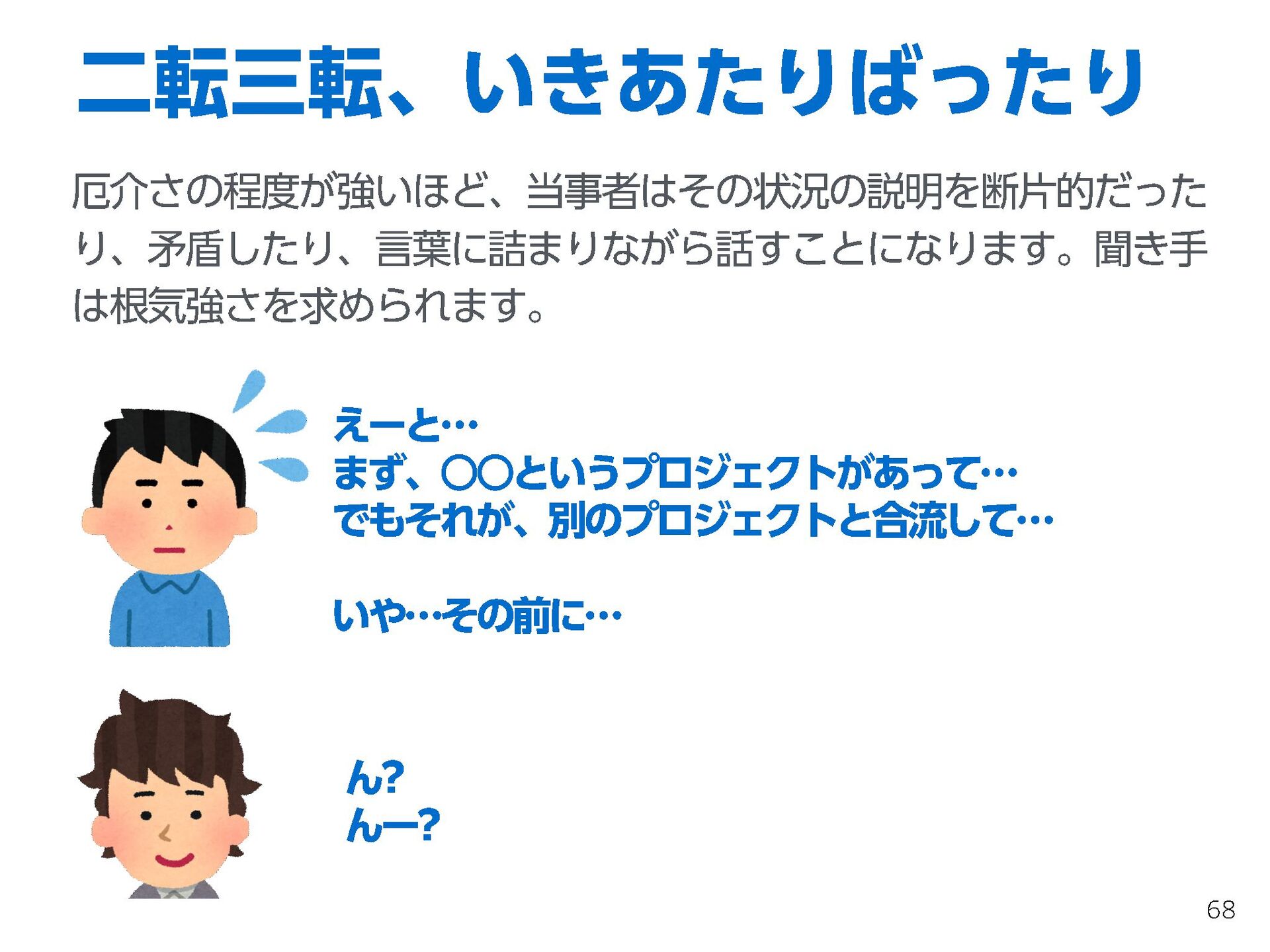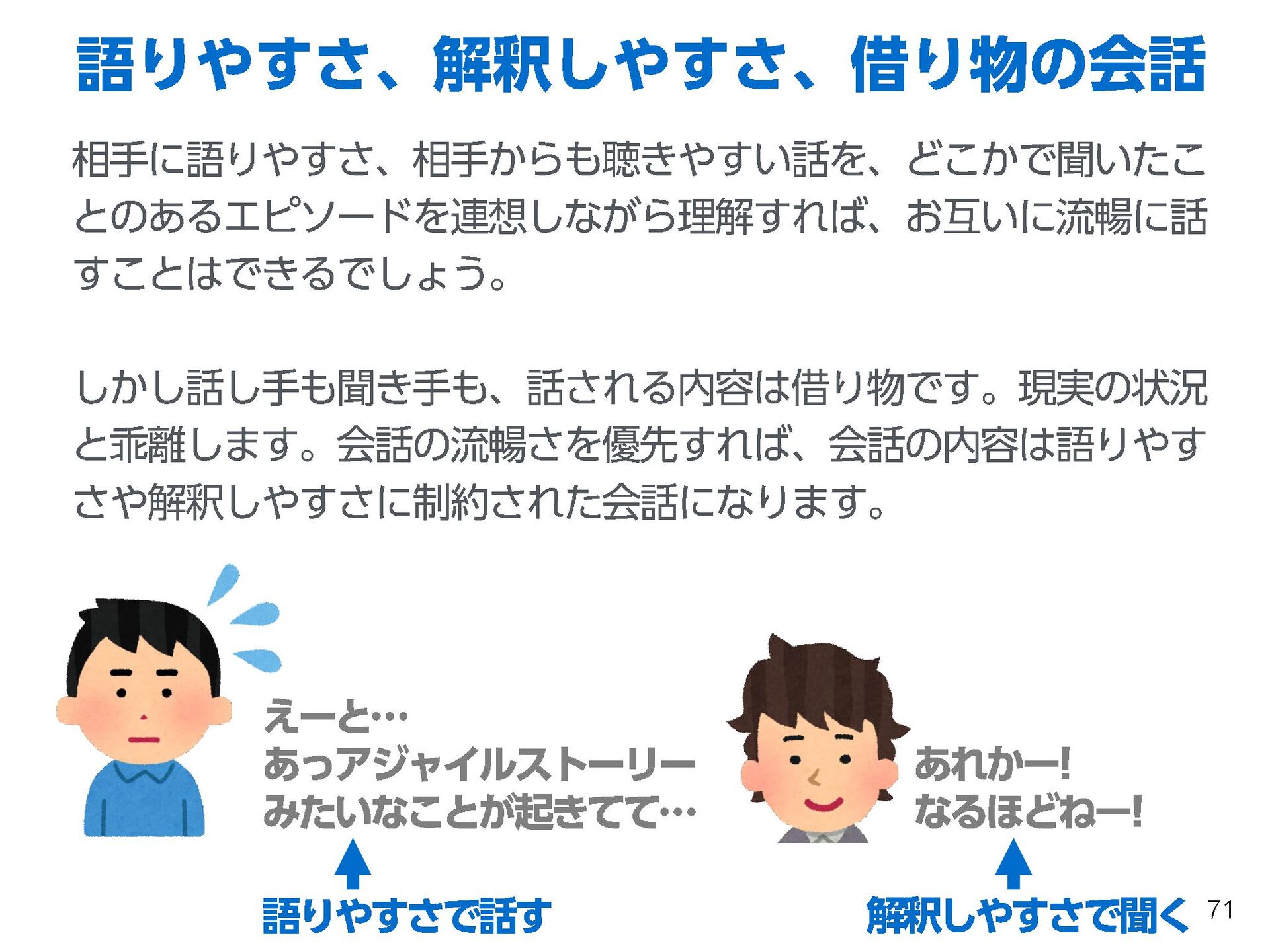 これらの活動の中で、私自身が劇的と感じる体験が何度もあり、自分の考えやふるまいを見直す結果に繋がりました。この体験は問題解決の書籍を学ぶことよりも、自分にとって大きな衝撃となり、強く興味を持つようになりました。それ以後、自主開催も行い、当事者にとって劇的なアウトカムを再現する試みを行ってきました。