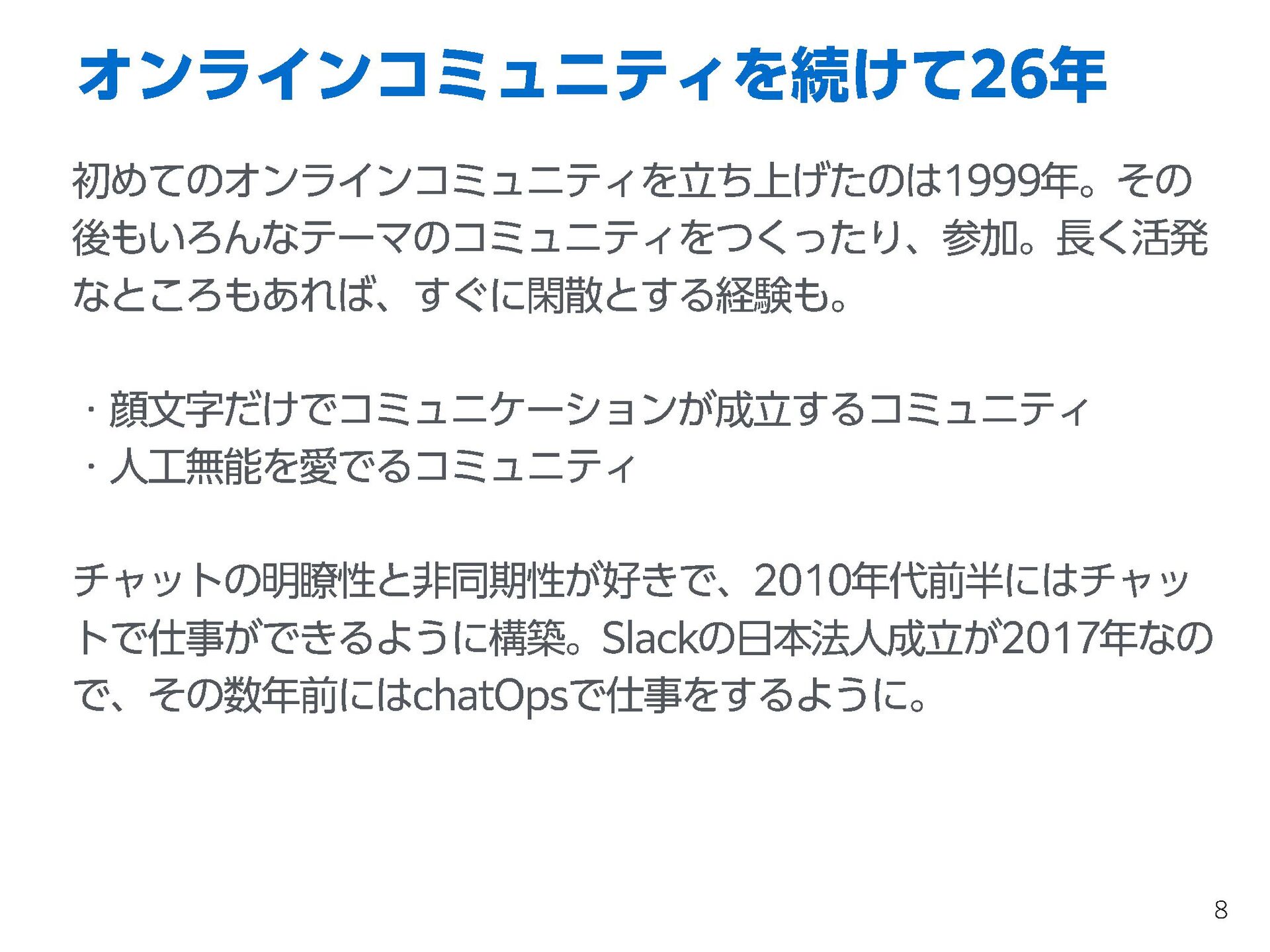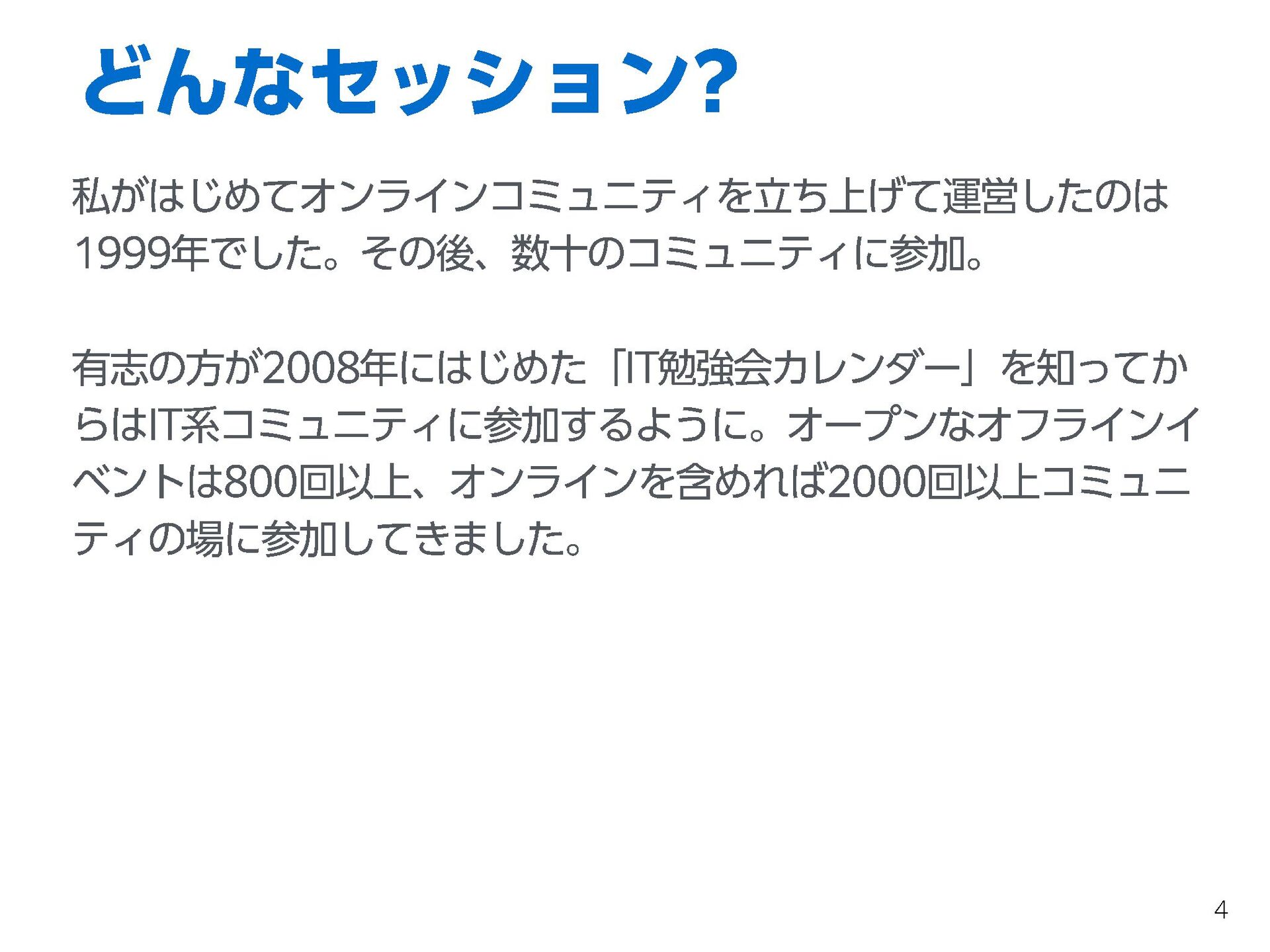 私がはじめてオンラインコミュニティを立ち上げて運営したのは1999年でした。その後、数十のコミュニティに参加しました。有志の方が2008年にはじめたIT勉強会カレンダーを知ってからはIT系コミュニティに、オープンなオフラインイベントは800回以上、オンラインを含めれば2000回以上コミュニティの場に参加してきました。