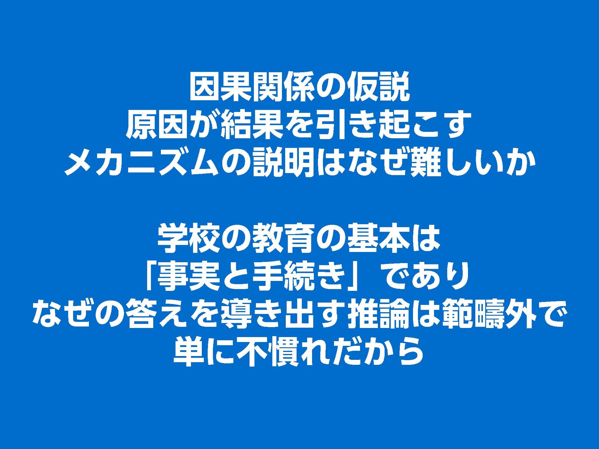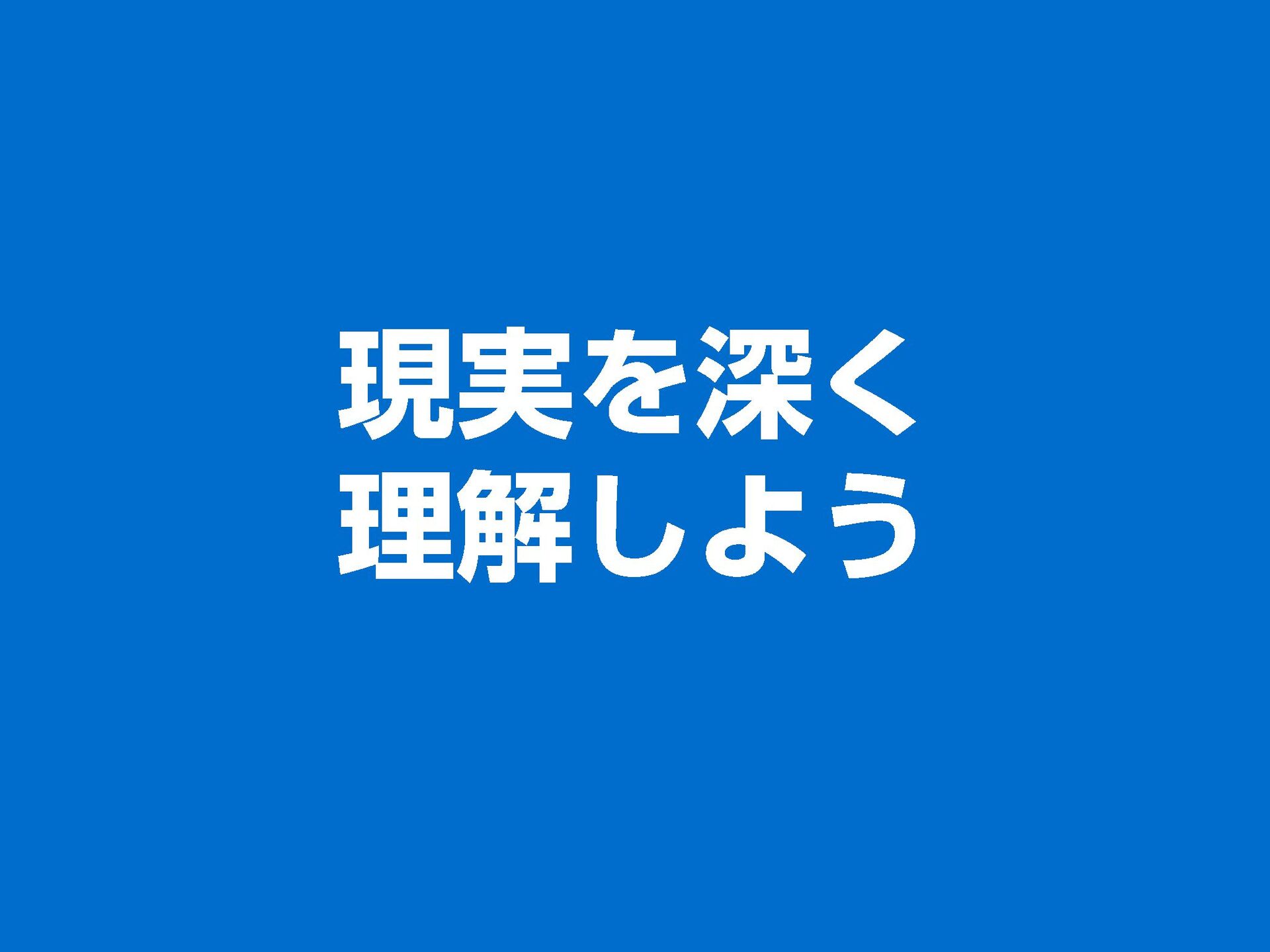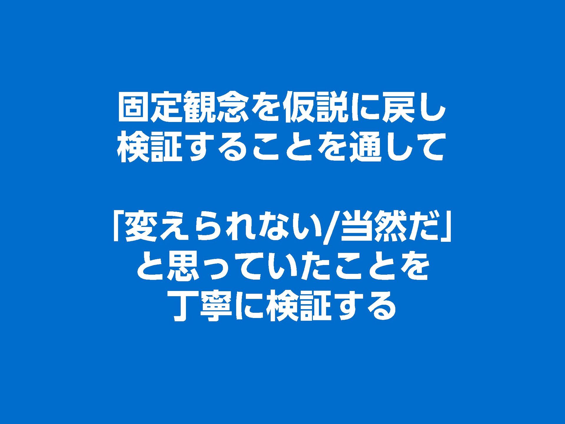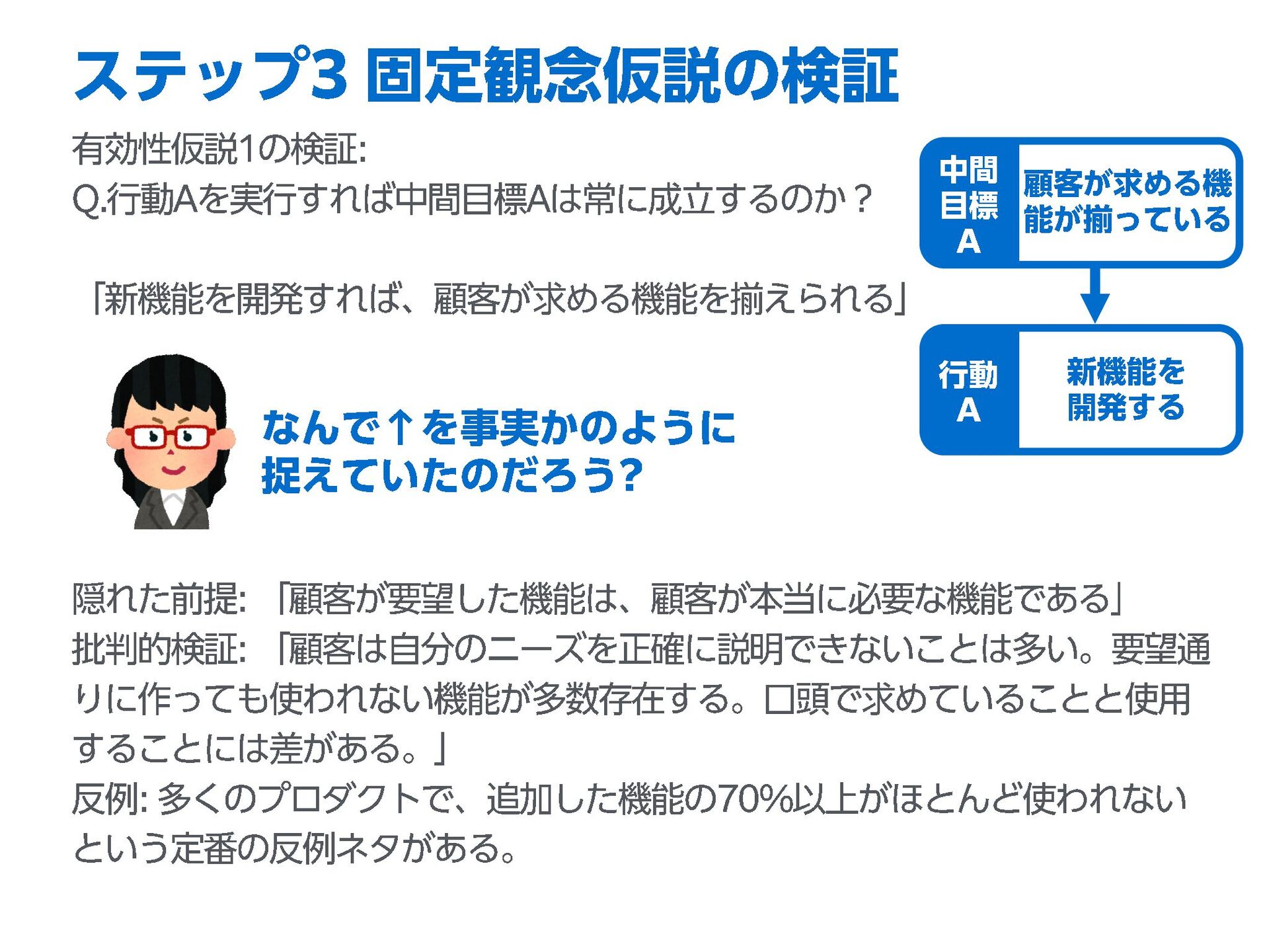 批判的検証 : 「顧客は自分のニーズを正確に説明できないことは多い。要望通 りに作っても使われない機能が多数存在する。口頭で求めていることと使用 することには差がある。」 反例: 多くのプロダクトで、追加した機能の 70% 以上がほとんど使われない という定番の反例ネタがある。 中間 目標 A 行動 A 新機能を 開発する 顧客が求める機 能が揃っている なんで ↑を事実かのように 捉えていたのだろう ?