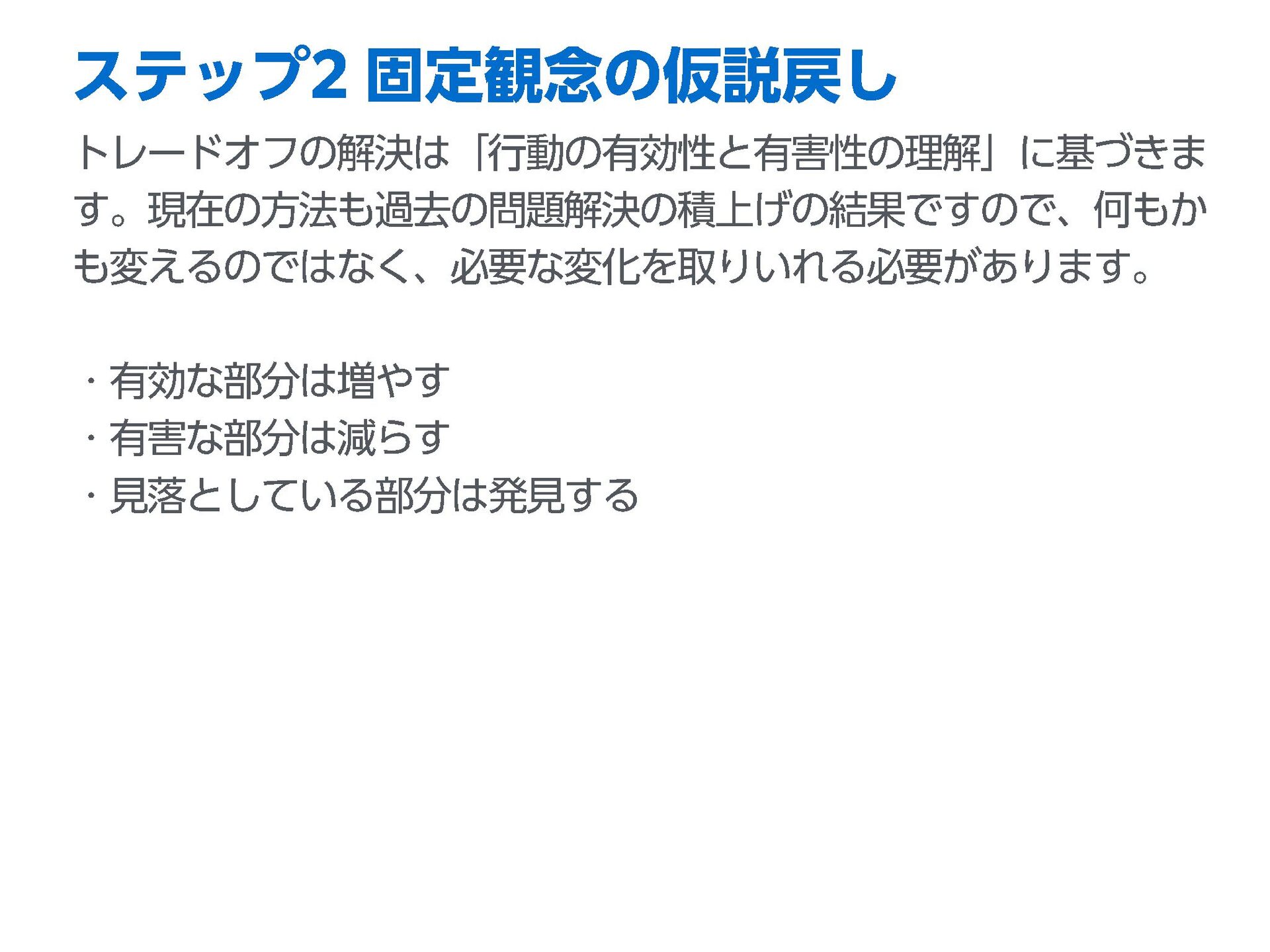 ・制約 /不変制約/有限性/不可逆性/複雑性(相互依存性/多主体性) トレードオフの解決 Lv2: 構造で解決 トレードオフはそもそもなぜ発生するのか ? トレードオフに集中する価値 トレードオフの解決 Lv3: 固有の状況で新しい工夫を発見する ・ステップ 1 トレードオフの構造化 ・ステップ 2 固定観念の仮説戻し ・ステップ 3 固定観念の検証 ・コンテキストを再結集させて全両立する組織へ 238