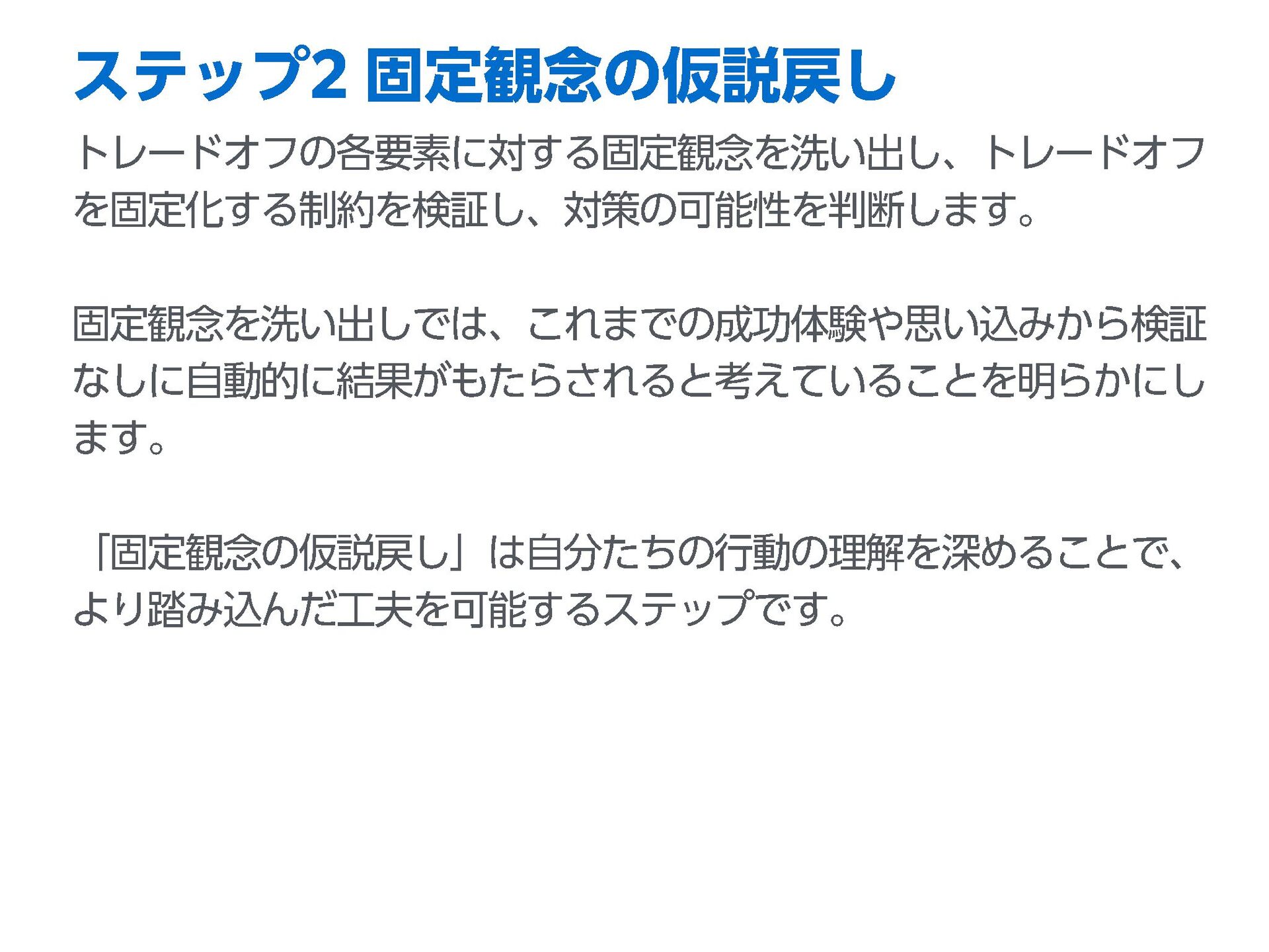 89. トレードオフの解決 Lv3 ここからはトレードオフを解消していくための 、 「 工夫の過程」 を 一部分ですがお伝えします。自分たちが持つ固定観念を「検証可能 な仮説」に戻し、新しいアプローチを見出す方法です。 3つのステップ