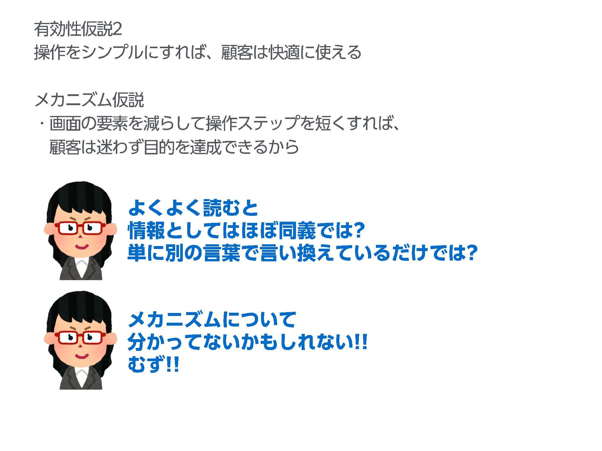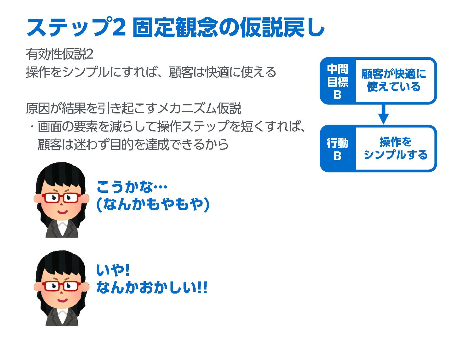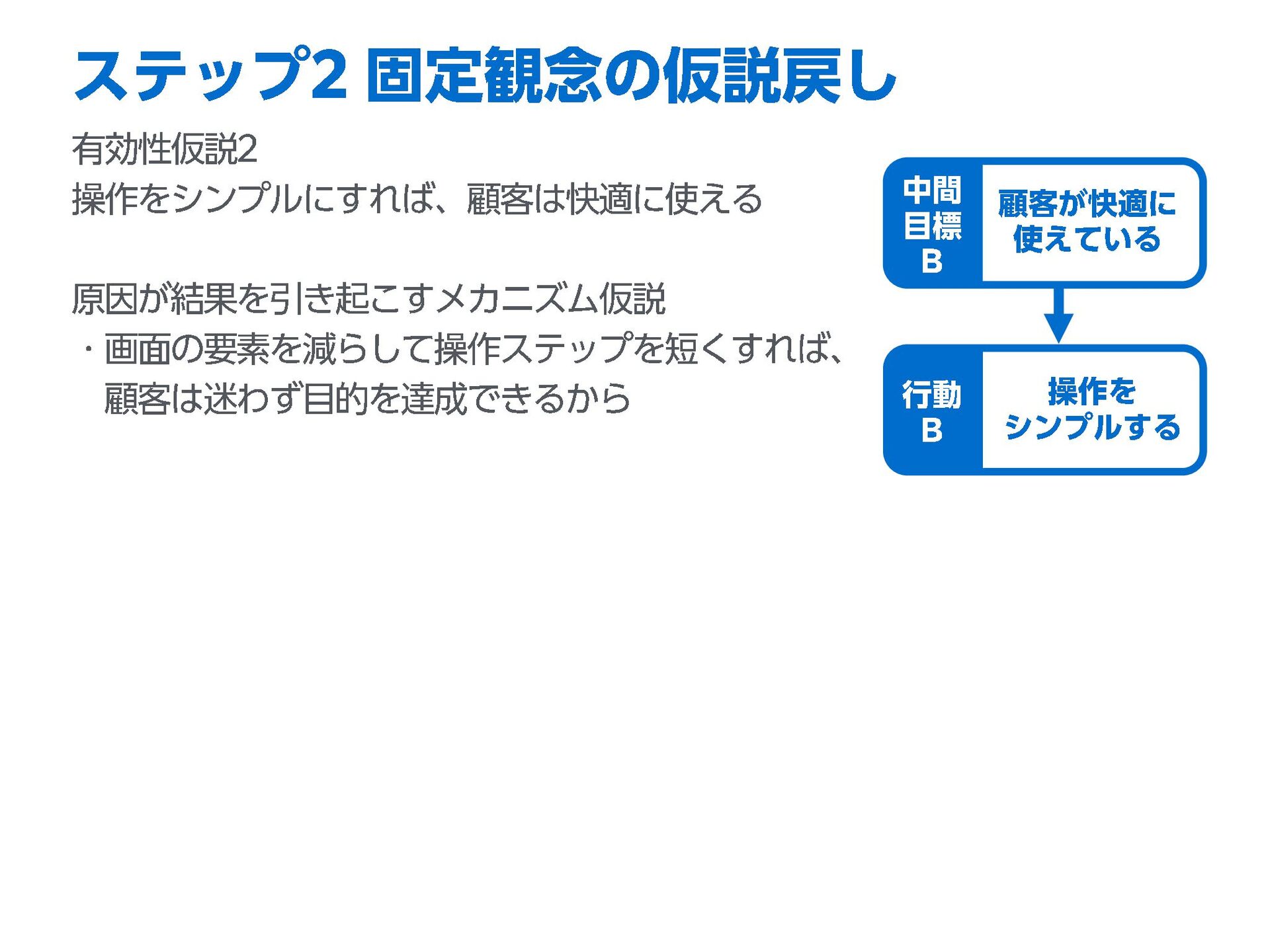 110. ステップ 2 固定観念の仮説戻し 有効性仮説 2 操作をシンプルにすれば、顧客は快適に使える 修正前のメカニズム仮説 ・画面の要素を減らして操作ステップを短くすれば、 顧客は迷わず目的を達成できるから 修正したメカニズム仮説