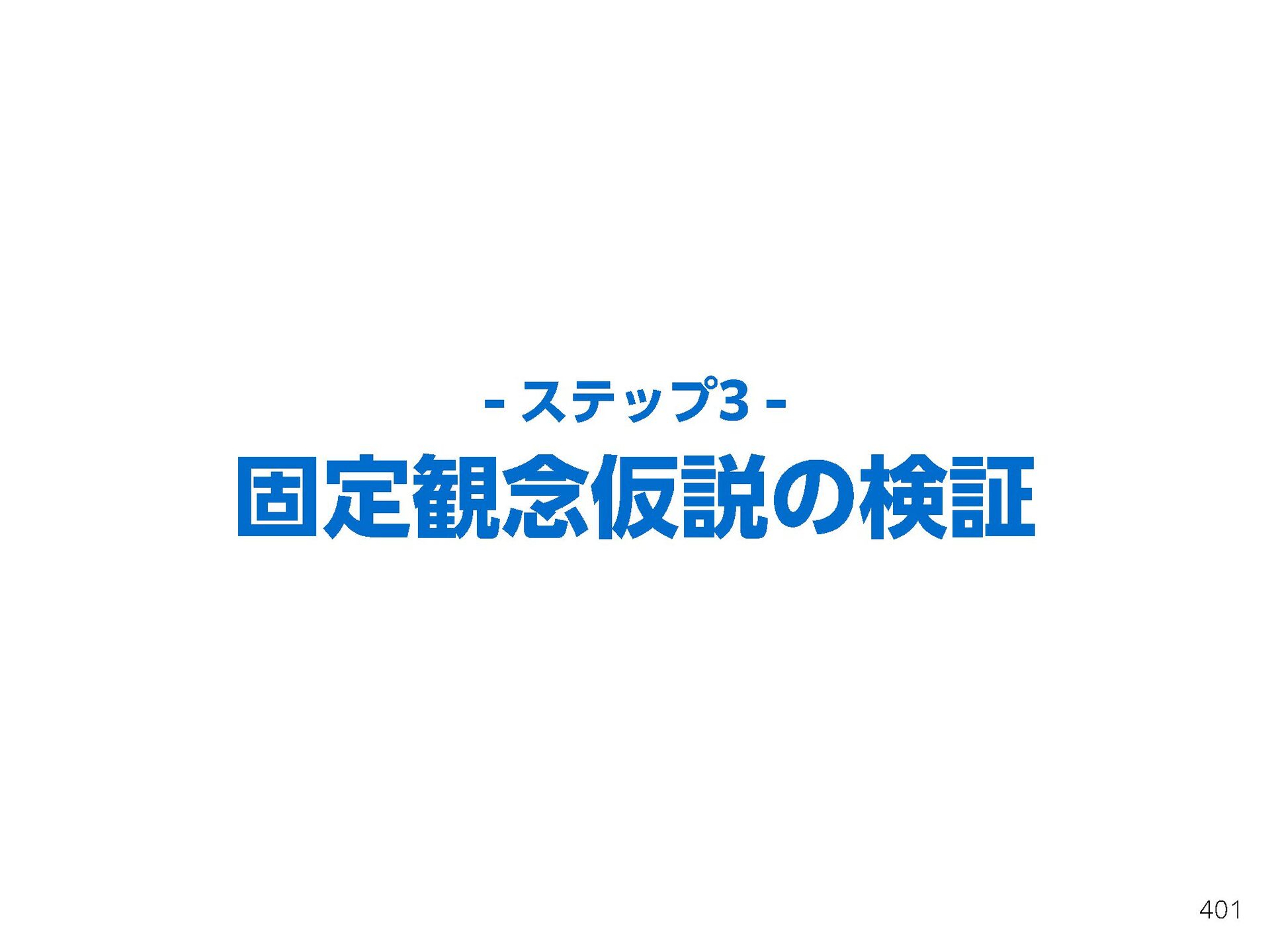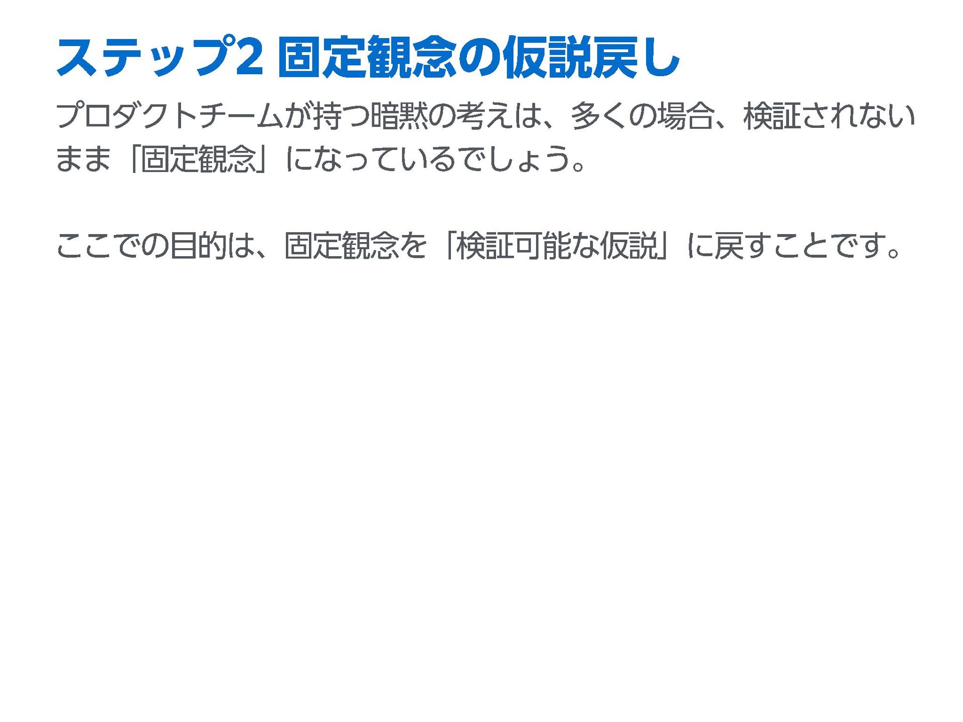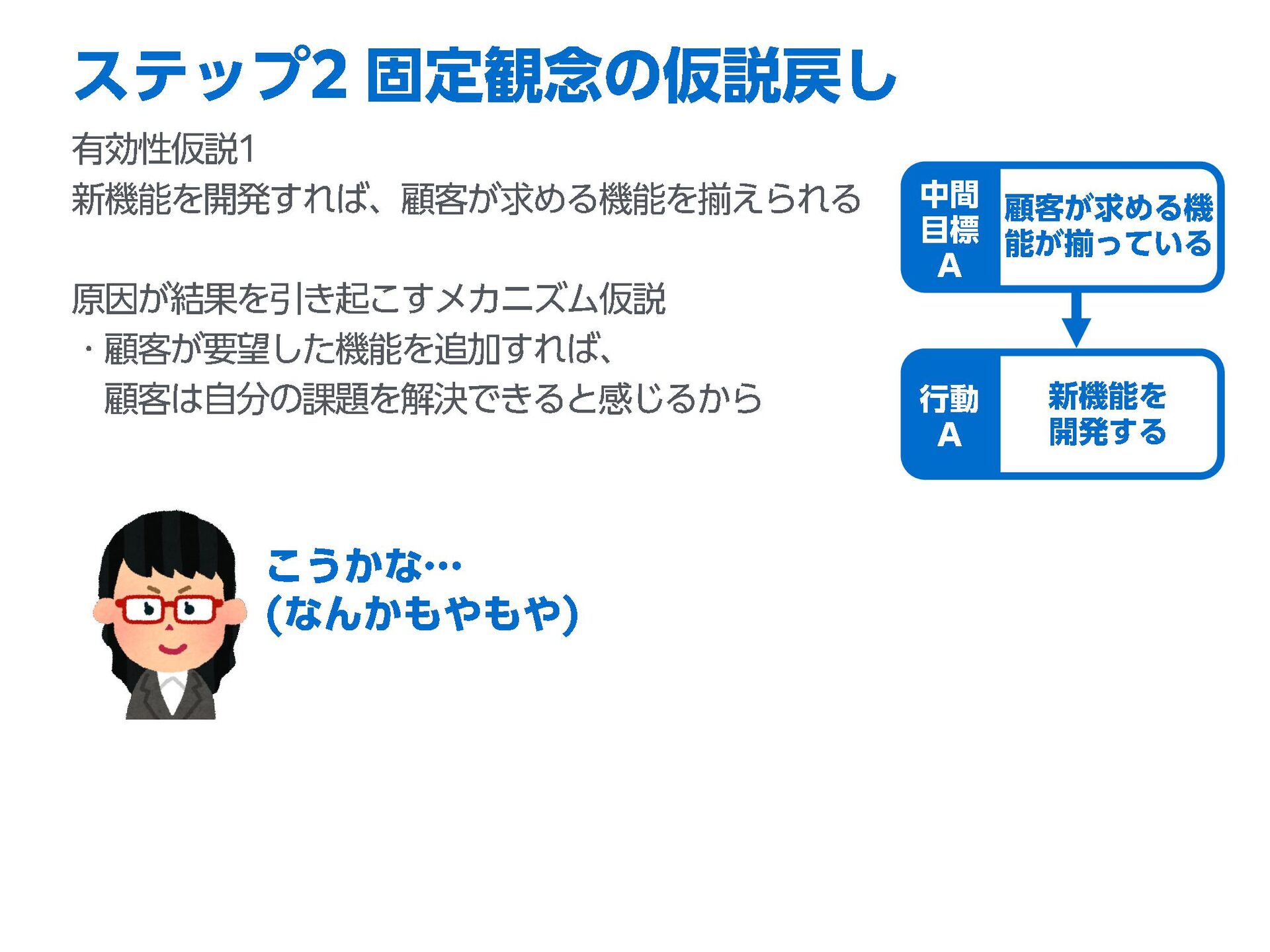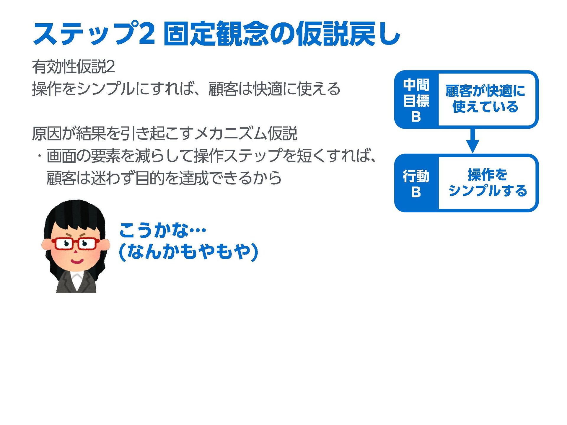 110. ステップ 2 固定観念の仮説戻し 有効性仮説 2 操作をシンプルにすれば、顧客は快適に使える 修正前のメカニズム仮説 ・画面の要素を減らして操作ステップを短くすれば、 顧客は迷わず目的を達成できるから 修正したメカニズム仮説