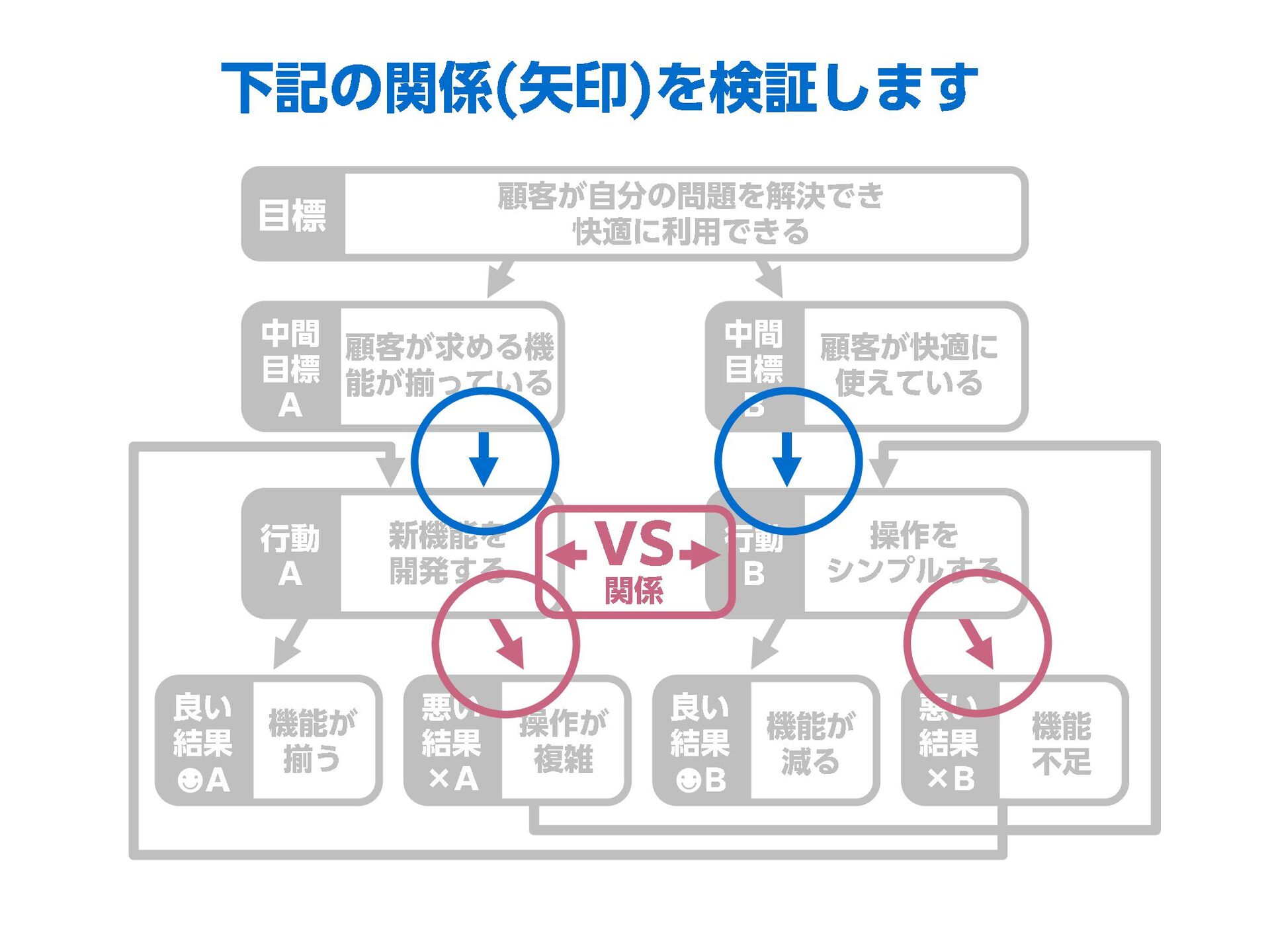 A 行動 B 新機能を 開発する 悪い 結果 ×A 悪い 結果 ×B 顧客が求める機 能が揃っている 顧客が快適に 使えている 操作を シンプルする 操作が 複雑 機能 不足 良い 結果 ☻A 良い 結果 ☻B 機能が 揃う 機能が 減る 下記の関係( 矢印) を検証します VS 関係