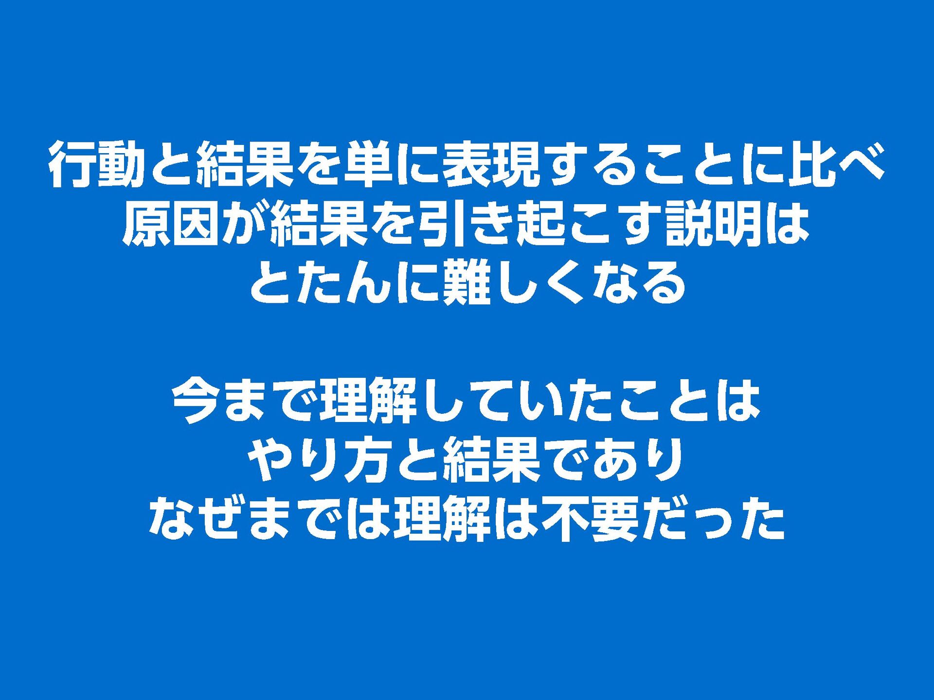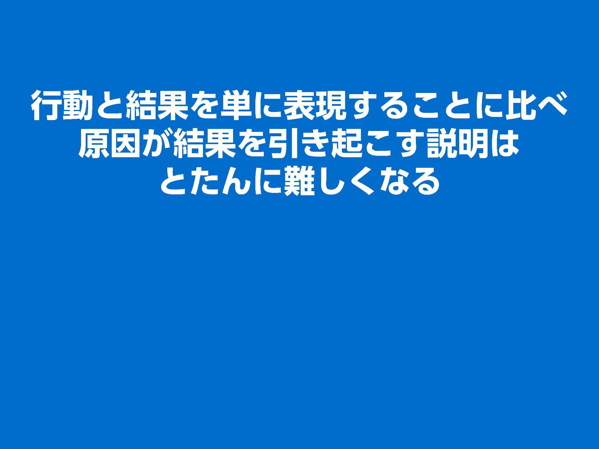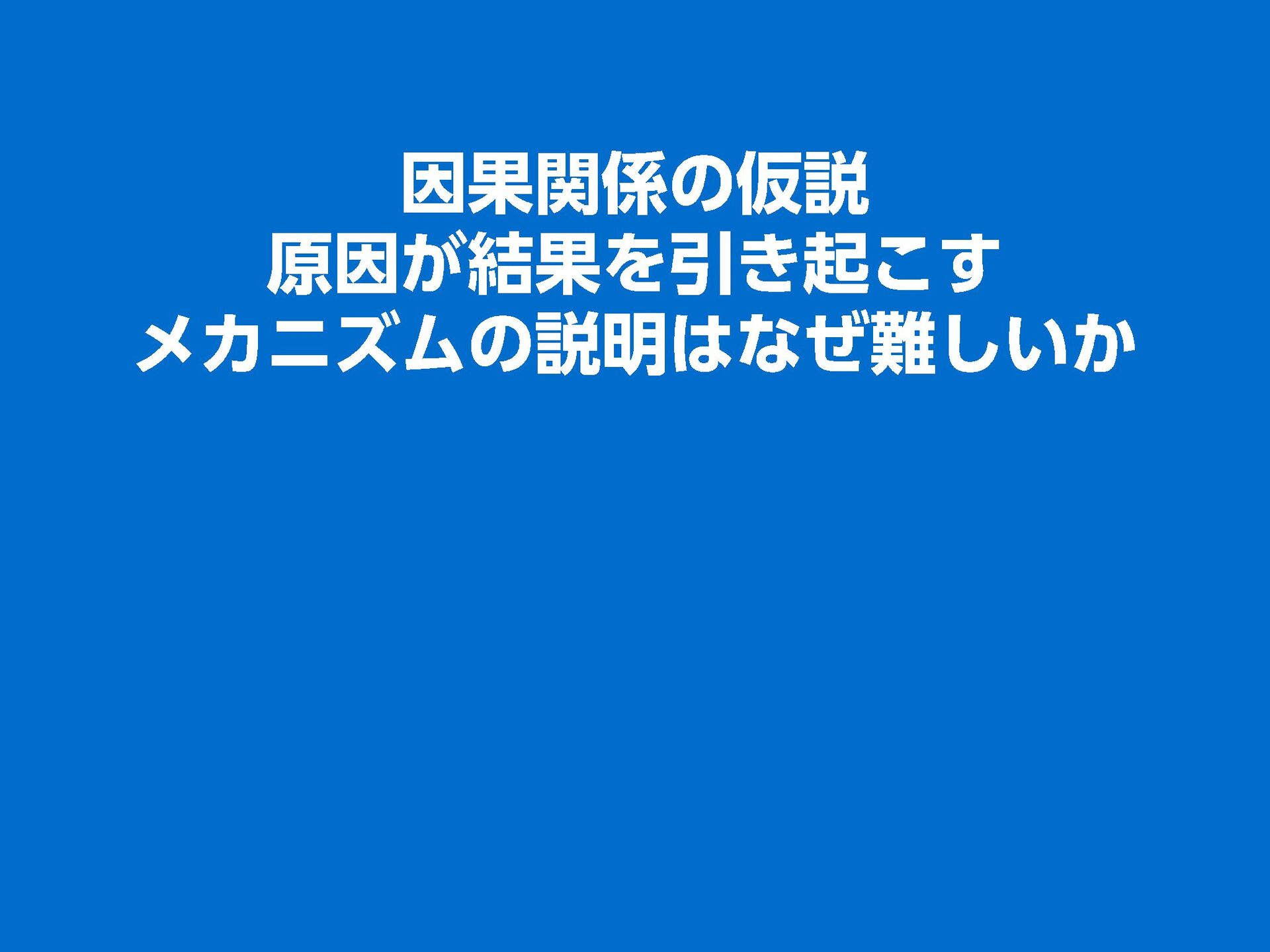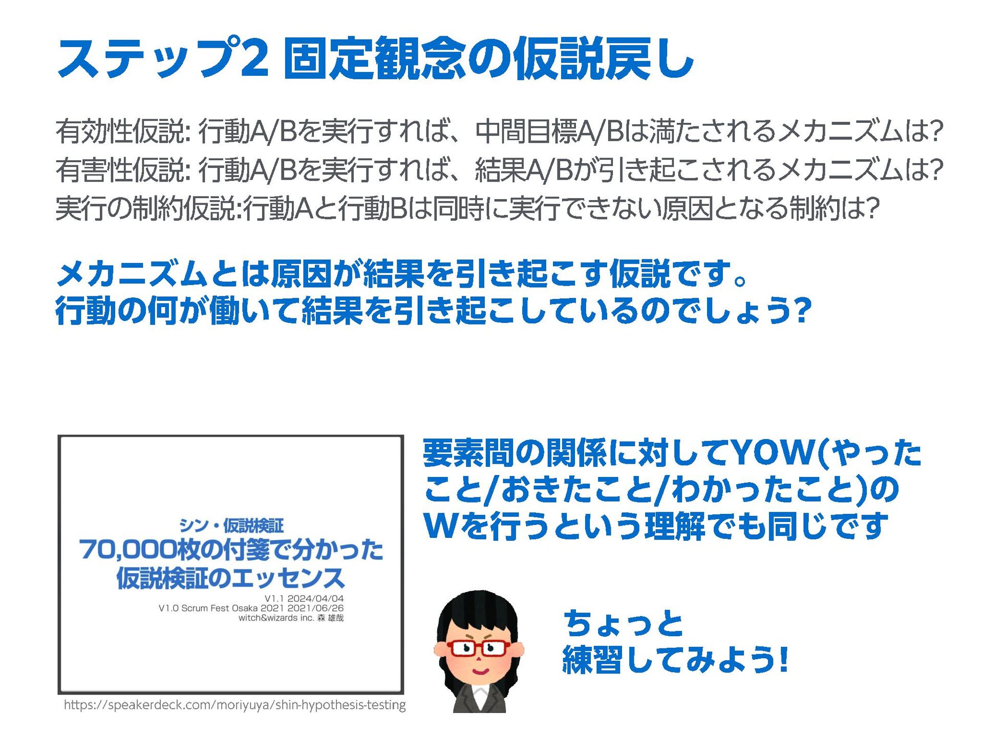 ? 実行の制約仮説 :行動Aと行動Bは同時に実行できない原因となる制約は? メカニズムとは原因が結果を引き起こす仮説です。 行動の何が働いて結果を引き起こしているのでしょう ? https://speakerdeck.com/moriyuya/shin -hypothesis -testing 要素間の関係に対して YOW( やった こと /おきたこと /わかったこと ) の W を行うという理解でも同じです ちょっと 練習してみよう !