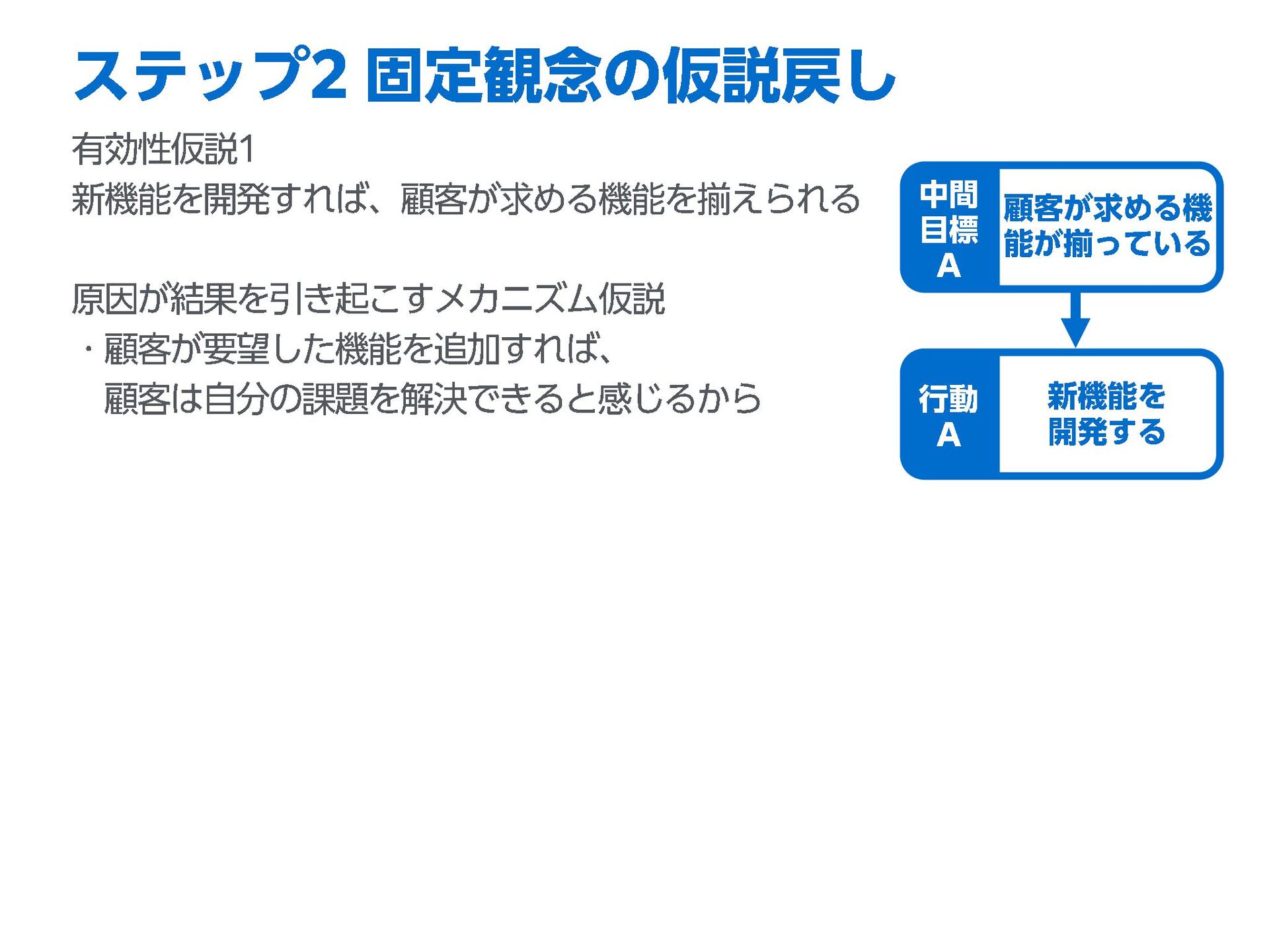 116. ステップ 3 固定観念仮説の検証 有効性仮説 1の検証: Q.行動Aを実行すれば中間目標 Aは常に成立するのか? 「新機能を開発すれば、顧客が求める機能を揃えられる」 隠れた前提: 「顧客が要望した機能は、顧客が本当に必要な機能である」