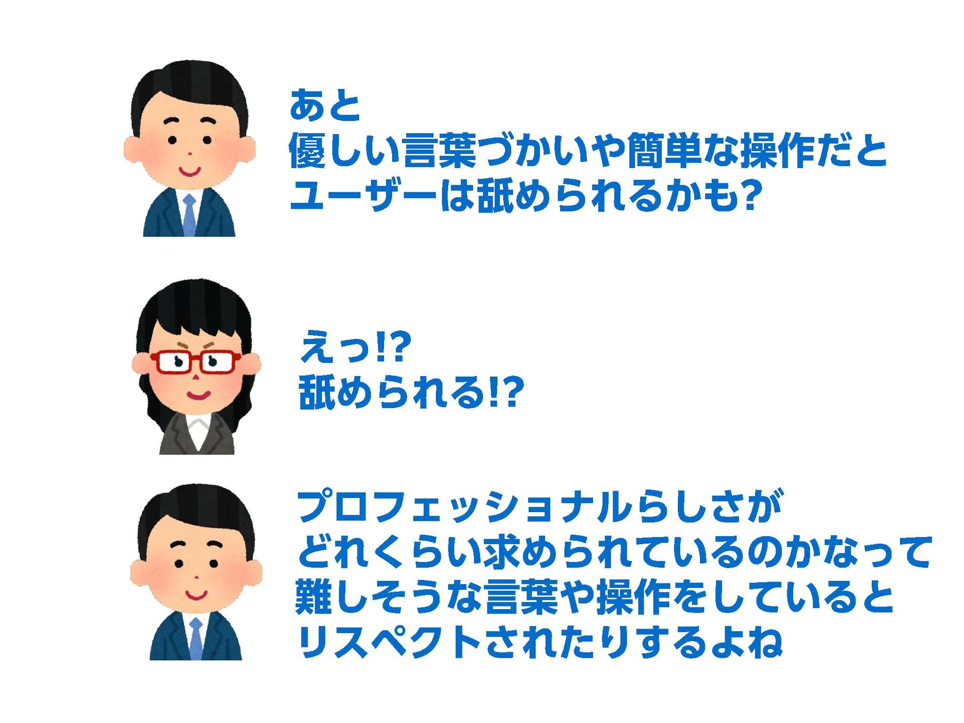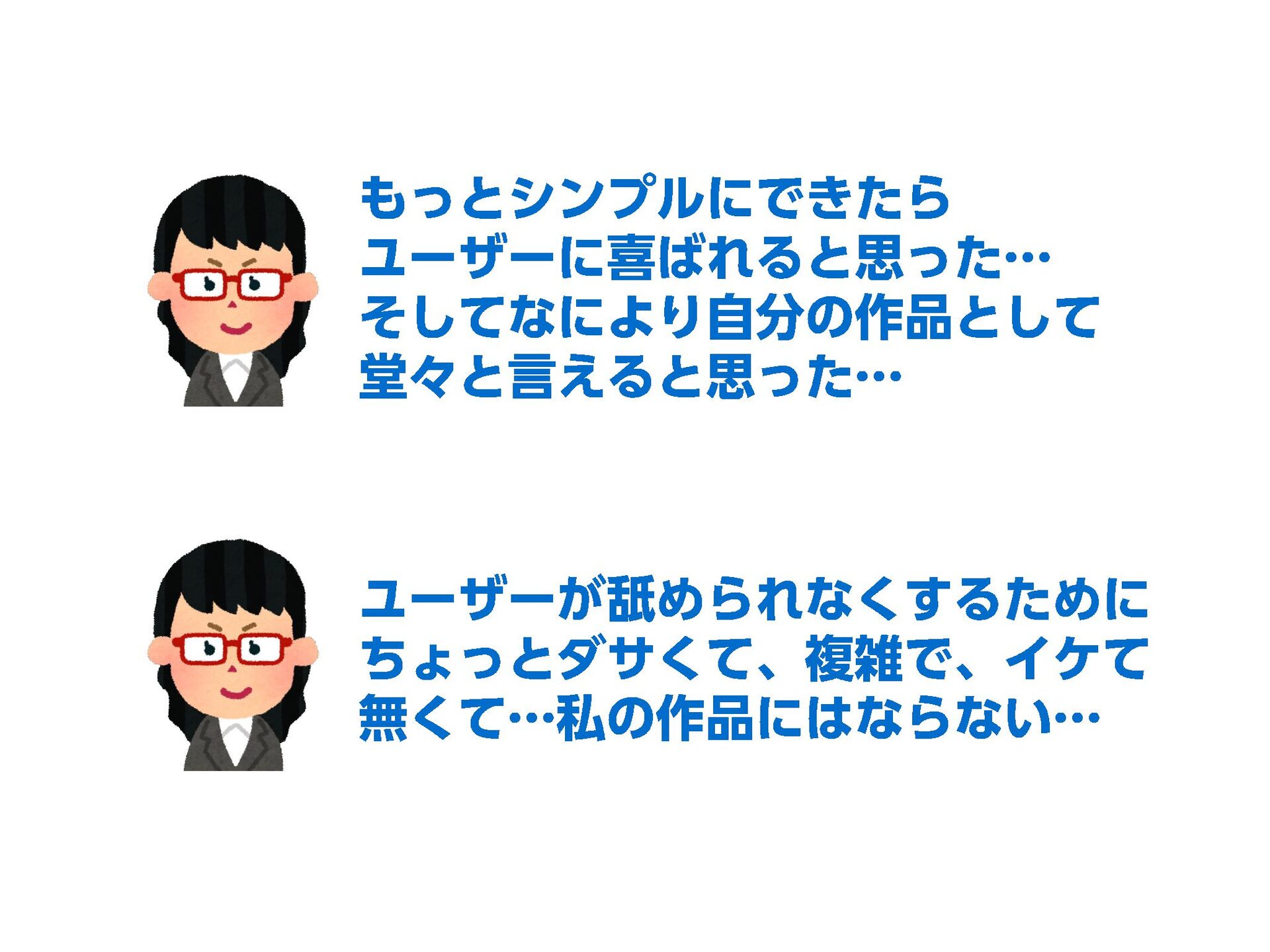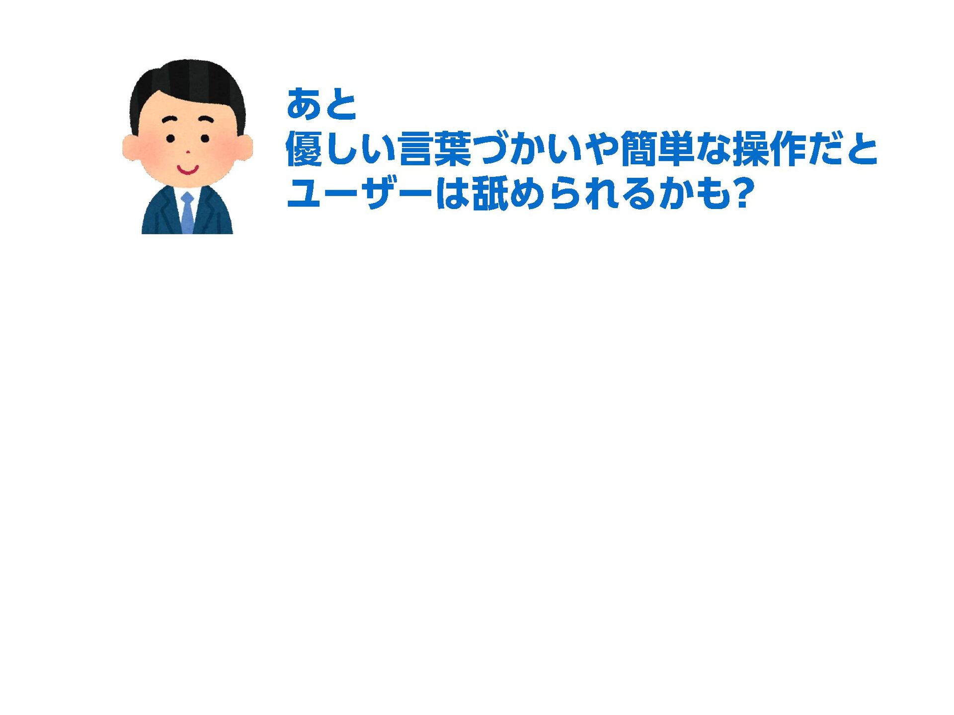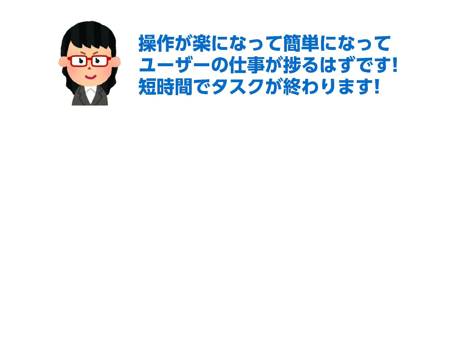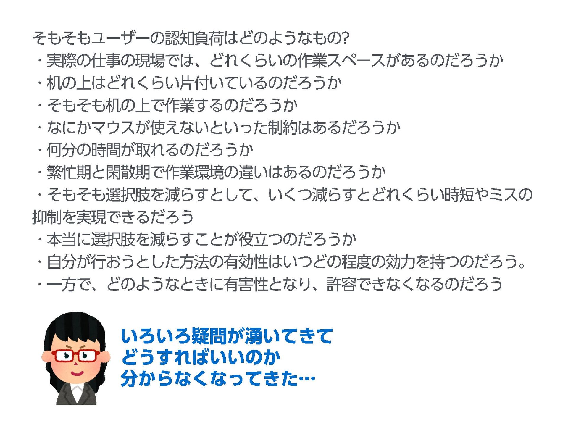 ・現在は機能が多く、顧客の認知負荷が高い状態の中で仕事をしておりミス がたびたび発生している。選択肢を減らすことでより少ない認知負荷と時間 で、ミスを減らしつつ操作を完了することができるようになるから。 中間 目標 B 行動 B 顧客が快適に 使えている 操作を シンプルする