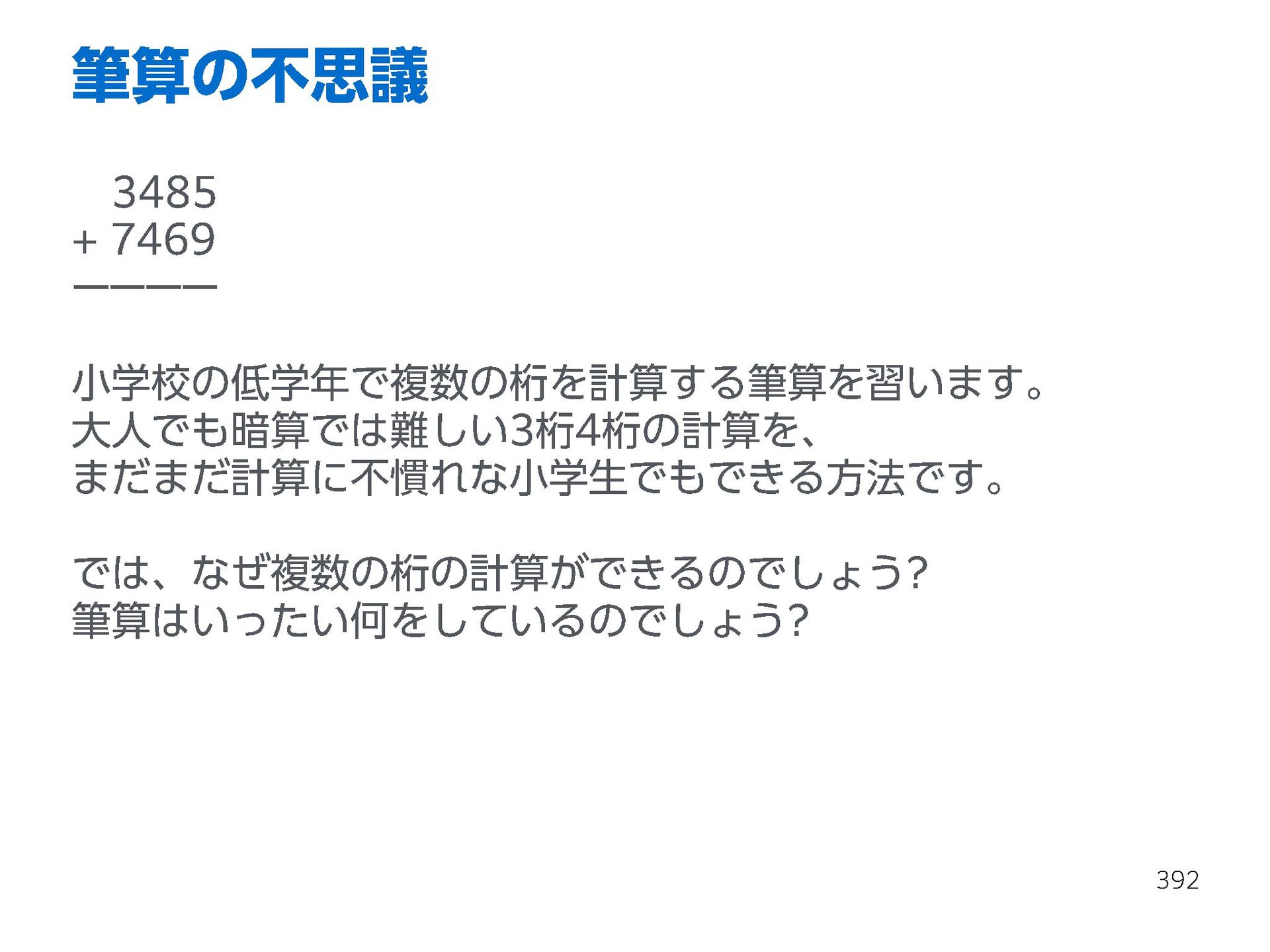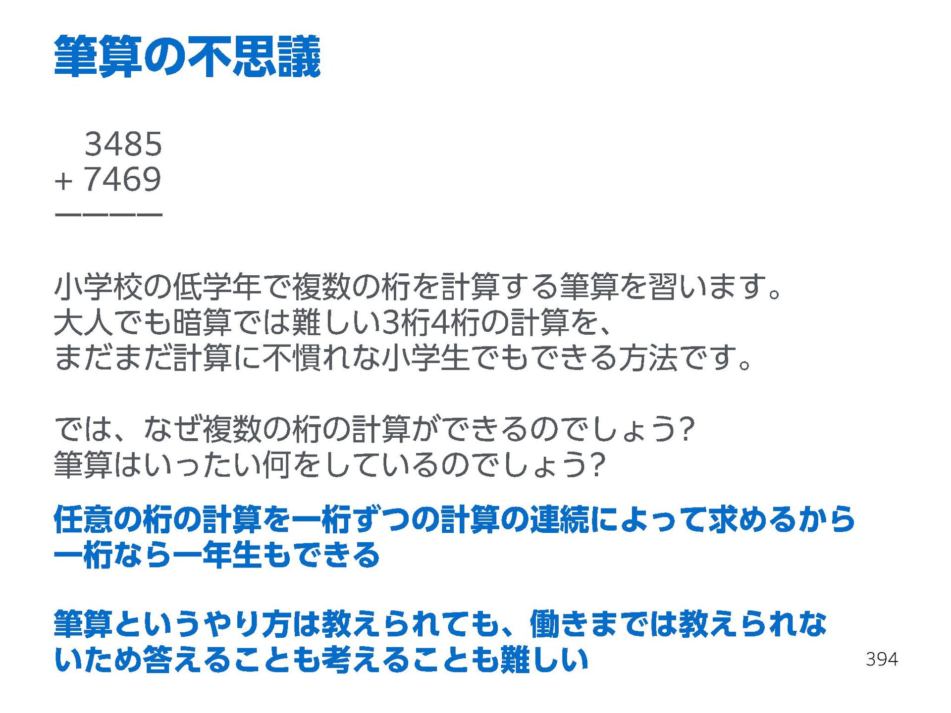 まだまだ 計算に不慣れな小学生でもできる方法です。 では、なぜ複数の桁の計算が できるのでしょう ? 筆算はいったい何をして いるのでしょう ? 394 筆算の不思議 任意の桁の計算を一桁ずつの計算の連続によって求めるから 一桁なら一年生もできる 筆算というやり方は教えられても、働きまでは教えられな いため答えることも考えることも難しい