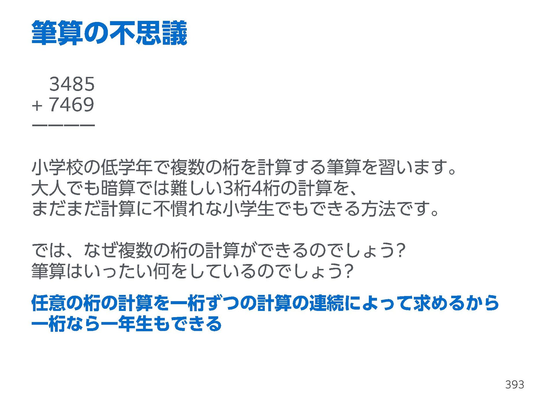 まだまだ 計算に不慣れな小学生でもできる方法です。 では、なぜ複数の桁の計算が できるのでしょう ? 筆算はいったい何をして いるのでしょう ? 393 筆算の不思議 任意の桁の計算を一桁ずつの計算の連続によって求めるから 一桁なら一年生もできる