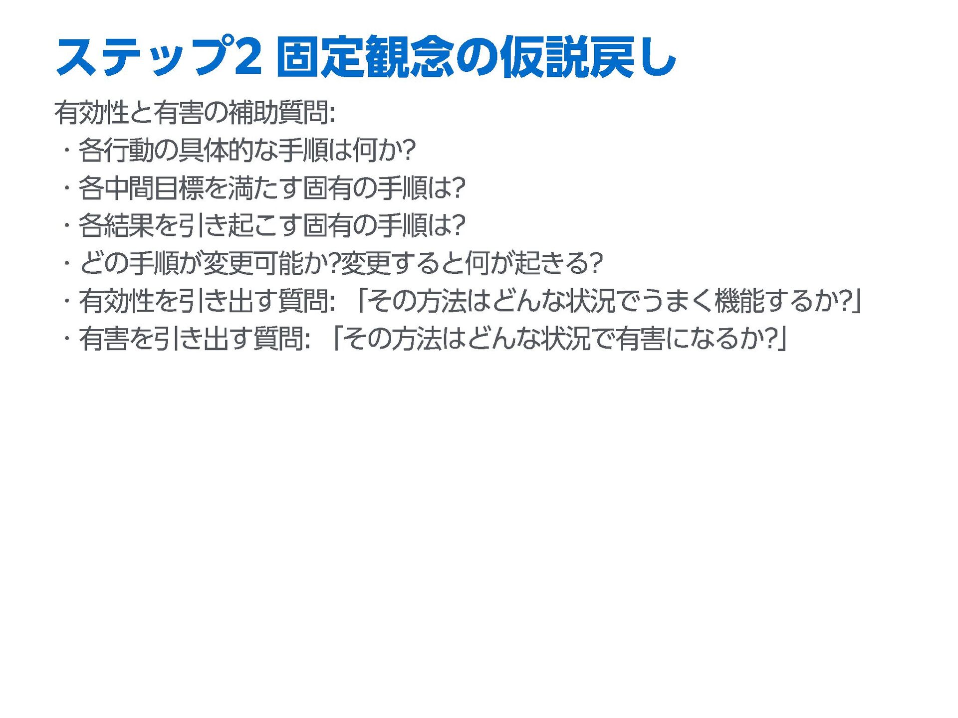 114. ステップ 2 固定観念の仮説戻し 有効性と有害の補助質問 : ・各行動の具体的な手順は何か? ・各中間目標を満たす固有の手順は? ・各結果を引き起こす固有の手順は ? ・どの手順が変更可能か?変更すると何が起きる