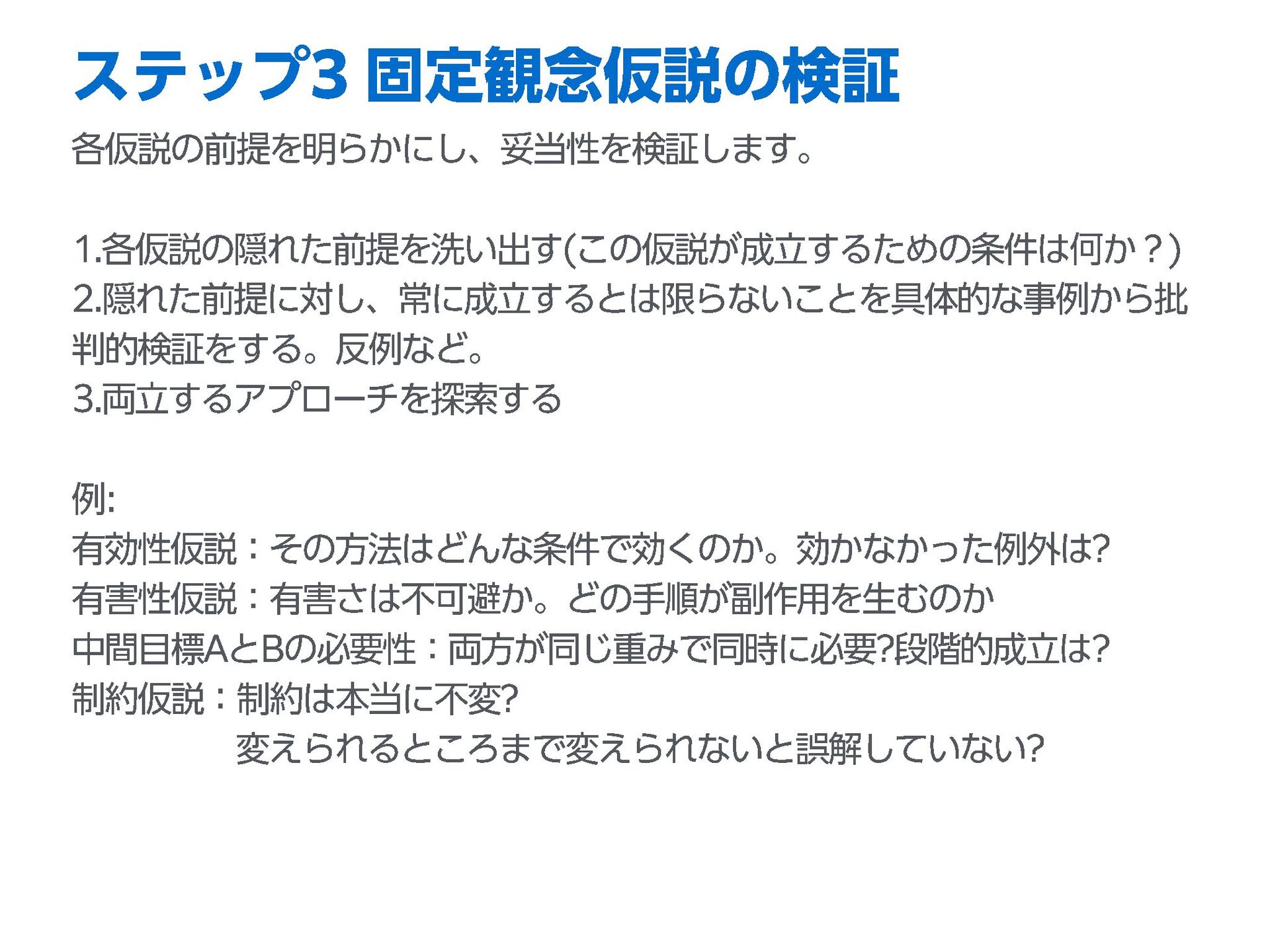 判的検証をする。反例など。 3. 両立するアプローチを探索する 例: 有効性仮説:その方法はどんな条件で効くのか。効かなかった例外は ? 有害性仮説:有害さは不可避か。どの手順が副作用を生むのか 中間目標 Aと Bの必要性:両方が同じ重みで同時に必要?段階的成立は ? 制約仮説:制約は本当に不変? 変えられるところまで変えられないと誤解していない ?