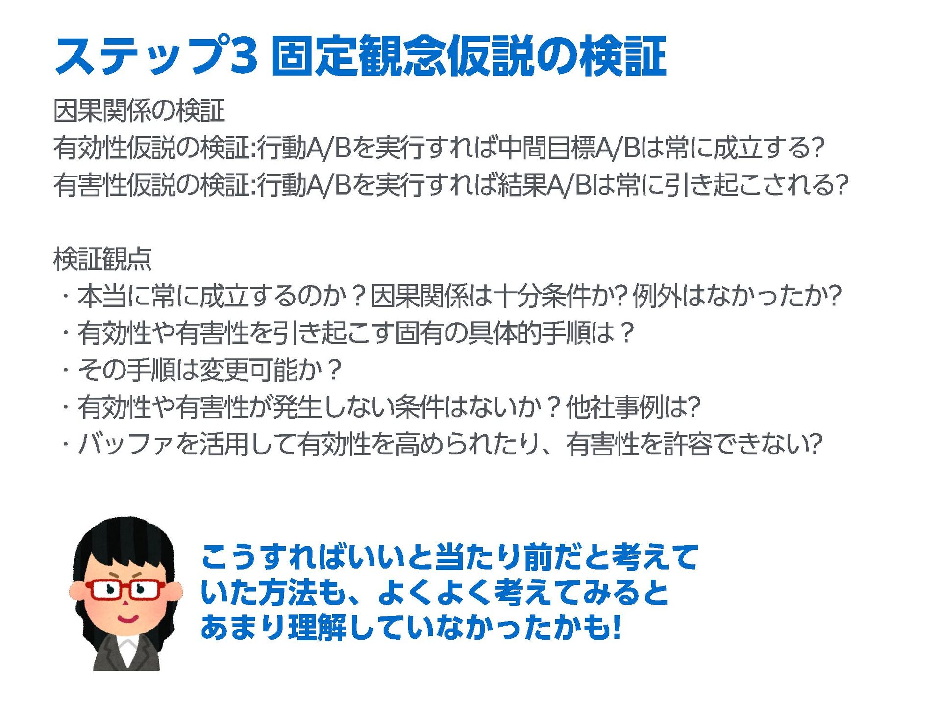 ? 検証観点 ・本当に常に成立するのか?因果関係は十分条件か ? 例外はなかったか? ・有効性や有害性を引き起こす固有の具体的手順は? ・その手順は変更可能か? ・有効性や有害性が発生しない条件はないか?他社事例は ? ・バッファを活用して有効性を高められたり、有害性を許容できない ? こうすればいいと当たり前だと考えて いた方法も、よくよく考えてみると あまり理解していなかったかも !