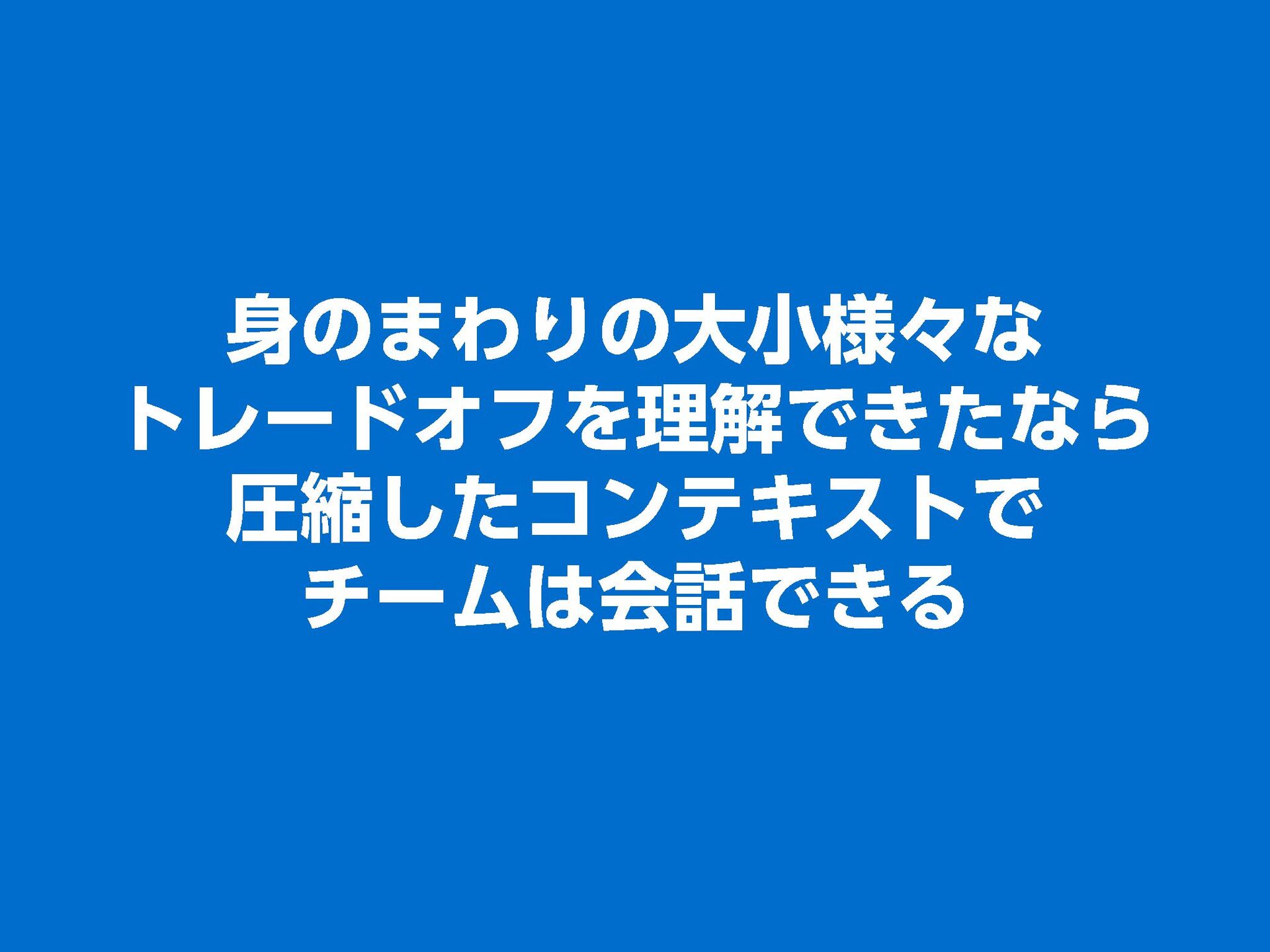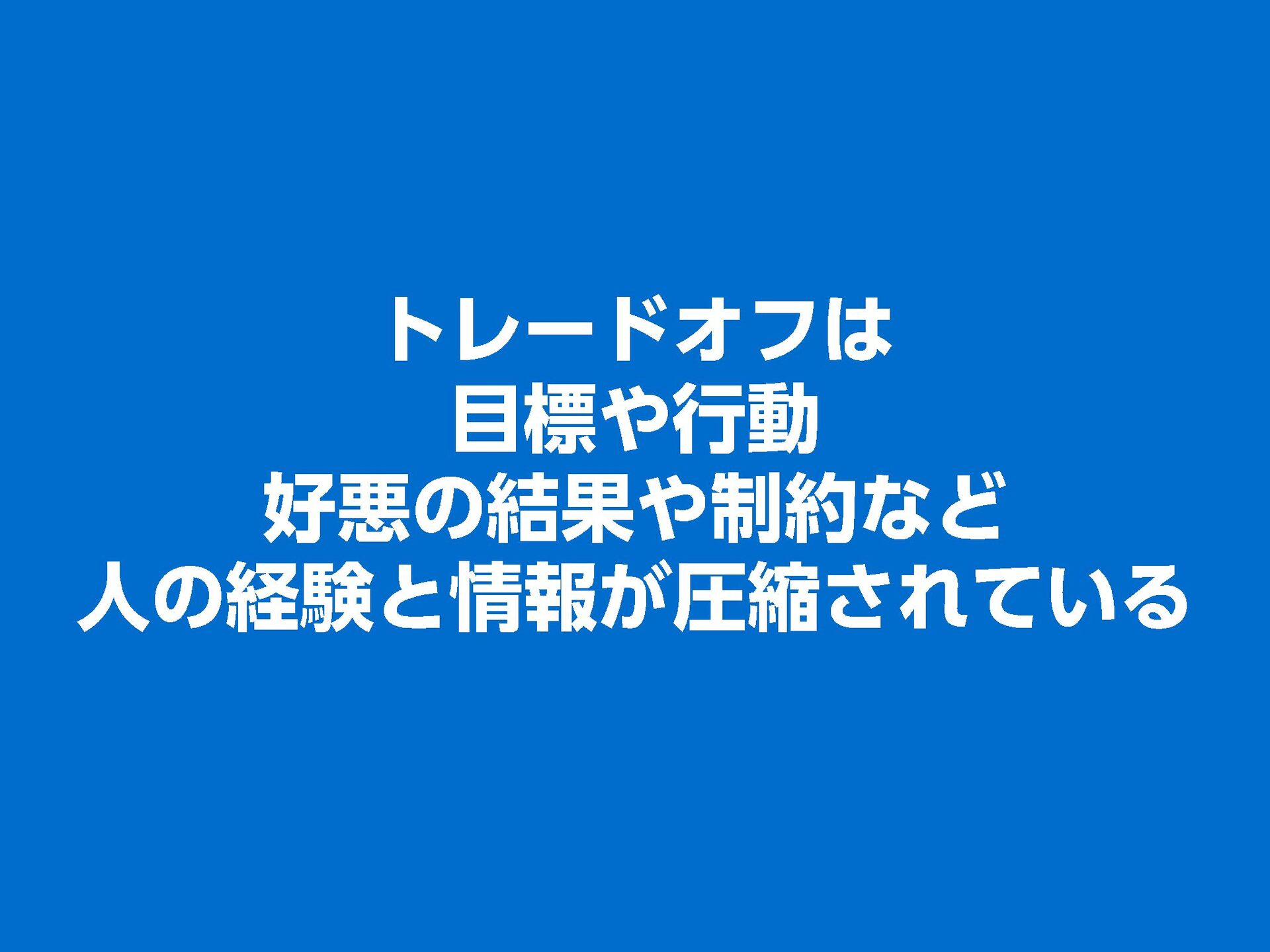 るのならば パフォーマンスは大きく改善できるでしょう。 このセッションでは、プロダクト開発において避けられないトレー ドオフ問題を構造的に扱うための理解と実践方法を説明します。 トレードオフを、どちらか妥協して選ぶ「選択の問題」ではなく 「両立させる問題」にしていきましょう ! やっていこう !