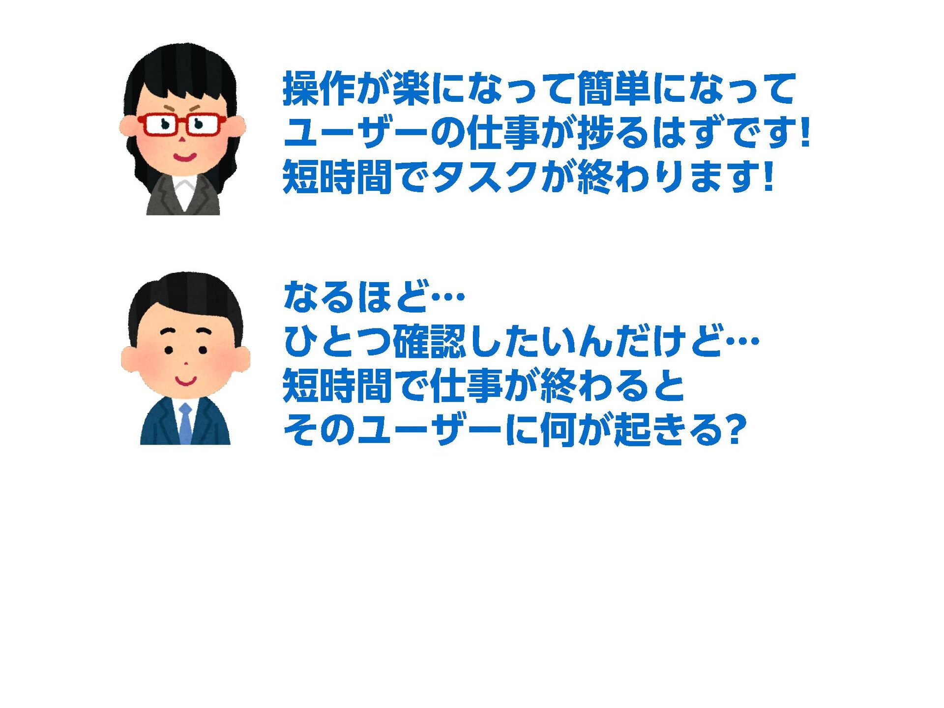 ・現在は機能が多く、顧客の認知負荷が高い状態の中で仕事をしておりミス がたびたび発生している。選択肢を減らすことでより少ない認知負荷と時間 で、ミスを減らしつつ操作を完了することができるようになるから。 ちょっとはマシになった !? いやでも …そもそも「顧客は快適に使える」の快適 も気になってきた !! 少ない認知負荷と時間と少ない ミスは「快適」に達しているの ? 中間 目標 B 行動 B 顧客が快適に 使えている 操作を シンプルする