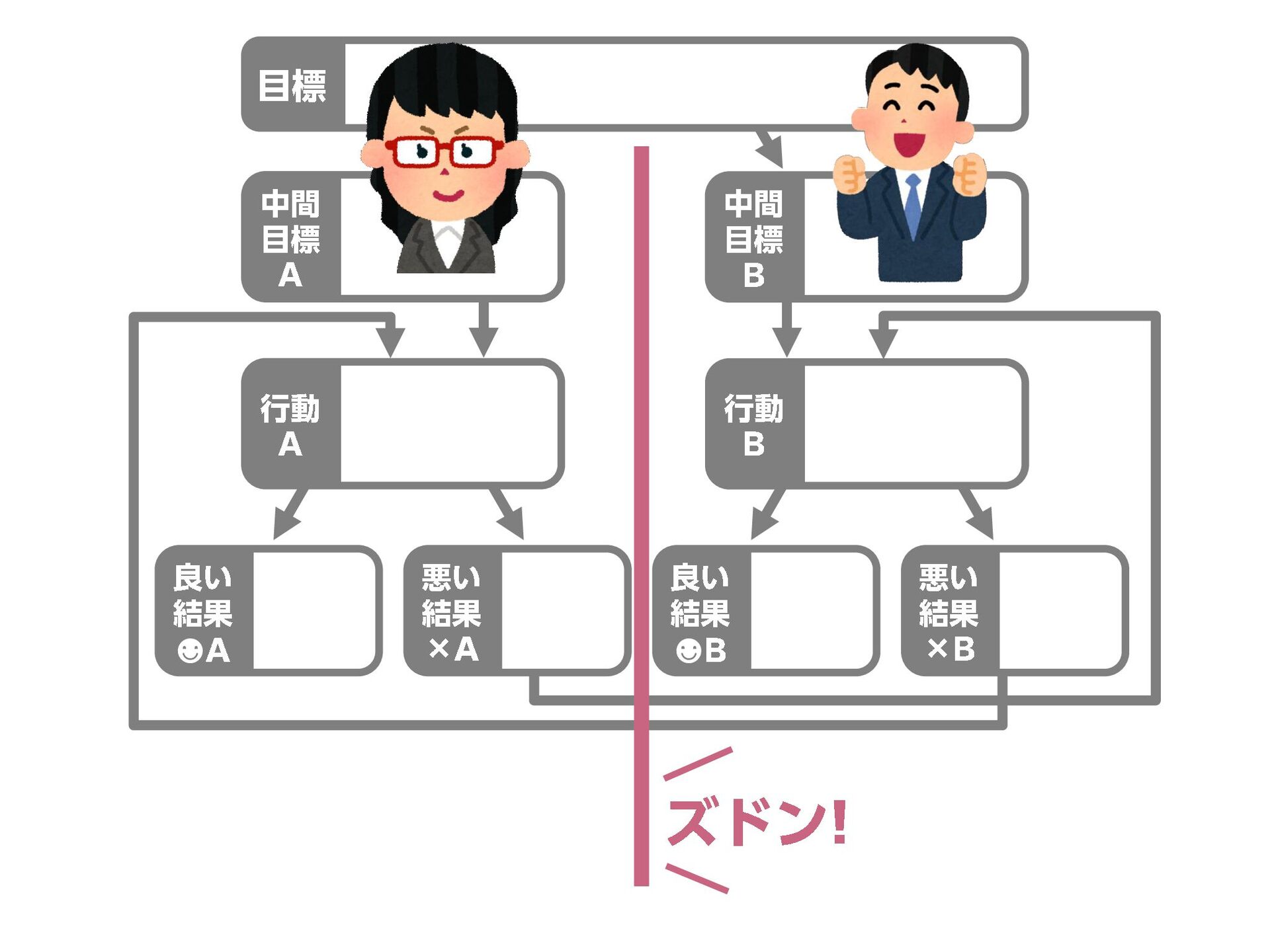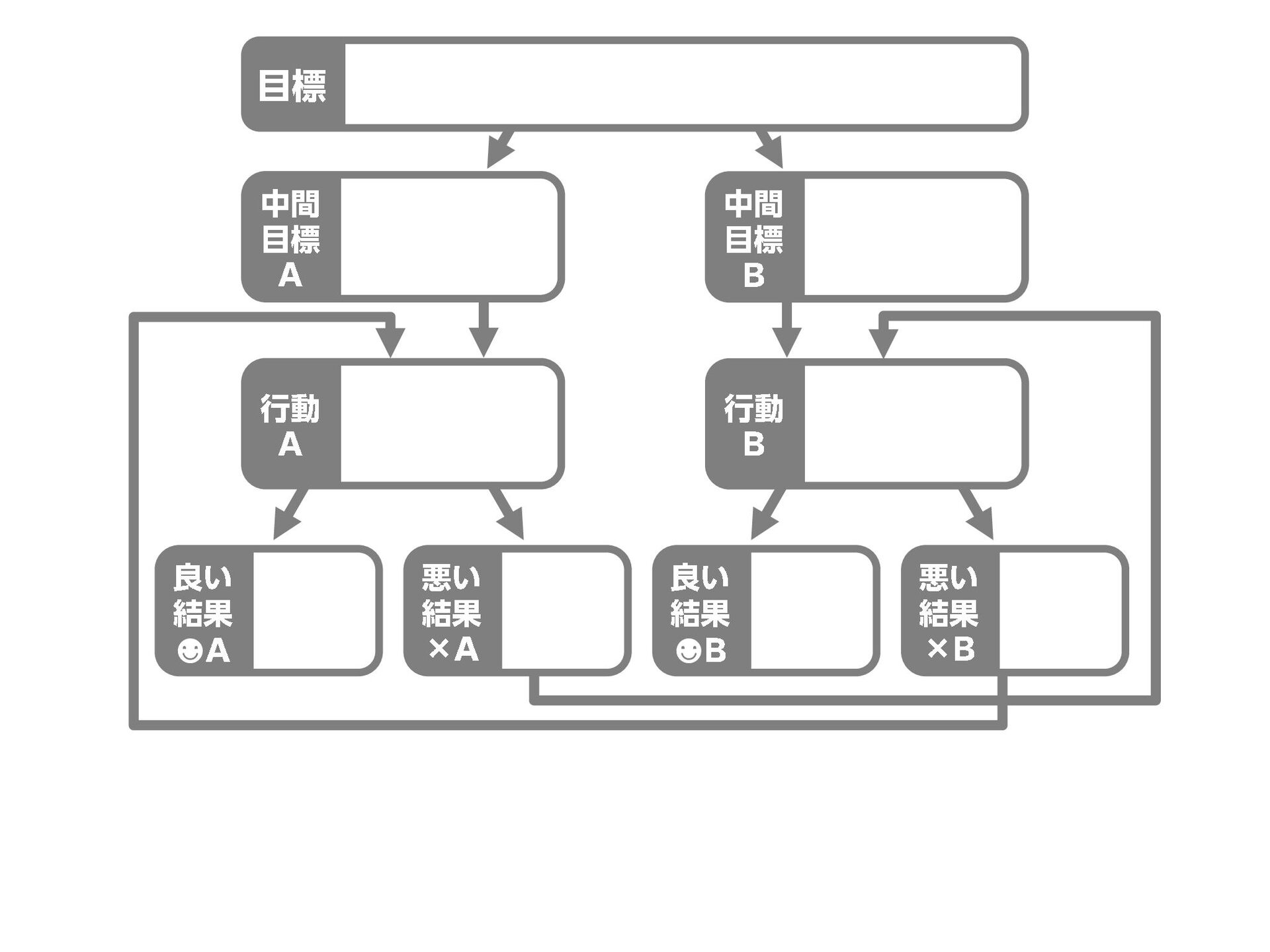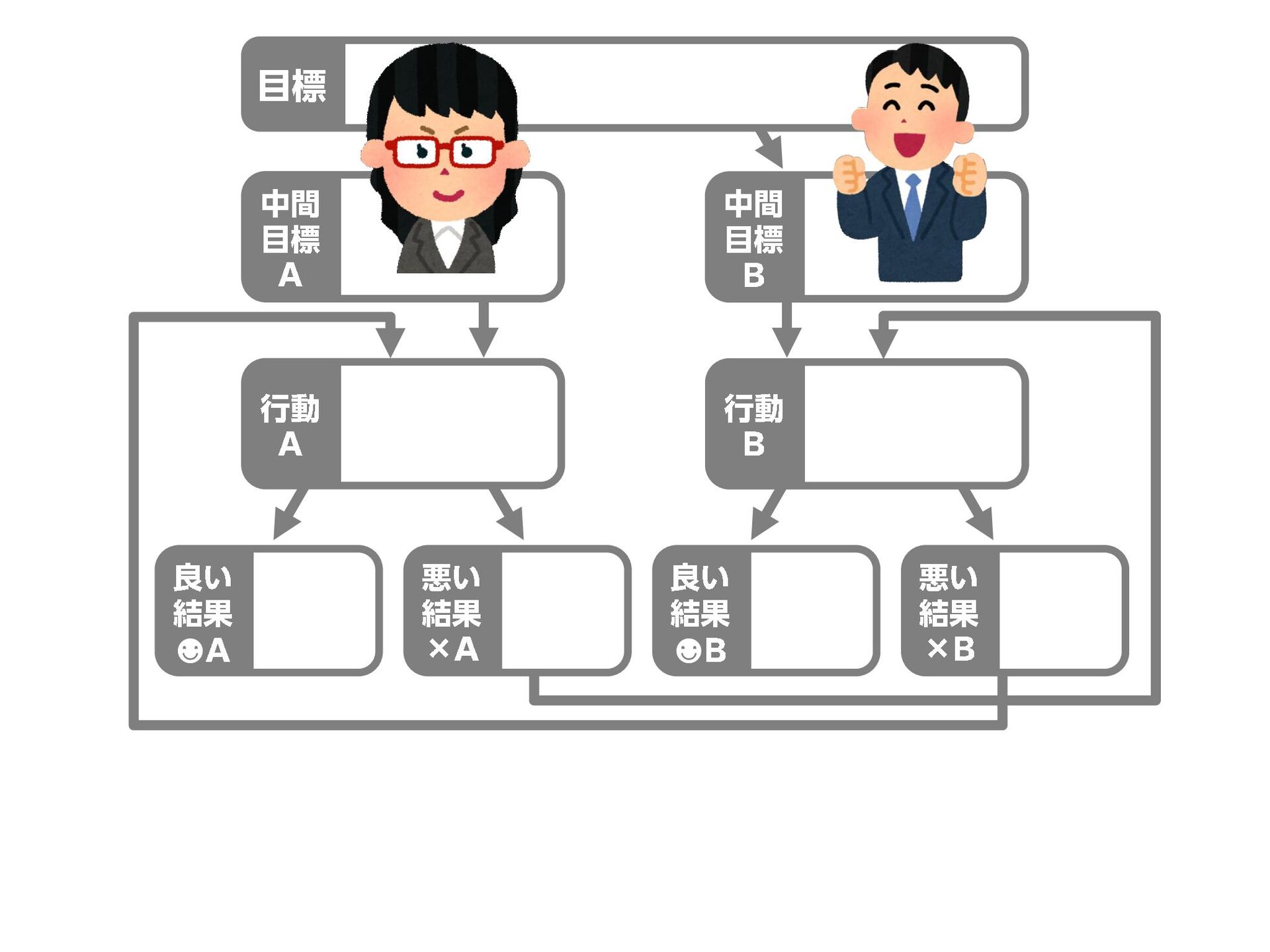 行動 B 広告を増やす 良い 結果 ☻A 悪い 結果 ×A 良い 結果 ☻B 悪い 結果 ×B 売上が 向上している コストが削減 されている 広告を減らす 売上が 増加 コスト 増加 コスト 減少 売上が 減少 えっ ! それは 困ります ! 新たな悪い結果によって 元の中間目標や要望が損なわれ それを守るための行動が 再度、駆り立てられます
