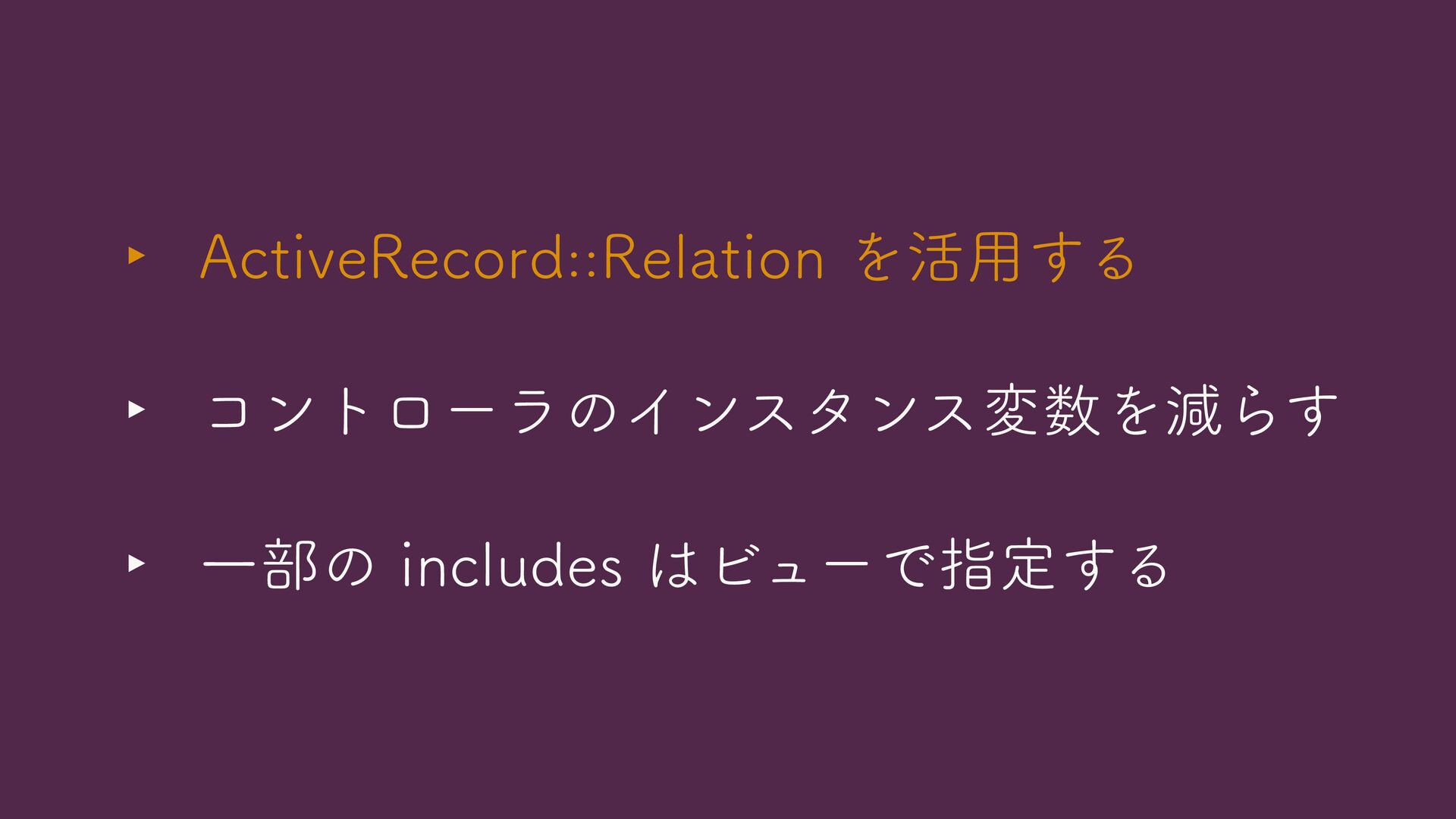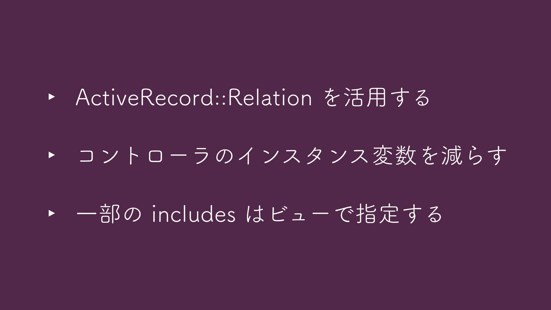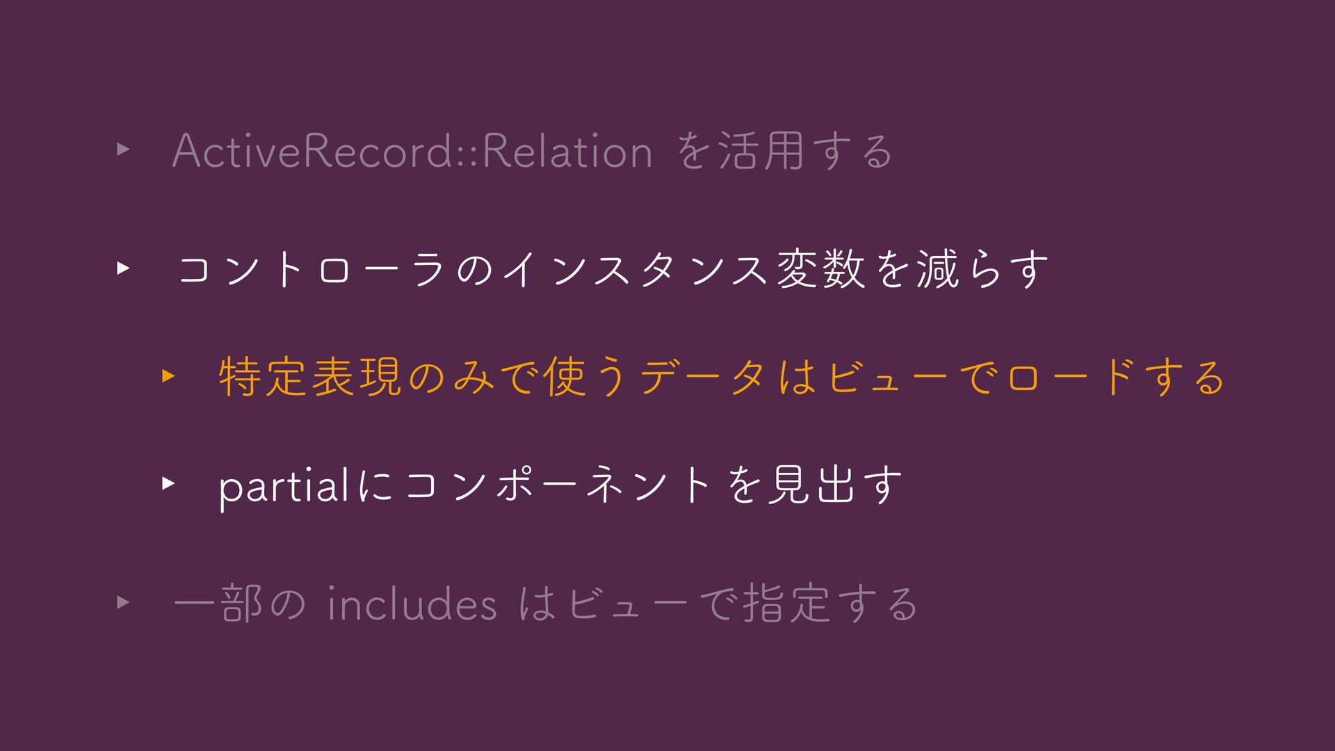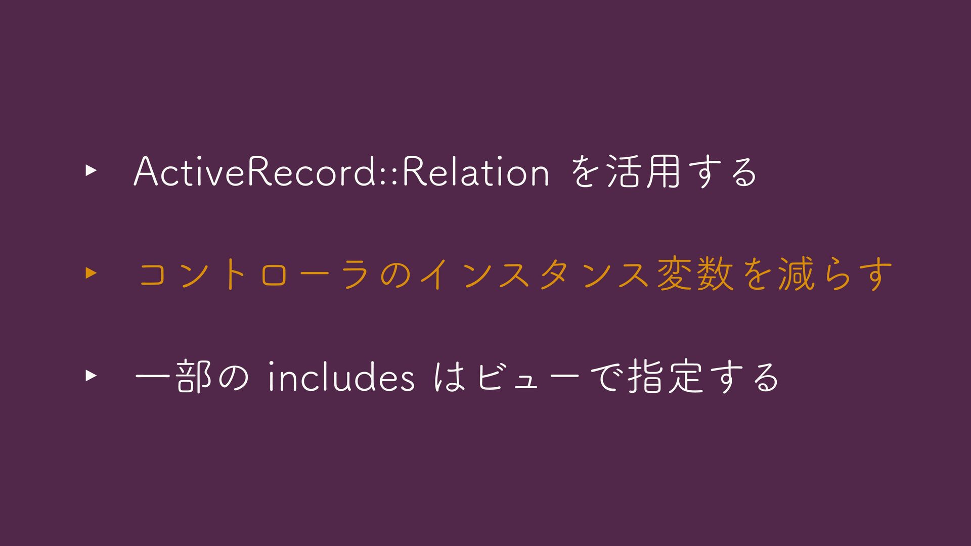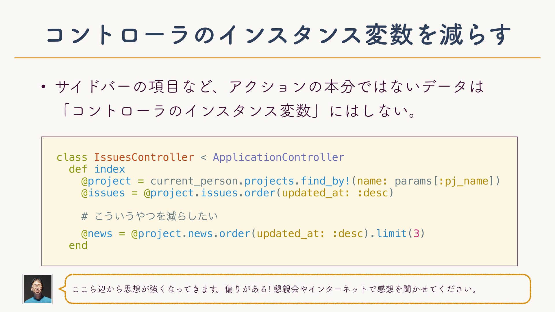 current_person.projects.find_by!(name: params[:pj_name]) @issues = @project.issues.order(updated_at: :desc) # ͜͏͍͏΍ͭΛݮΒ͍ͨ͠ @news = @project.news.order(updated_at: :desc).limit(3) end w αΠυόʔͷ߲໨ͳͲɺΞΫγϣϯͷຊ෼Ͱ͸ͳ͍σʔλ͸ ʮίϯτϩʔϥͷΠϯελϯεม਺ʯʹ͸͠ͳ͍ɻ