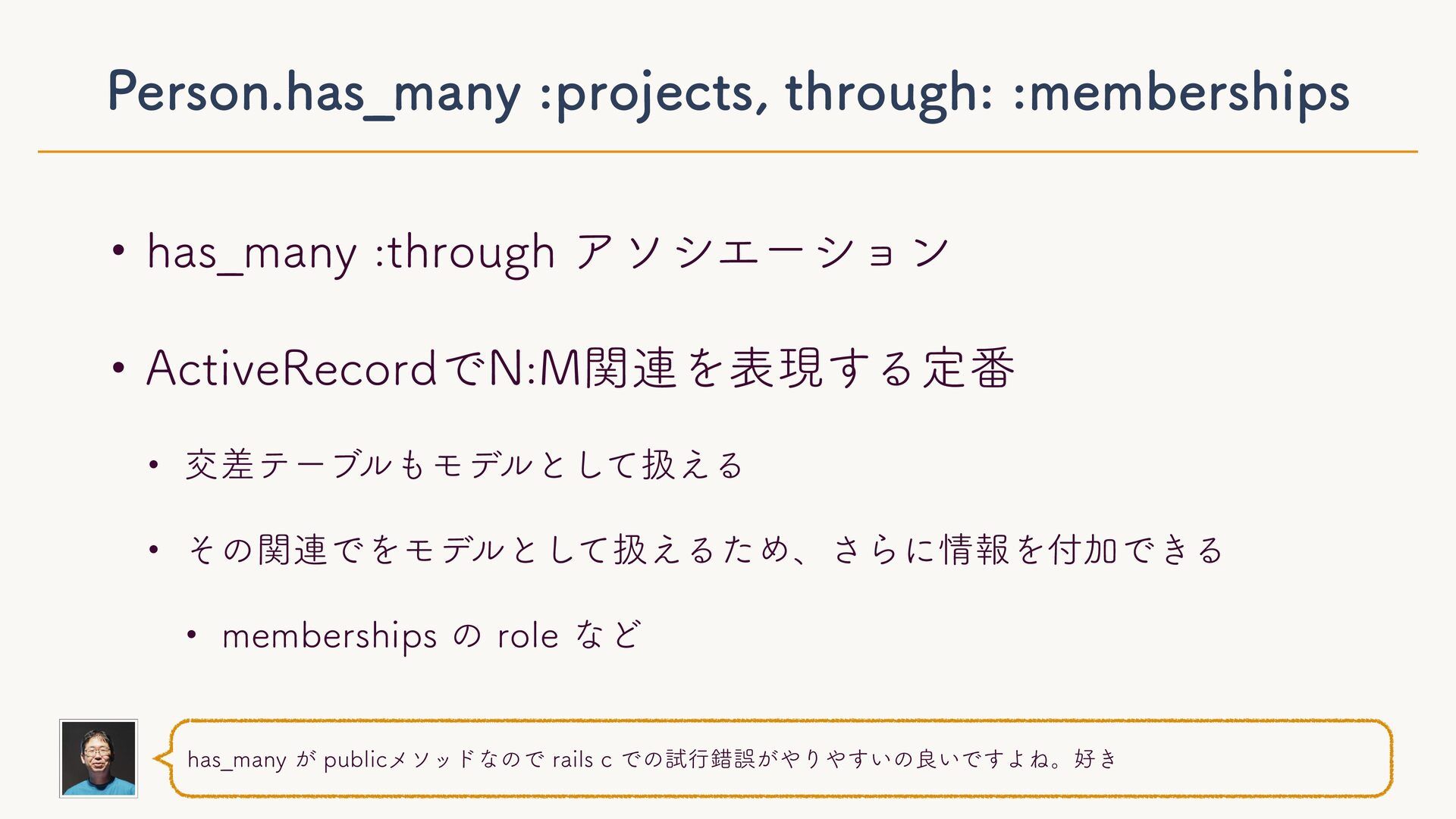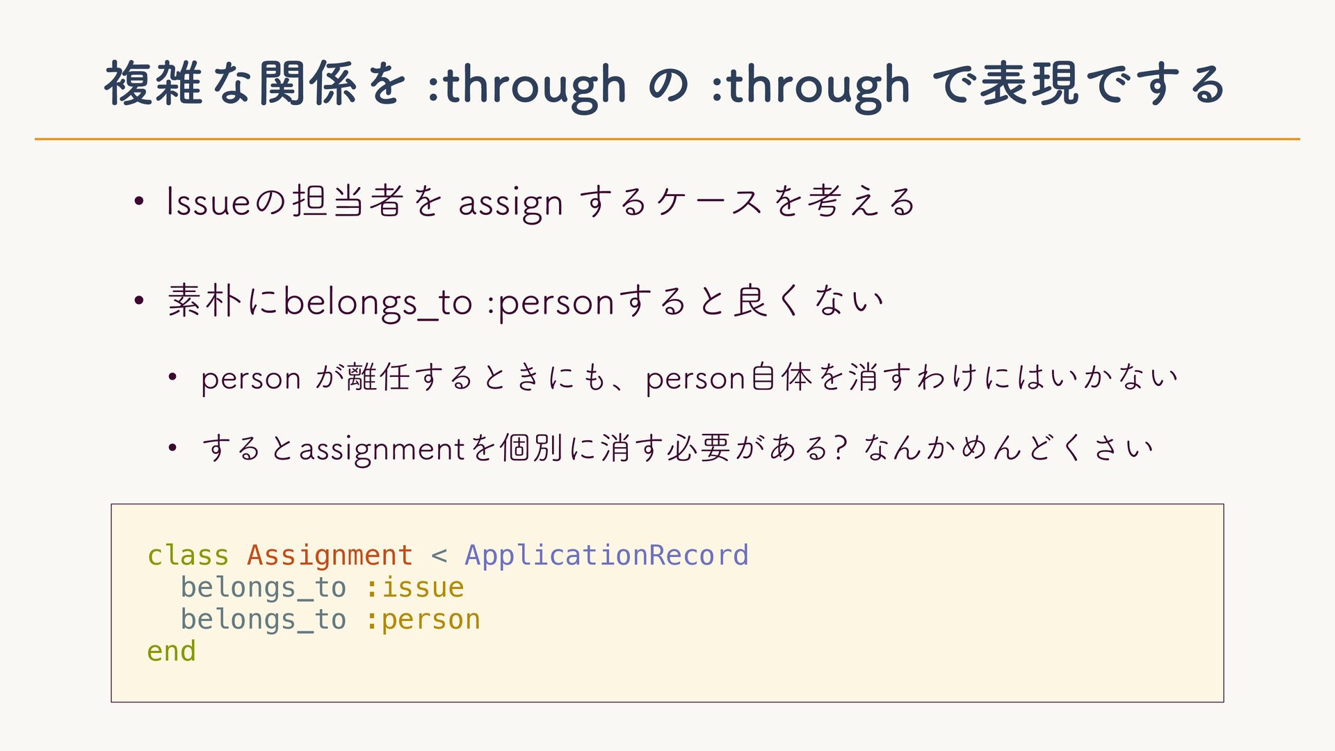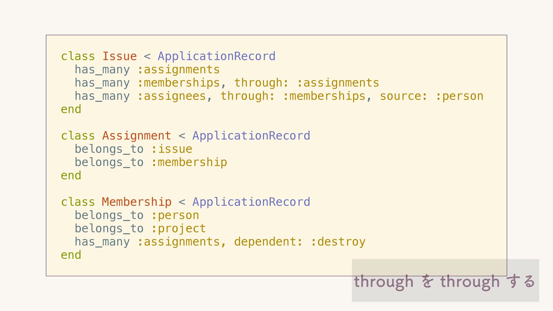 5. ෳࡶͳؔ܎ΛUISPVHIͷUISPVHIͰදݱͰ͢Δ class Assignment < ApplicationRecord belongs_to :issue belongs_to :person end