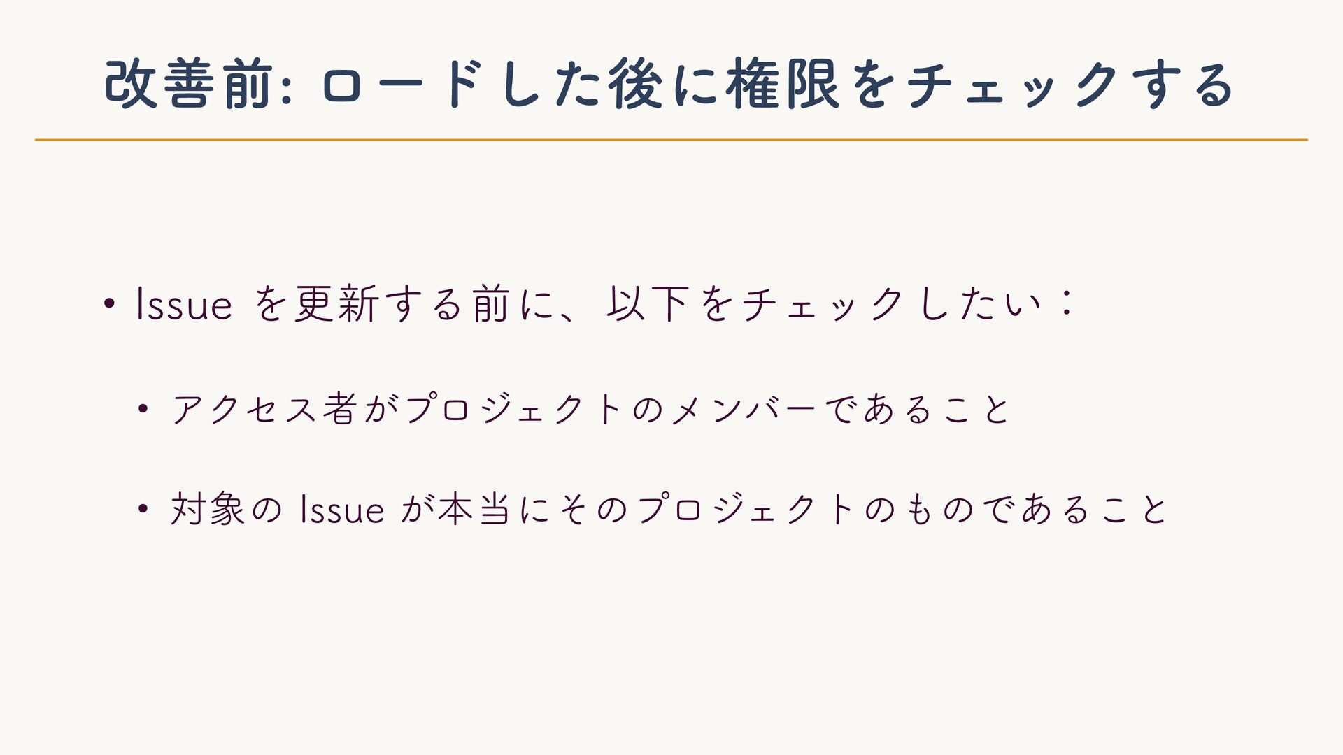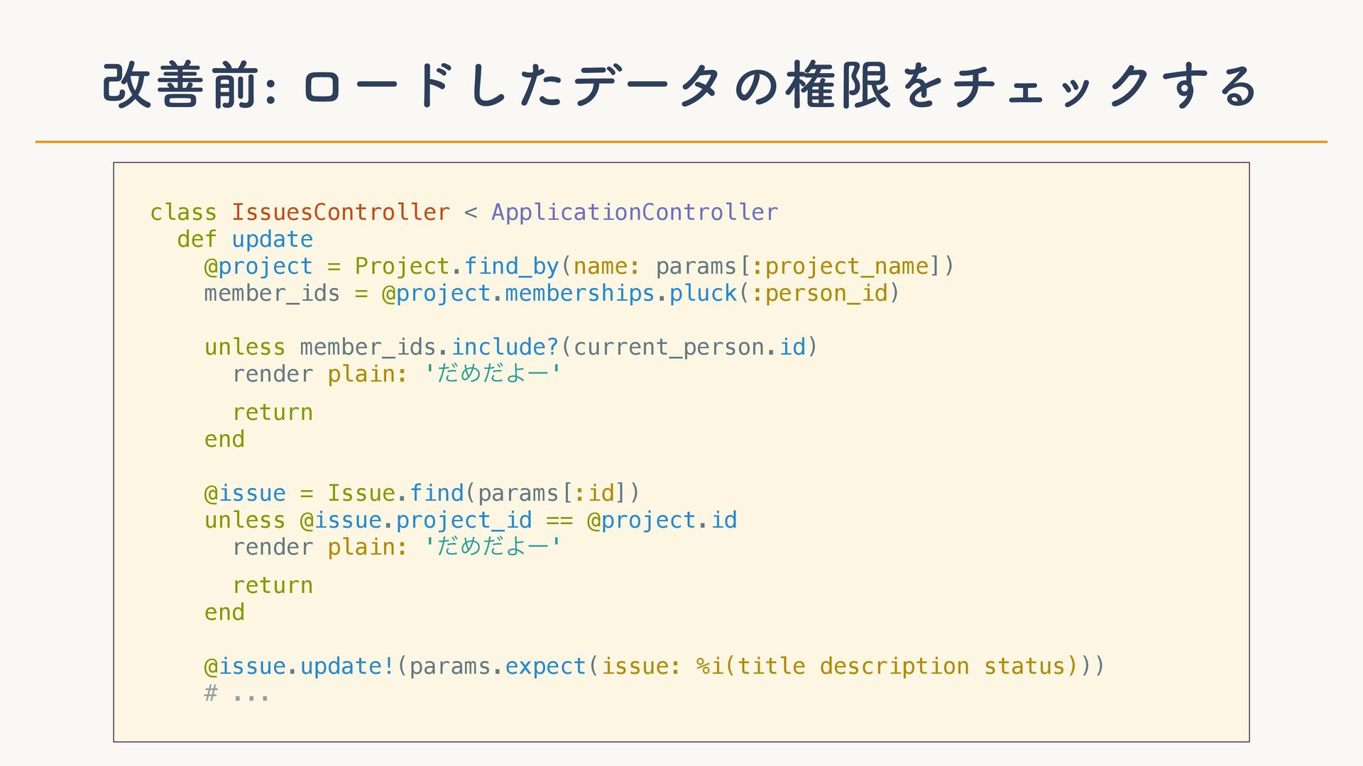 2. վળલϩʔυͨ͠σʔλͷݖݶΛνΣοΫ͢Δ class IssuesController < ApplicationController def update @project = Project.find_by(name: