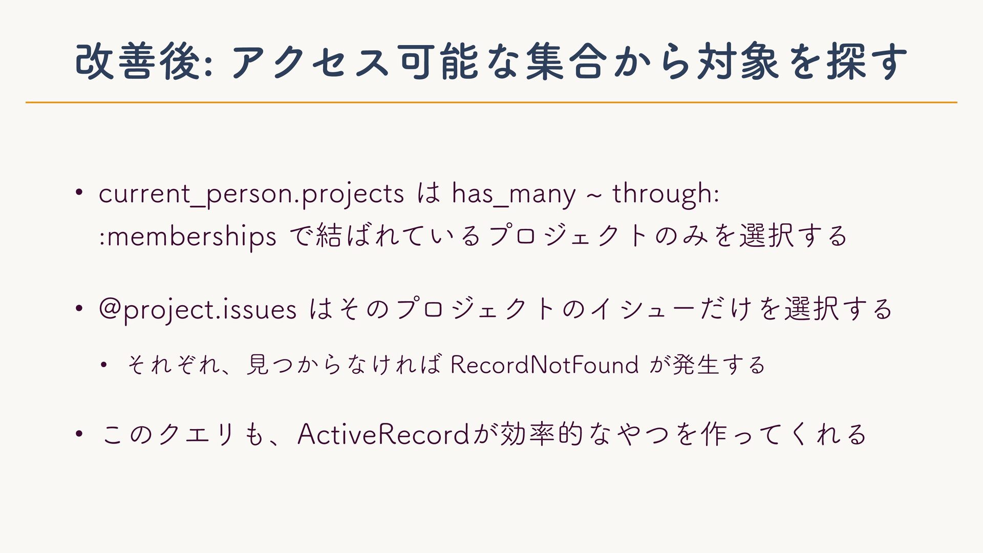 3. վળޙΞΫηεՄೳͳू߹͔Βର৅Λ୳͢ class IssuesController < ApplicationController def update @project = current_person.projects.find_by!(name:
