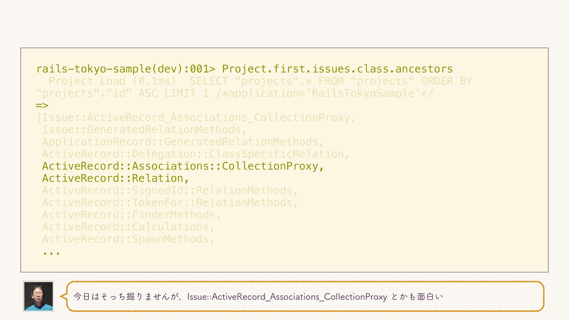 BY "projects"."id" ASC LIMIT 1 /*application='RailsTokyoSample'*/ => [Issue::ActiveRecord_Associations_CollectionProxy, Issue::GeneratedRelationMethods, ApplicationRecord::GeneratedRelationMethods, ActiveRecord::Delegation::ClassSpecificRelation, ActiveRecord::Associations::CollectionProxy, ActiveRecord::Relation, ActiveRecord::SignedId::RelationMethods, ActiveRecord::TokenFor::RelationMethods, ActiveRecord::FinderMethods, ActiveRecord::Calculations, ActiveRecord::SpawnMethods, ... ࠓ೔͸ͦͬͪ۷Γ·ͤΜ͕ɺ*TTVF"DUJWF3FDPSE@"TTPDJBUJPOT@$PMMFDUJPO1SPYZͱ͔΋໘ന͍