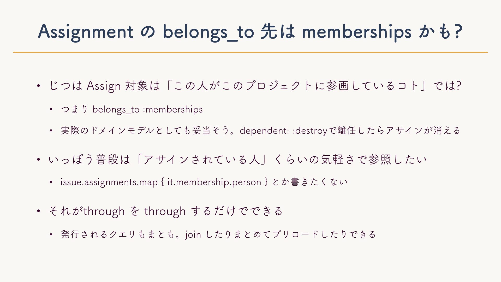 has_many :assignees, through: :memberships, source: :person end class Assignment < ApplicationRecord belongs_to :issue belongs_to :membership end class Membership < ApplicationRecord belongs_to :person belongs_to :project has_many :assignments, dependent: :destroy end UISPVHIΛUISPVHI͢Δ