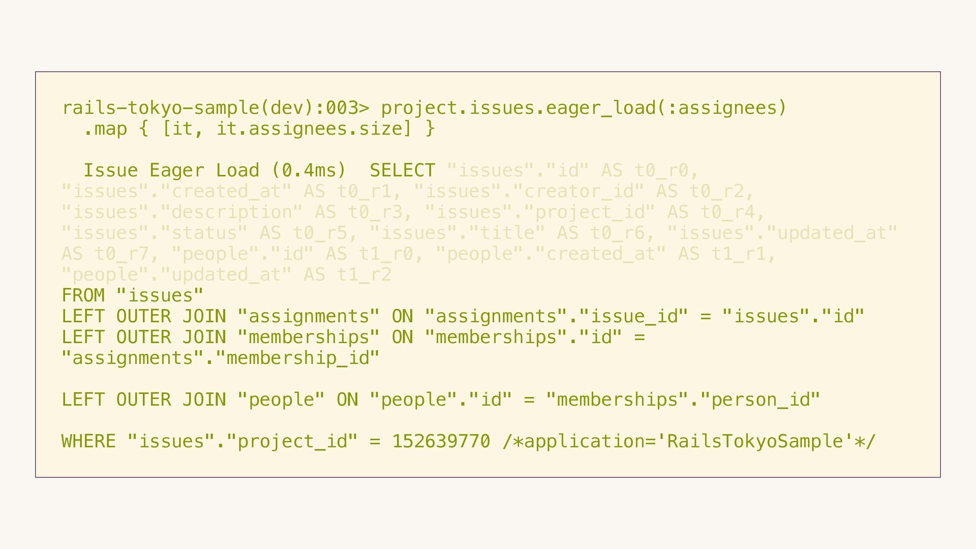 8. rails-tokyo-sample(dev):003> project.issues.eager_load(:assignees) .map { [it, it.assignees.size] } Issue Eager Load
