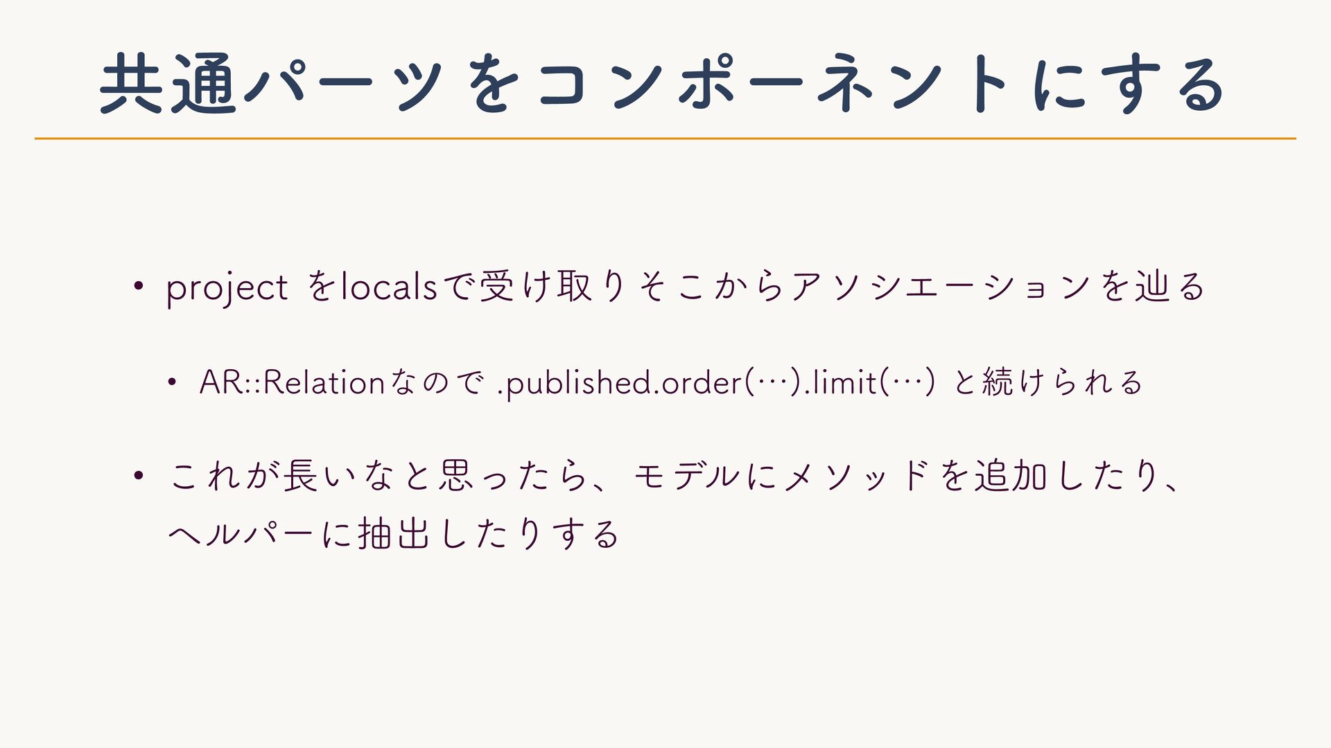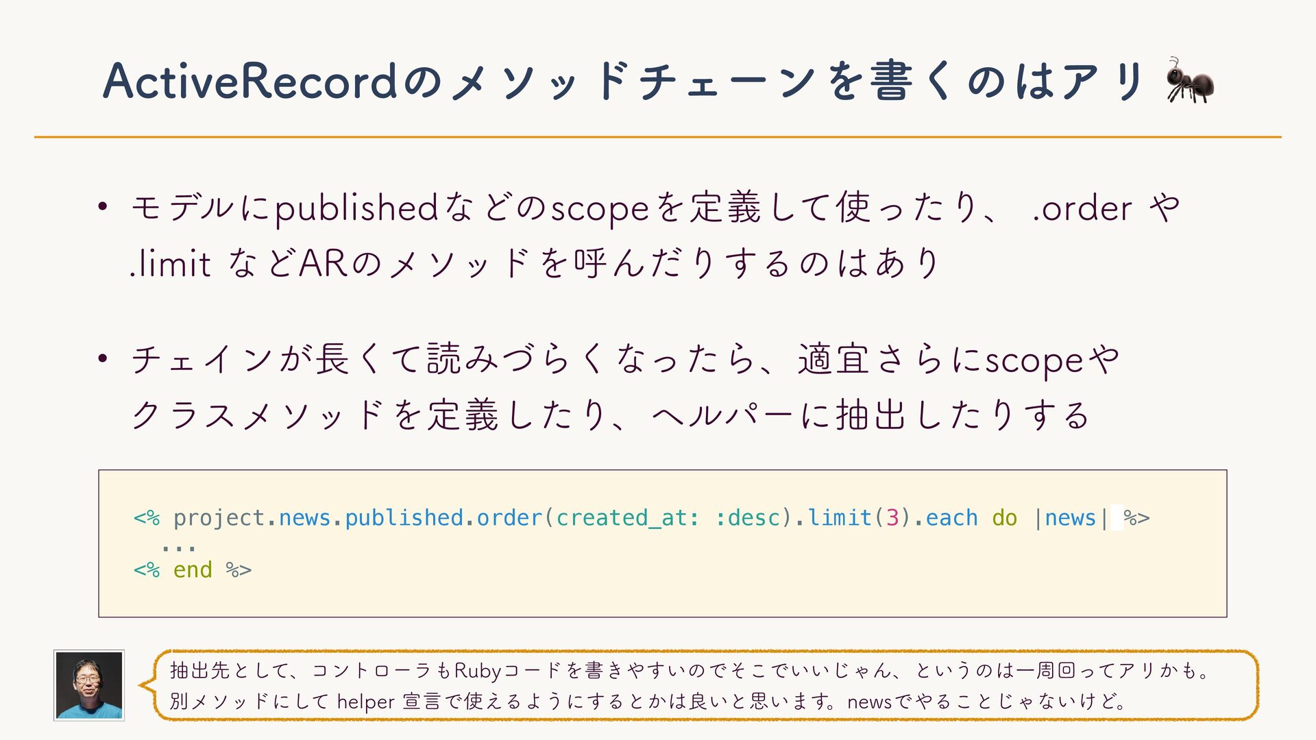 project.news.published.order(created_at: :desc).limit(3).each do |news| %> ... <% end %> நग़ઌͱͯ͠ɺίϯτϩʔϥ΋3VCZίʔυΛॻ͖΍͍͢ͷͰͦ͜Ͱ͍͍͡ΌΜɺͱ͍͏ͷ͸ҰपճͬͯΞϦ͔΋ɻ ผϝιουʹͯ͠IFMQFSએݴͰ࢖͑ΔΑ͏ʹ͢Δͱ͔͸ྑ͍ͱࢥ͍·͢ɻOFXTͰ΍Δ͜ͱ͡Όͳ͍͚Ͳɻ