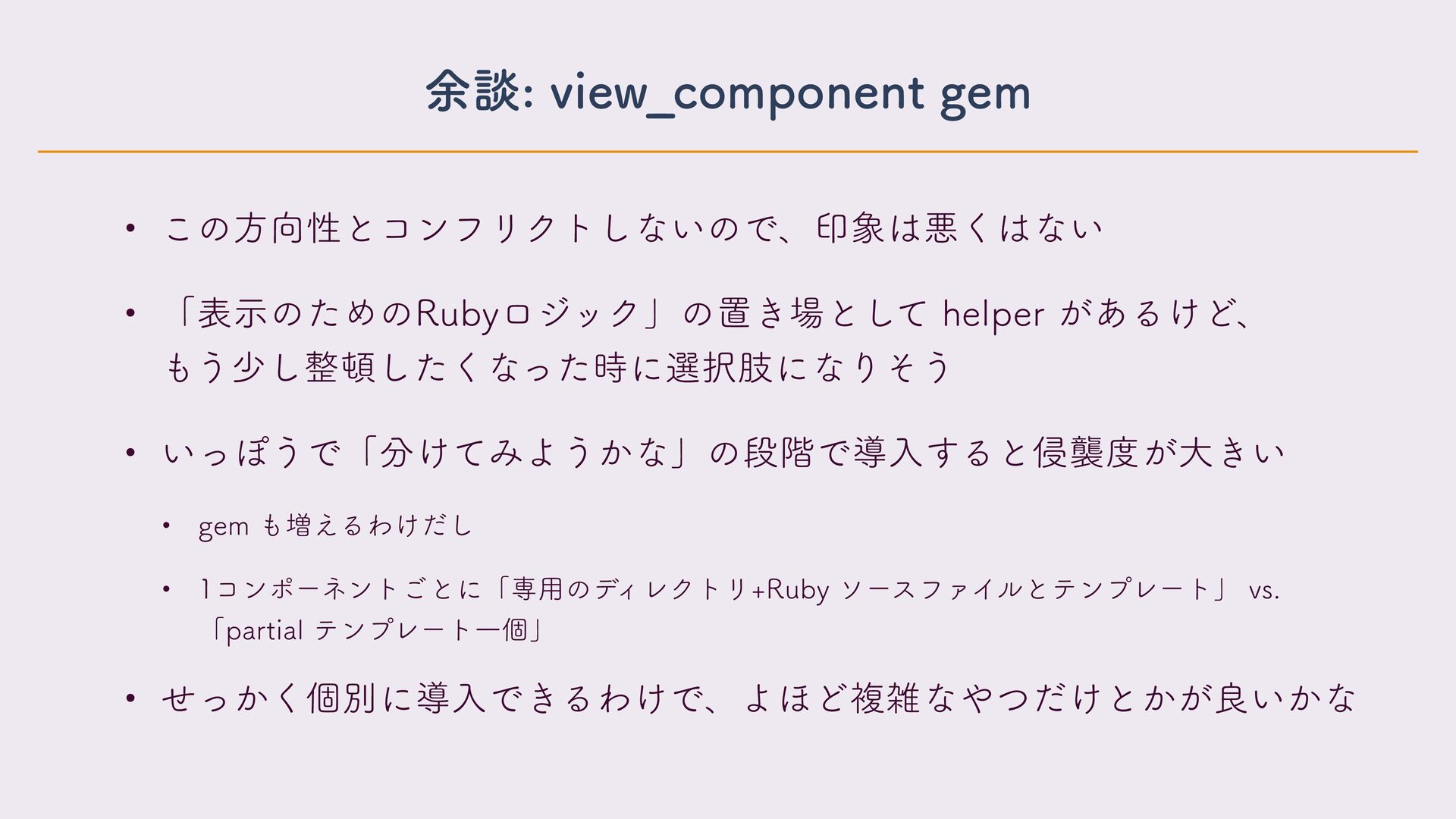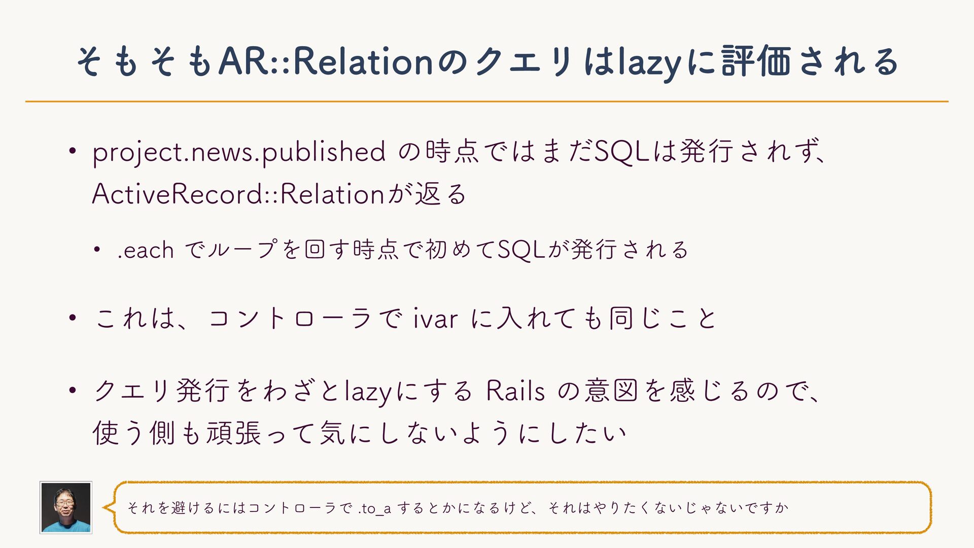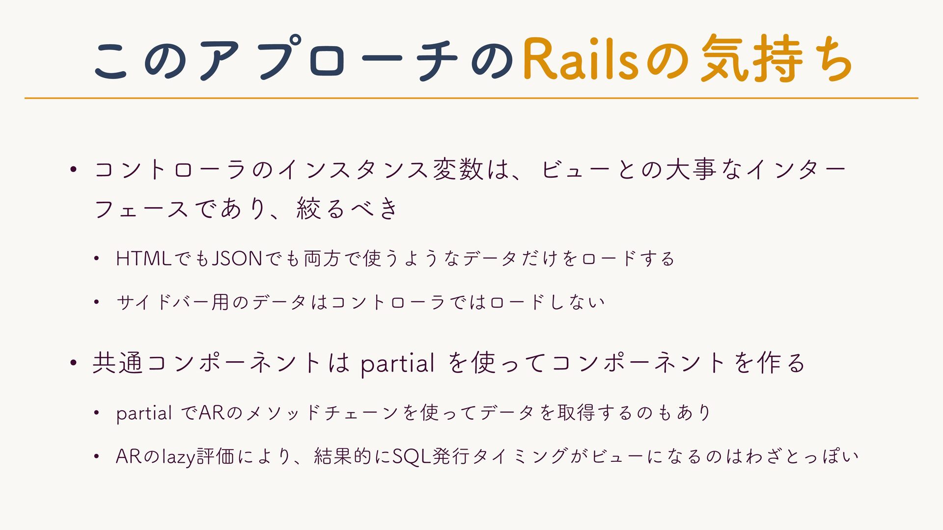 'SELECT * FROM news WHERE ...ORDER BY created_at DESC LIMIT 3' %> <% ActiveRecord::Base.connection.execute(query).each do |row| %> ... <% end %> ͜ͷʮϏϡʔʹ42-ॻ͘ͳʯ Θ͔Δ ͕ͩΜͩΜͱʮϏϡʔͰ%#ʹΞΫηε͢Δͳʯʹͳͬͨͷ͔ͳͱࢥͬͯ·͢ɻ ·ͨ͸ϨΠϠ෼ׂΞʔΩςΫνϟͷӨڹ͔ɻͰ΋.7$ҰൠͰ͸ͳ͘ɺ3BJMTݸผͷ࿩ͳͷͰɺͱ͍͏ͷ͕࿦ࢫͰ͢
