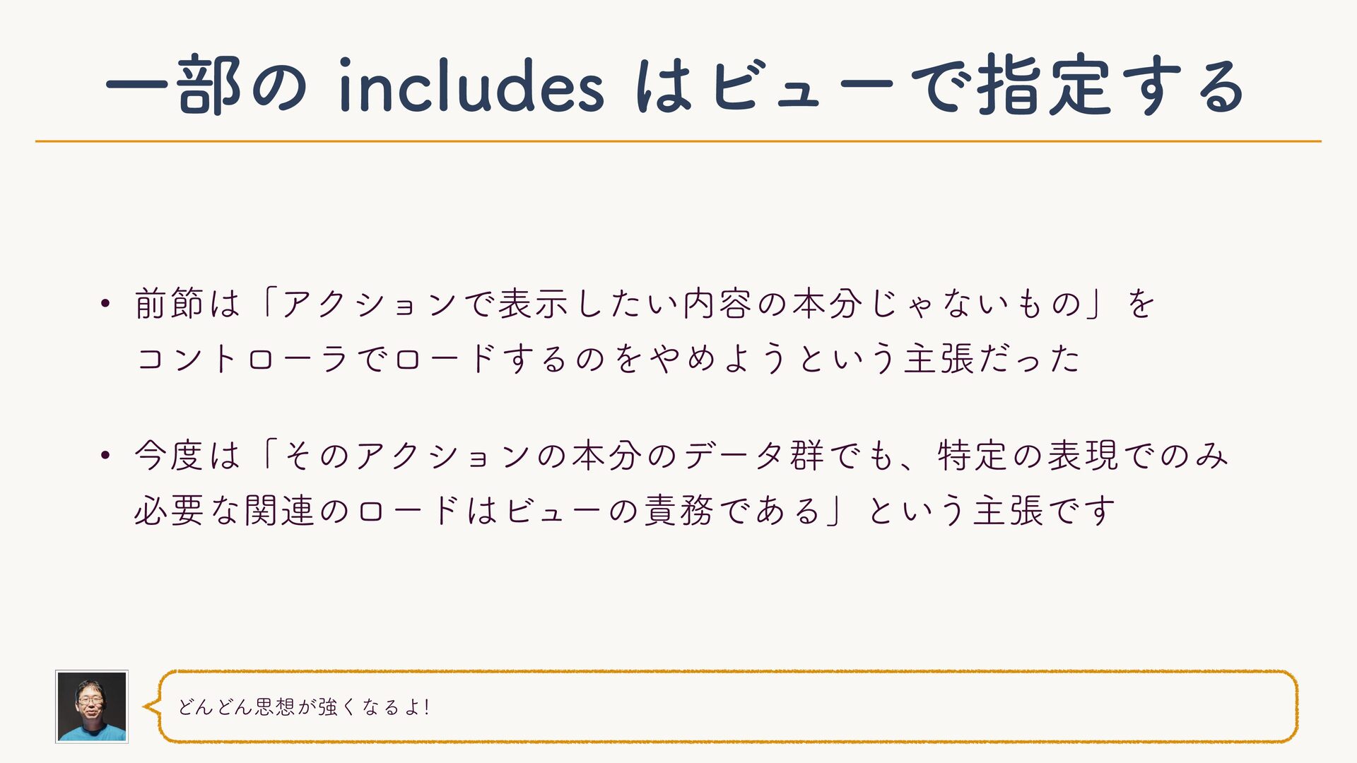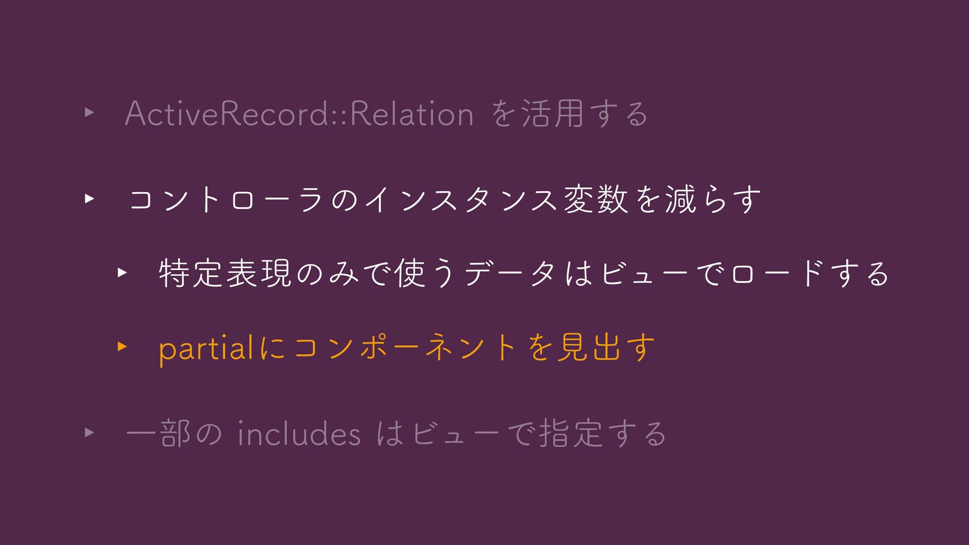 w ίϯτϩʔϥͰݺͿͱશͯͷςϯϓϨʔτͰಉ͡JODMVEFT͕ద༻͞Εͯ͠·͏ w ϏϡʔͰݺͿͱɺ֤දݱͰඞཁͳ΋ͷΛJODMVEFͰ͖Δ ੲ͸࢖͍͚ͬͯͨͲϏϡʔΛม͑Δ͏ͪʹෆཁʹͳͬͨJODMVEF͕࢒͍ͬͯͯɺ๨ΕͨࠒʹύϑΥʔϚϯε ѱԽͷݪҼʹͳͬͨɺΈ͍ͨͳܦݧ͋Δਓ΋ଟ͍͔ͱࢥ͍·͢ɻࢲ΋͍ͬͺ͍͋Γ·͢X