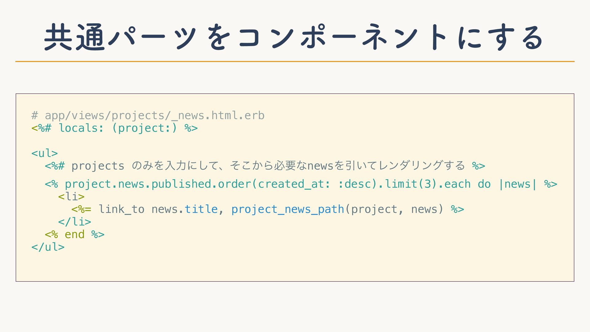 15. ڞ௨ύʔπΛίϯϙʔωϯτʹ͢Δ # app/views/projects/_news.html.erb <%# locals: (project:) %> <ul> <%# projects