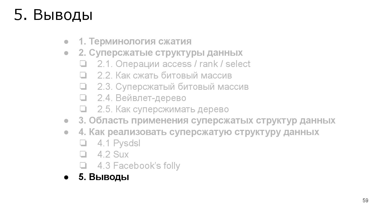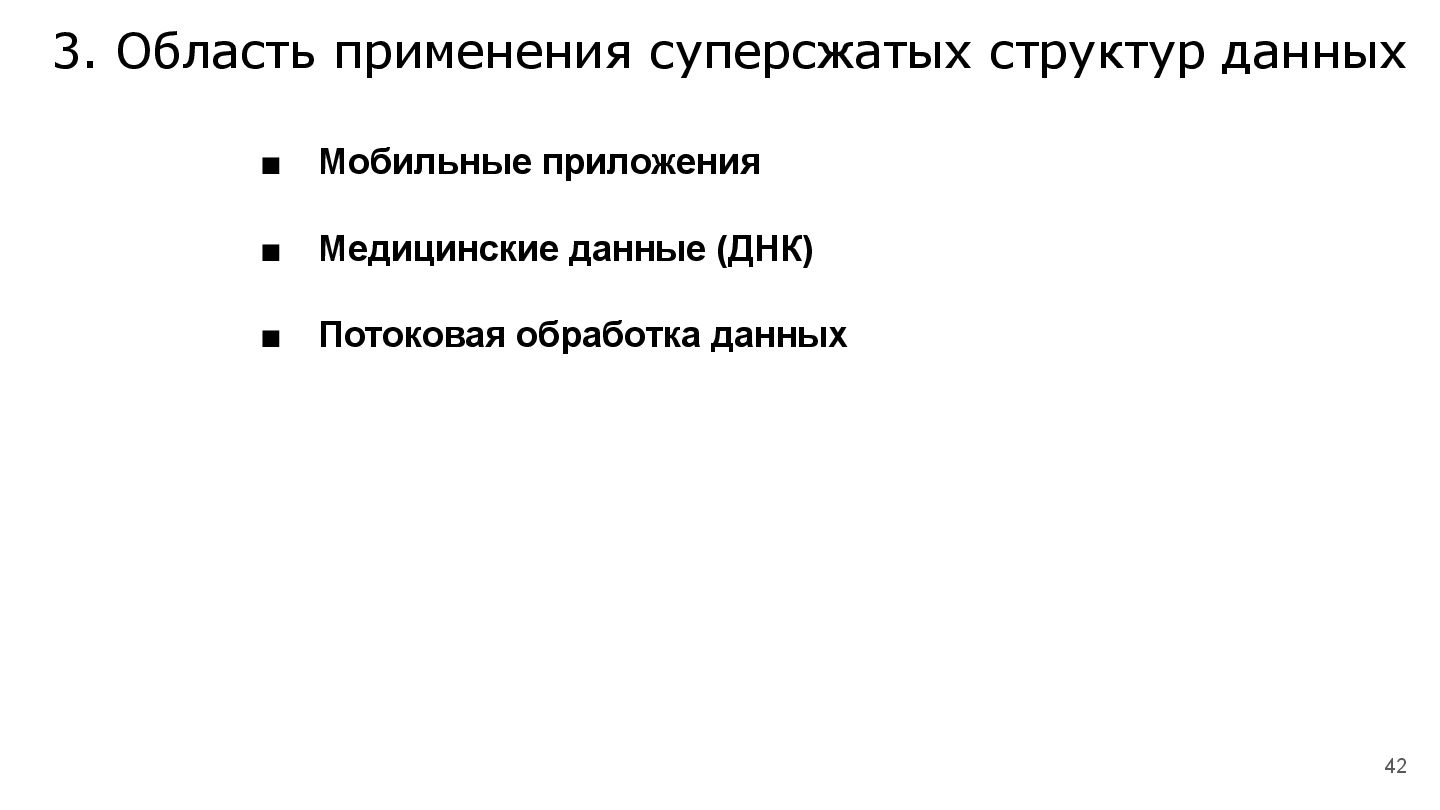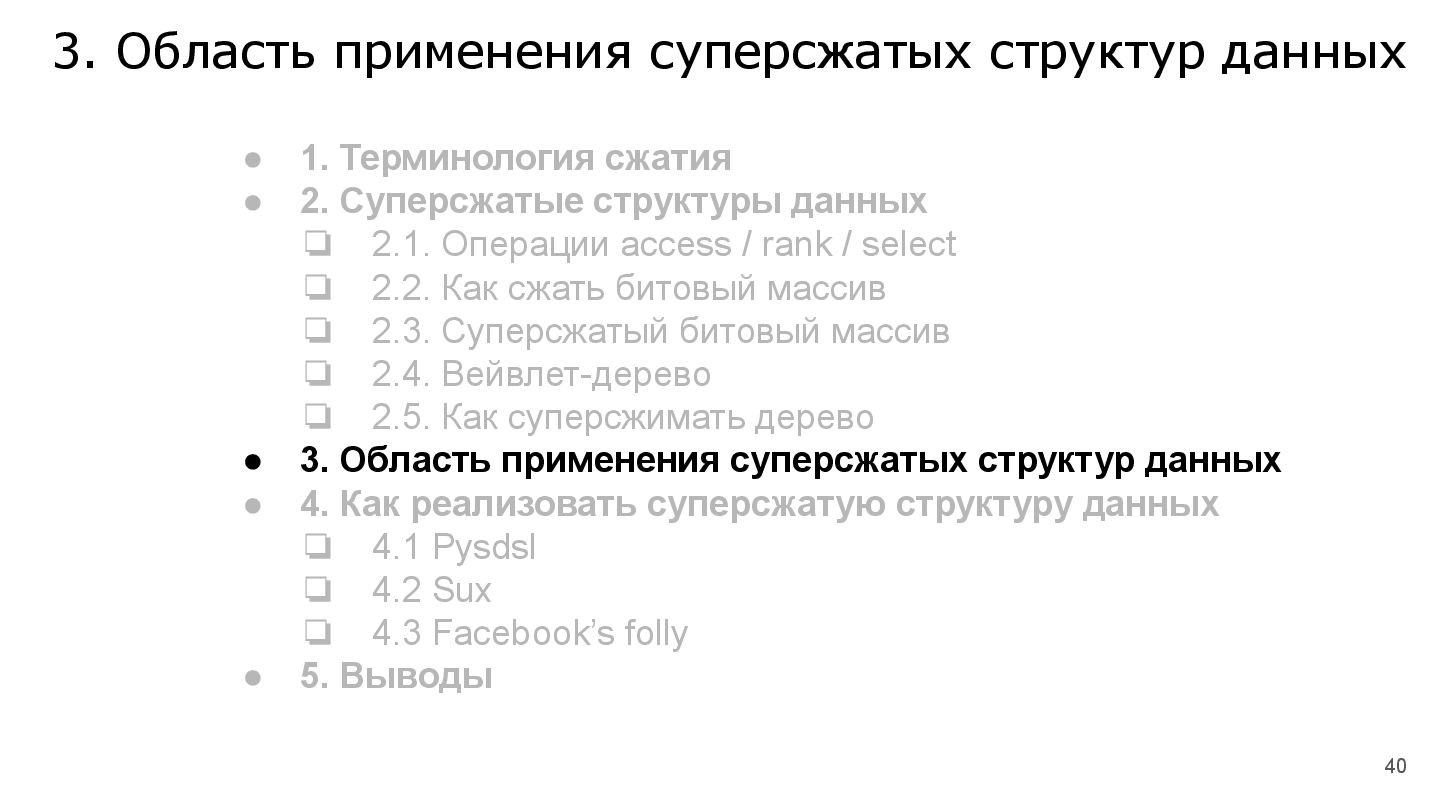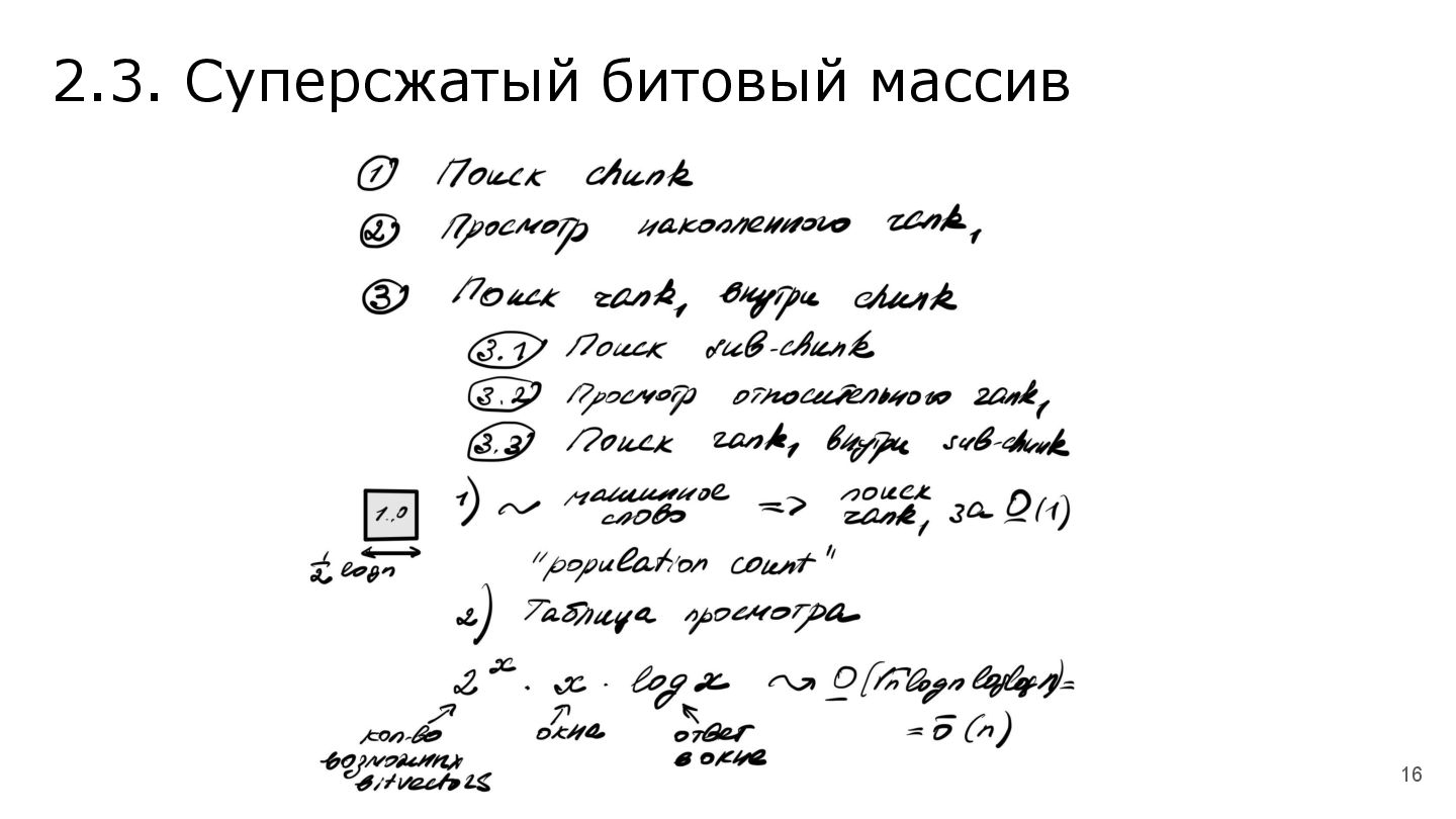 По мере увеличения объёма данных, структуры данных, занимающие много дополнительного места, становятся всё менее производительны и возникает вопрос: как оптимально сжать структуру данных по памяти, чтобы не потерять производительность основных операций на структуре. В докладе разберёмся со сжатыми структурами данных, их практической реализацией, а также посмотрим для каких задач их целесообразно применять.