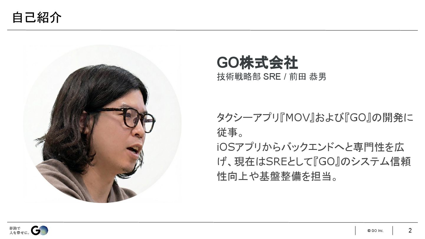 1. © GO Inc. GO株式会社 技術戦略部 SRE / 前田 恭男 タクシーアプリ『MOV』および『GO』の開発に