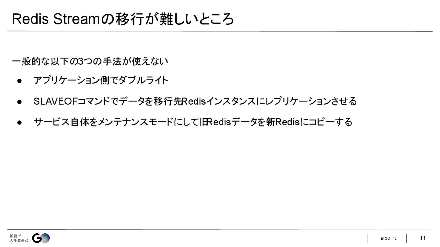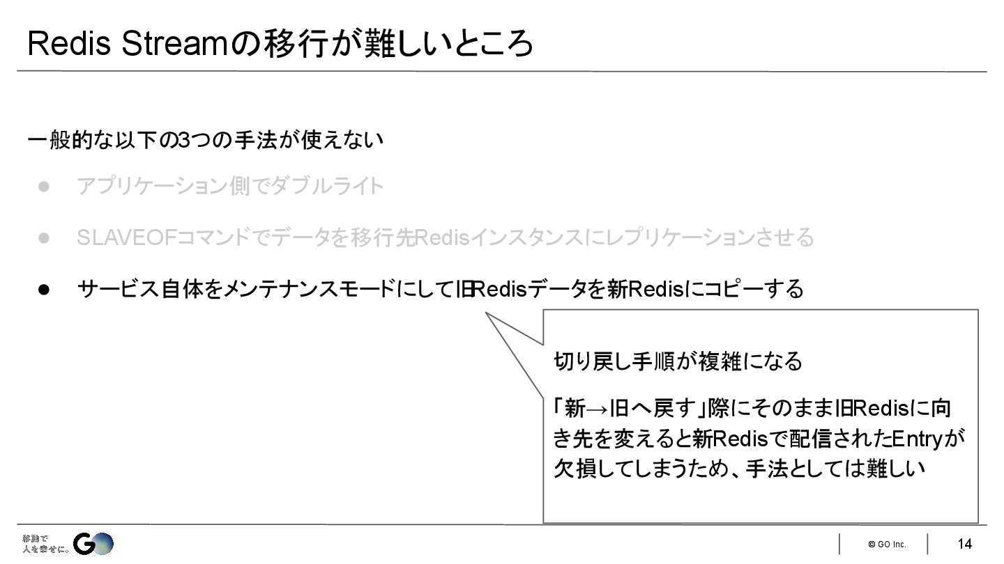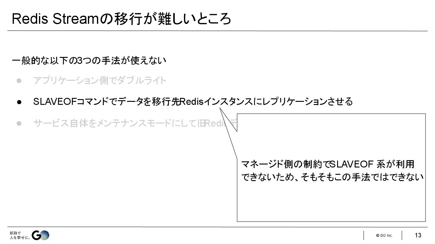 7. © GO Inc. 一般的な以下の3つの手法が使えない • アプリケーション側でダブルライト • SLAVEOFコマンドでデータを移行先Redisインスタンスにレプリケーションさせる • サービス自体をメンテナンスモードにして旧