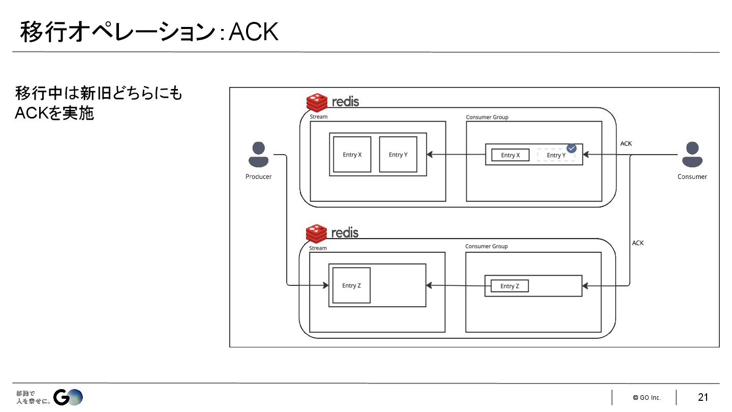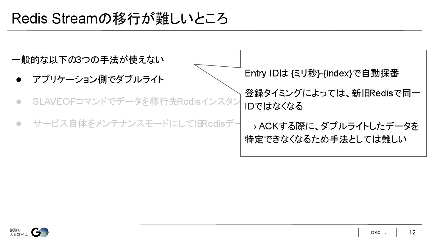 Redisデータを新Redisにコピーする Redis Streamの移行が難しいところ Entry IDは {ミリ秒}-{index}で自動採番 登録タイミングによっては、新旧 Redisで同一 IDではなくなる → ACKする際に、ダブルライトしたデータを 特定できなくなるため手法としては難しい 12