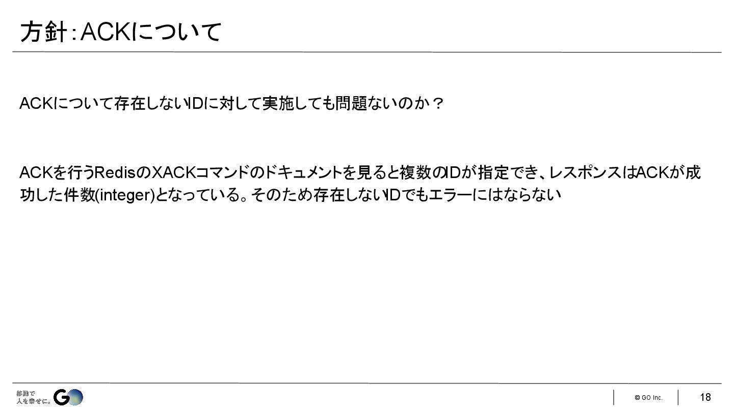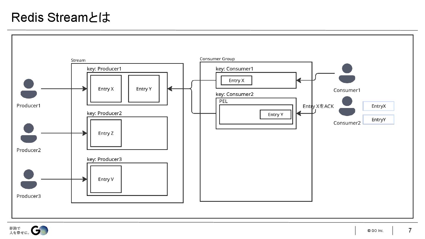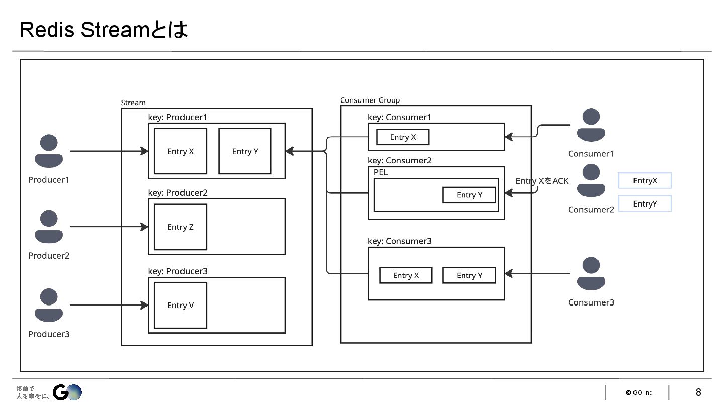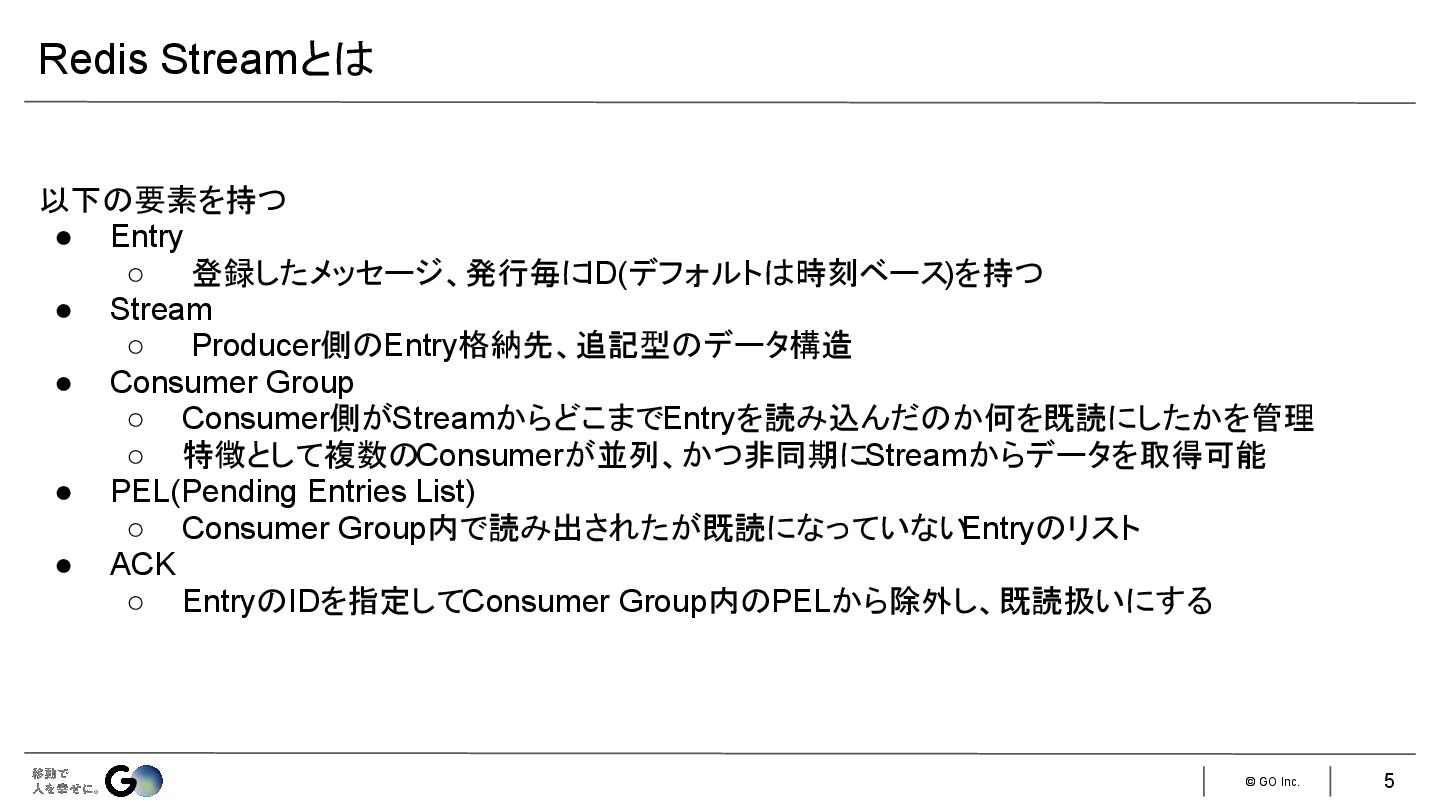 3. © GO Inc. Redisのデータ構造の1つ 書き込み側(Producer)と読み取り(Consumer)が独立して管理されており、読み取り側では未読 /既読と いった状態管理が行われる Redis Pub/Subも近い機能を持つが、最も大きな違いはデータの永続性にあります。 •