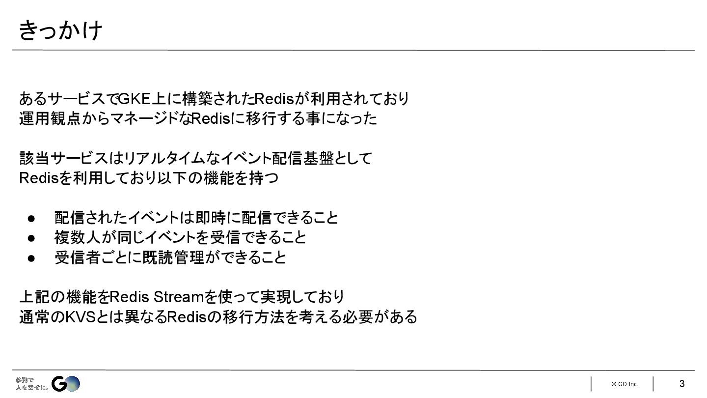 2. © GO Inc. あるサービスでGKE上に構築されたRedisが利用されており 運用観点からマネージドなRedisに移行する事になった 該当サービスはリアルタイムなイベント配信基盤として Redisを利用しており以下の機能を持つ • 配信されたイベントは即時に配信できること •