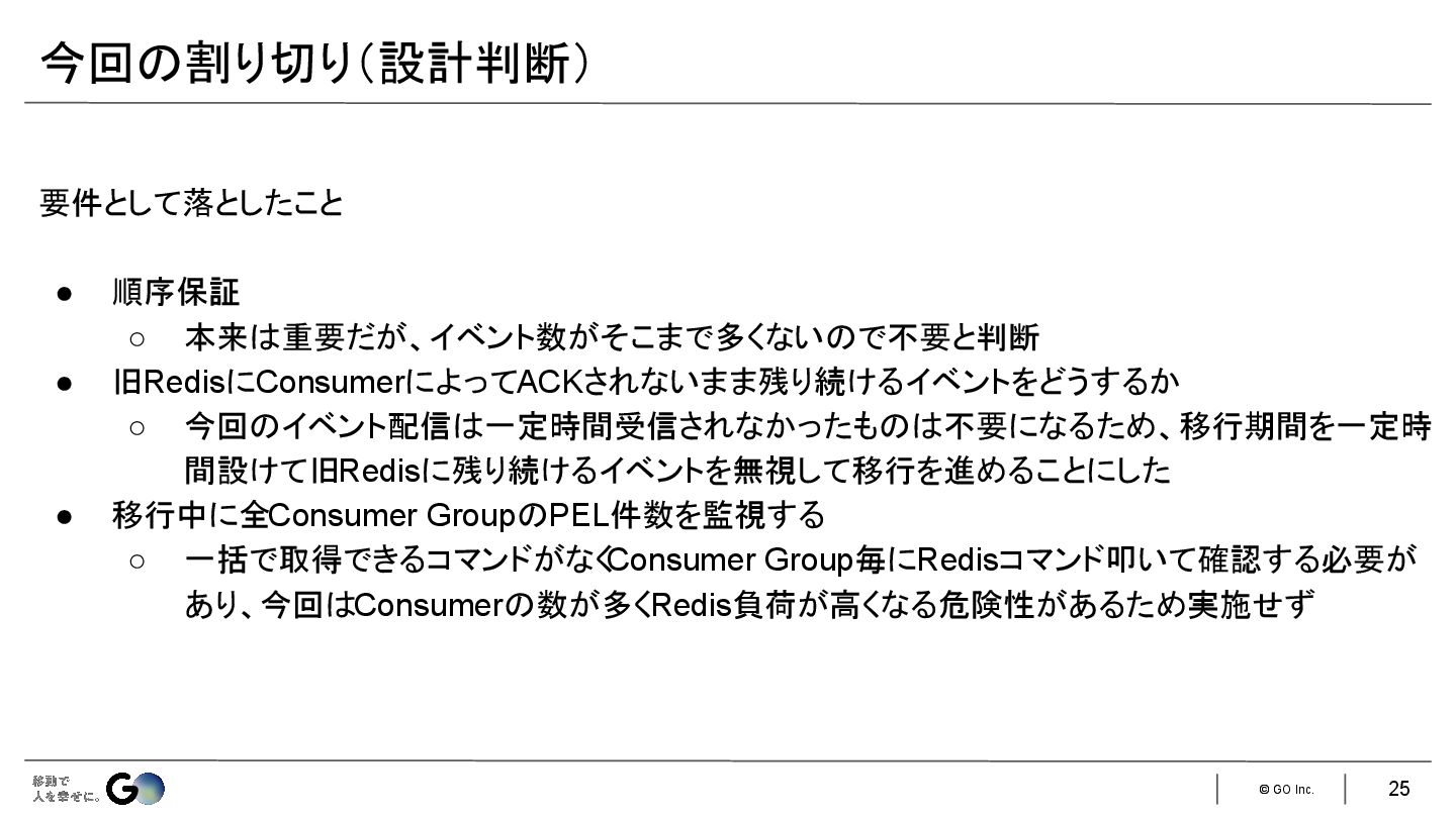 旧RedisにConsumerによってACKされないまま残り続けるイベントをどうするか ◦ 今回のイベント配信は一定時間受信されなかったものは不要になるため、移行期間を一定時 間設けて旧Redisに残り続けるイベントを無視して移行を進めることにした • 移行中に全Consumer GroupのPEL件数を監視する ◦ 一括で取得できるコマンドがなく Consumer Group毎にRedisコマンド叩いて確認する必要が あり、今回はConsumerの数が多くRedis負荷が高くなる危険性があるため実施せず 25