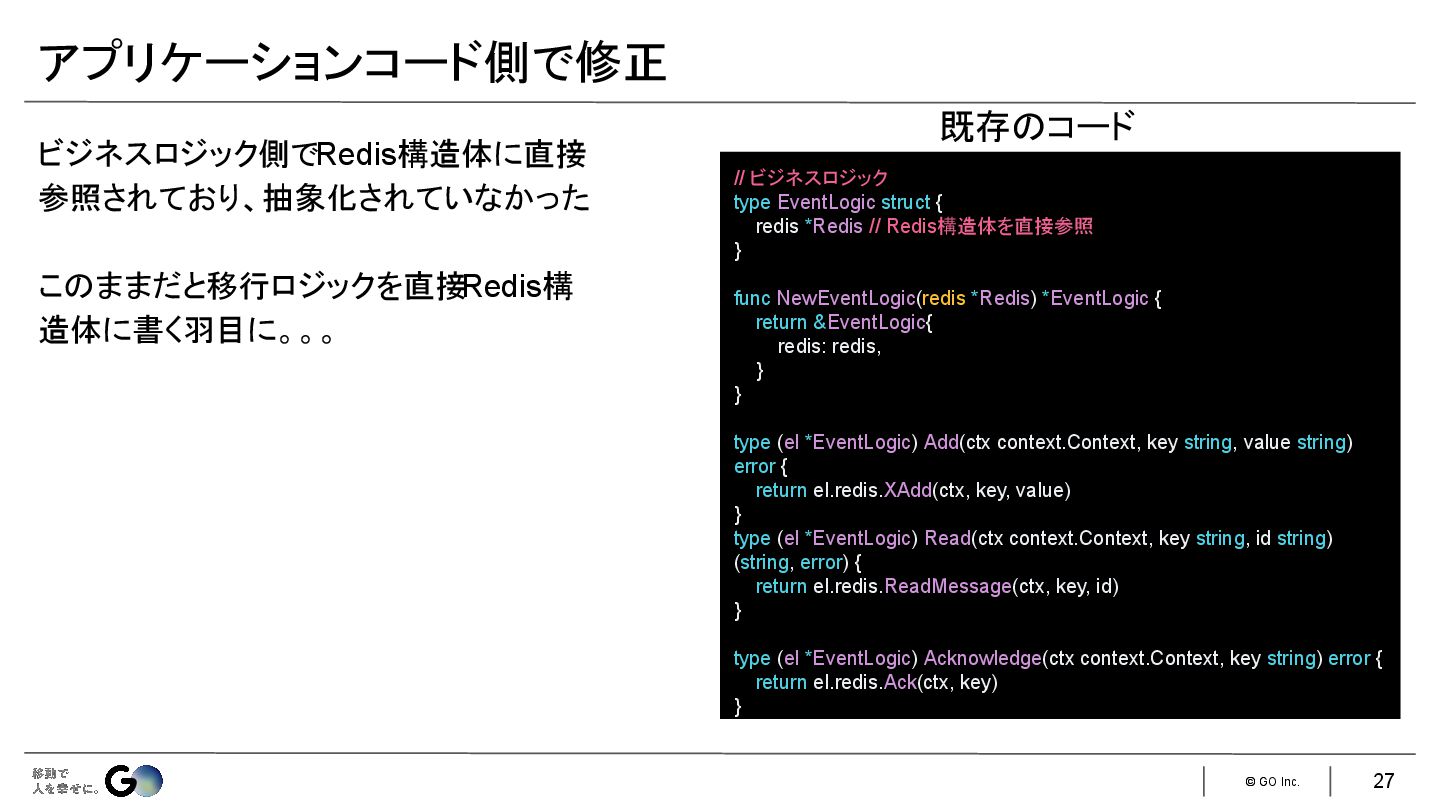 9. © GO Inc. ビジネスロジック側でRedis構造体に直接 参照されており、抽象化されていなかった このままだと移行ロジックを直接 Redis構 造体に書く羽目に。。。 アプリケーションコード側で修正 //