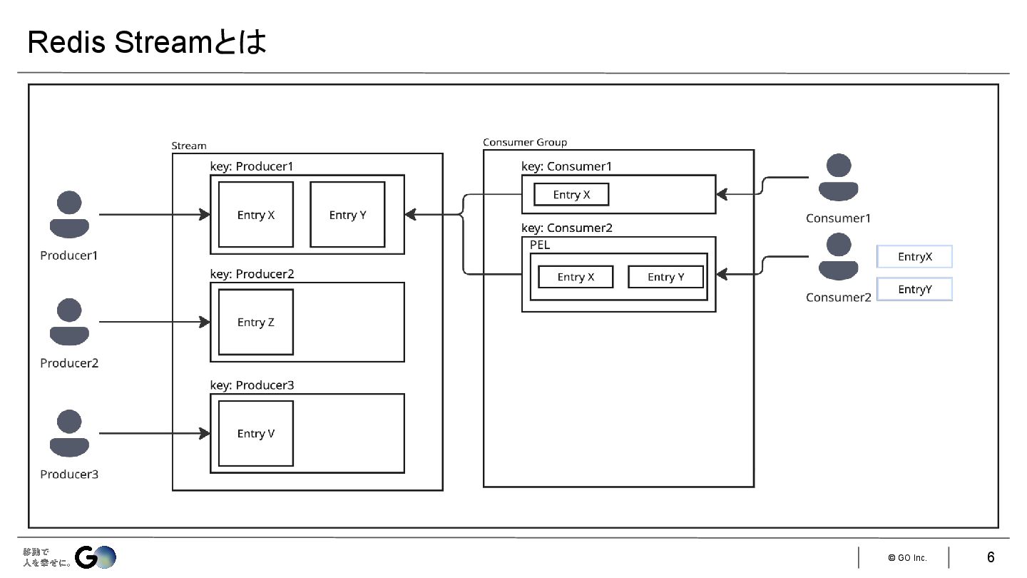 ◦ Producer側のEntry格納先、追記型のデータ構造 • Consumer Group ◦ Consumer側がStreamからどこまでEntryを読み込んだのか何を既読にしたかを管理 ◦ 特徴として複数のConsumerが並列、かつ非同期にStreamからデータを取得可能 • PEL(Pending Entries List) ◦ Consumer Group内で読み出されたが既読になっていない Entryのリスト • ACK ◦ EntryのIDを指定してConsumer Group内のPELから除外し、既読扱いにする Redis Streamとは 5