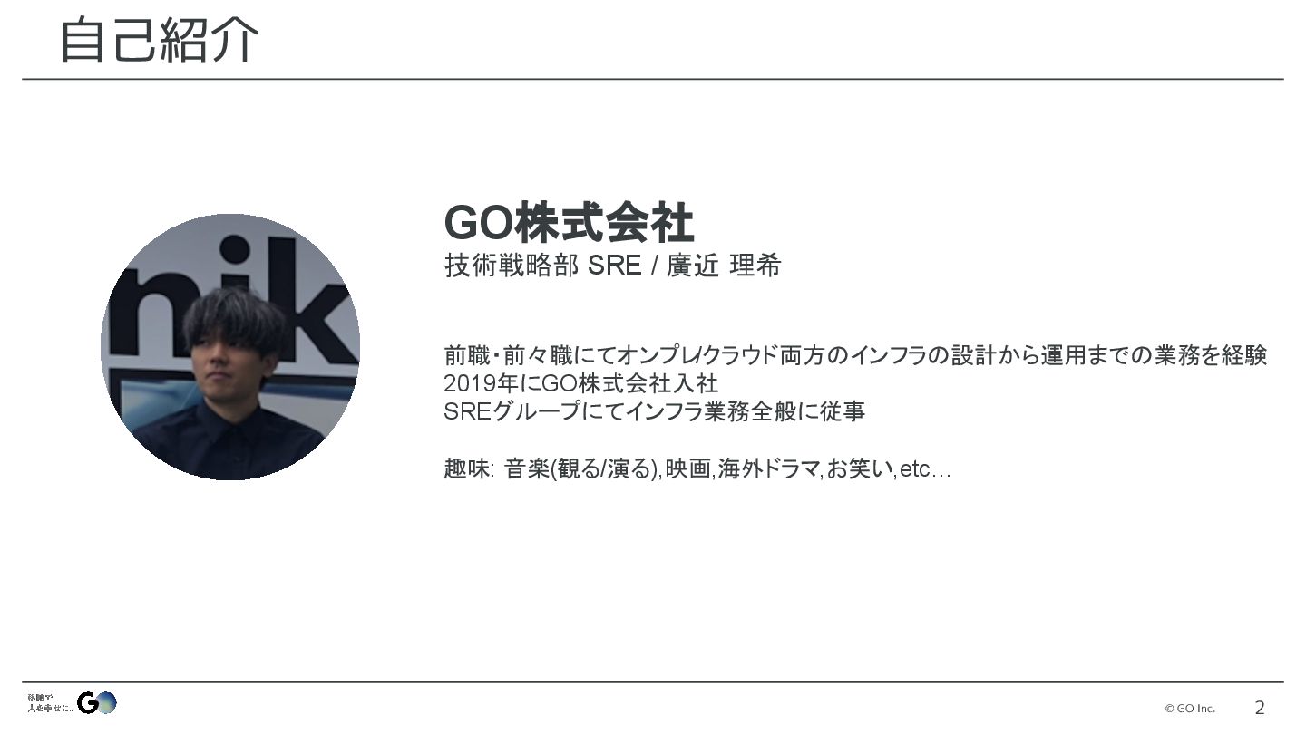 1. © GO Inc. 自己紹介 GO株式会社 技術戦略部 SRE / 廣近 理希