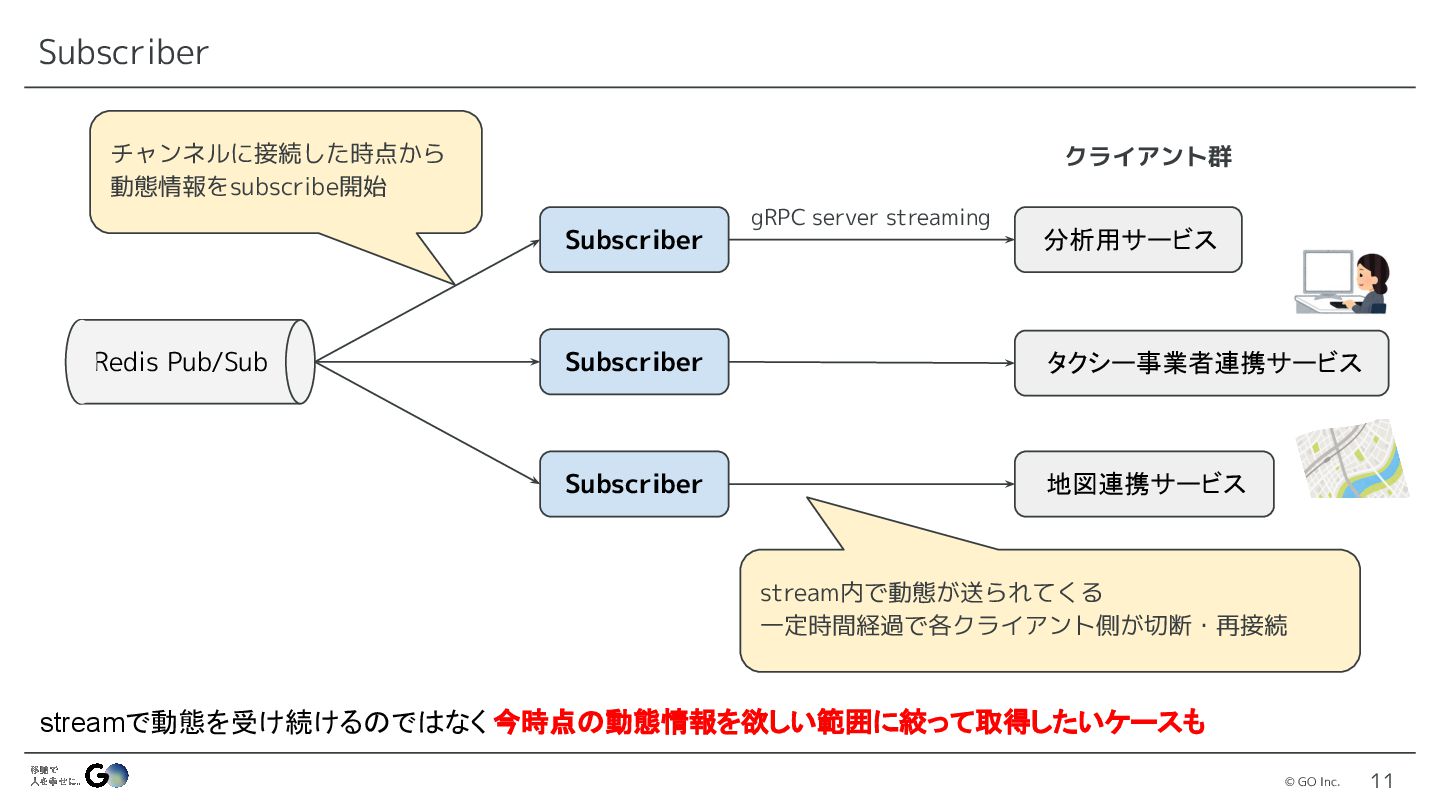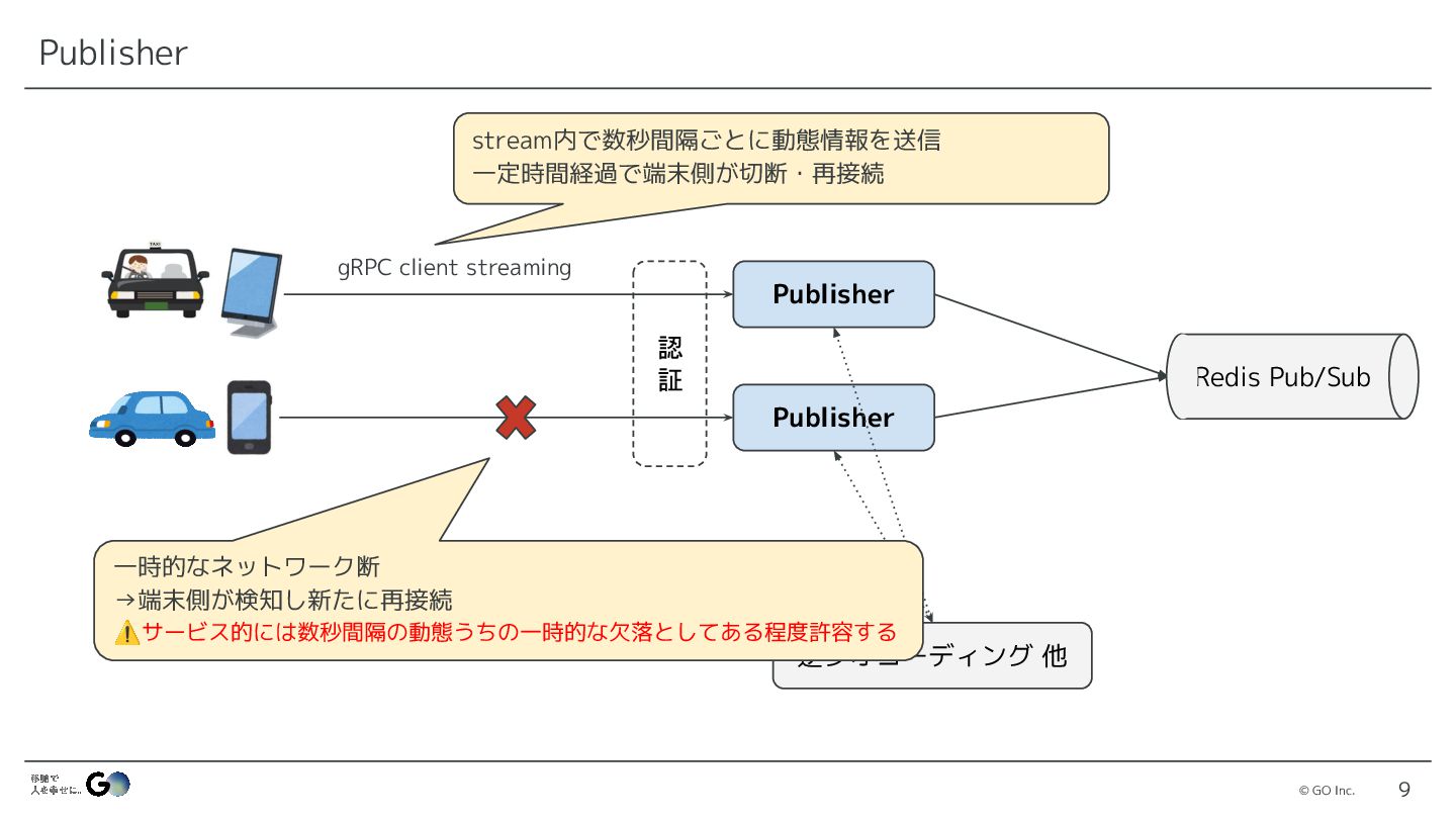 8. © GO Inc. Subscriber 分析用サービス タクシー事業者連携サービス 地図連携サービス stream内で動態が送られてくる 一定時間経過で各クライアント側が切断・再接続 クライアント群