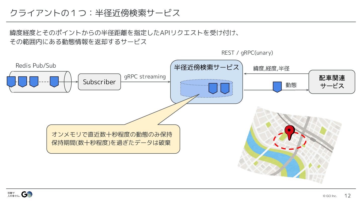 9. © GO Inc. クライアントの1つ:半径近傍検索サービス Subscriber Redis Pub/Sub 配車関連 サービス 半径近傍検索サービス