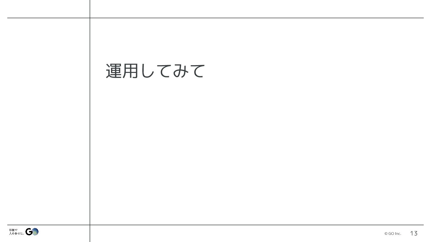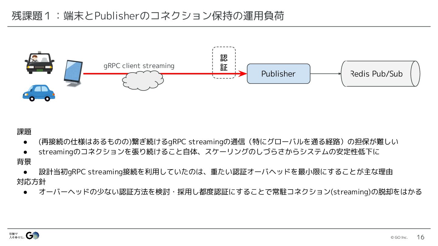 12. © GO Inc. 残課題1:端末とPublisherのコネクション保持の運用負荷 課題 • (再接続の仕様はあるものの)繋ぎ続けるgRPC streamingの通信(特にグローバルを通る経路)の担保が難しい • streamingのコネクションを張り続けること自体、スケーリングのしづらさからシステムの安定性低下に