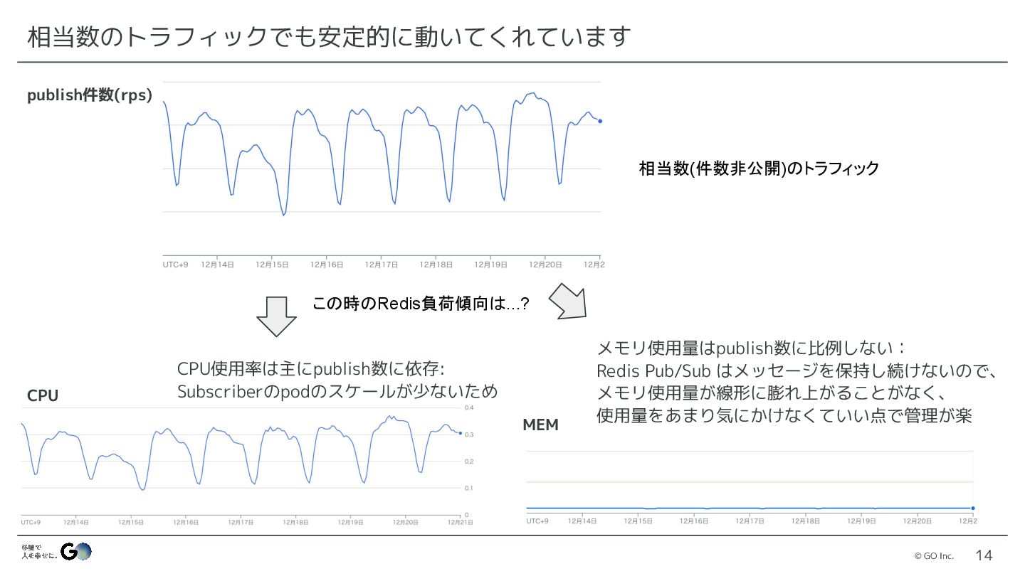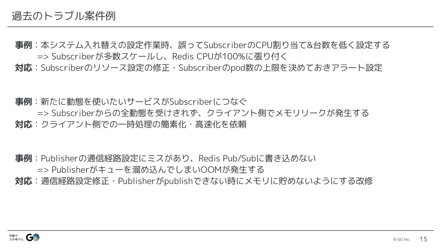 11. © GO Inc. 過去のトラブル案件例 事例:本システム入れ替えの設定作業時、誤ってSubscriberのCPU割り当て&台数を低く設定する => Subscriberが多数スケールし、Redis CPUが100%に張り付く 対応:Subscriberのリソース設定の修正・Subscriberのpod数の上限を決めておきアラート設定 事例:新たに動態を使いたいサービスがSubscriberにつなぐ