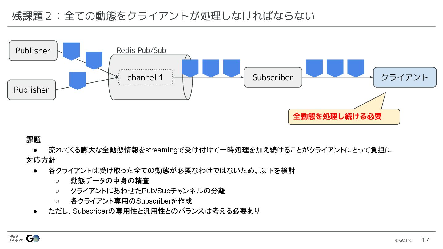 13. © GO Inc. 課題 • 流れてくる膨大な全動態情報をstreamingで受け付けて一時処理を加え続けることがクライアントにとって負担に 対応方針 • 各クライアントは受け取った全ての動態が必要なわけではないため、以下を検討 ◦