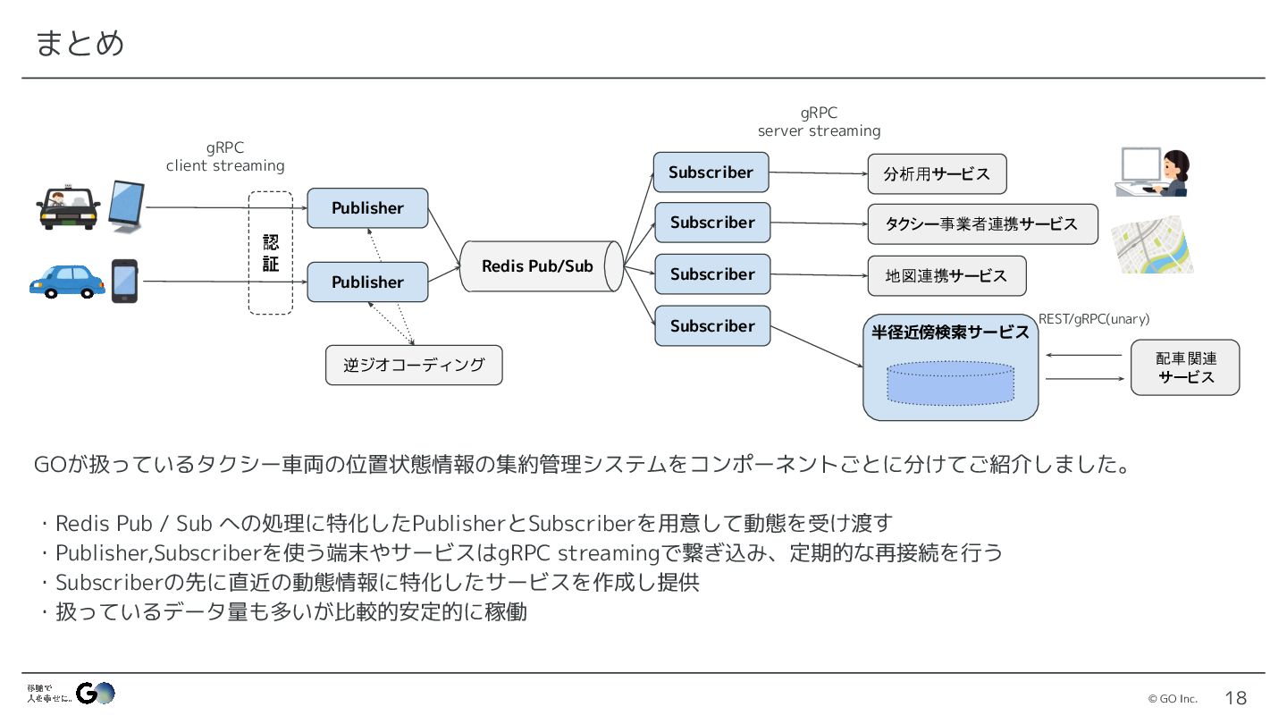 14. © GO Inc. まとめ GOが扱っているタクシー車両の位置状態情報の集約管理システムをコンポーネントごとに分けてご紹介しました。 ・Redis Pub / Sub への処理に特化したPublisherとSubscriberを用意して動態を受け渡す
