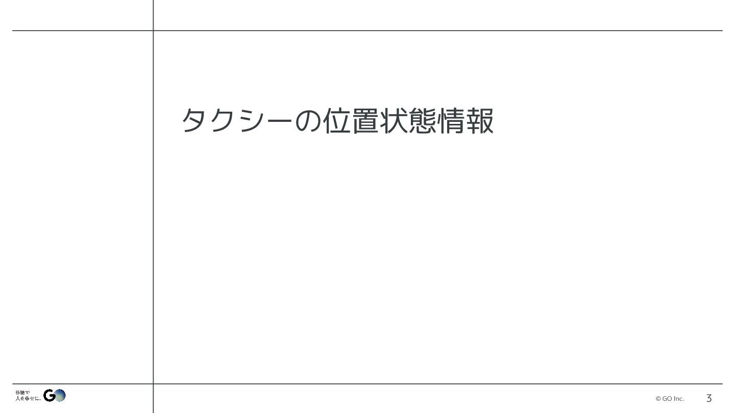 2. © GO Inc. タクシーの位置状態情報とは 簡単に言うと... 『GO』アプリで動いてるタクシー車両 の元となっている情報 配車サービス上では、あくまで位置状態情報の一部を利用 位置状態情報が持っているもの一例 ・緯度経度