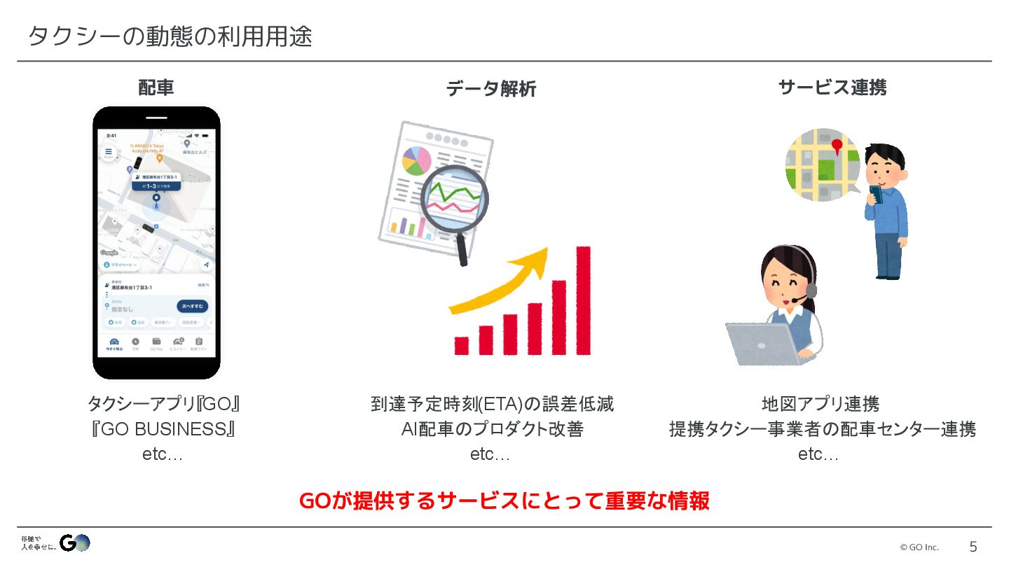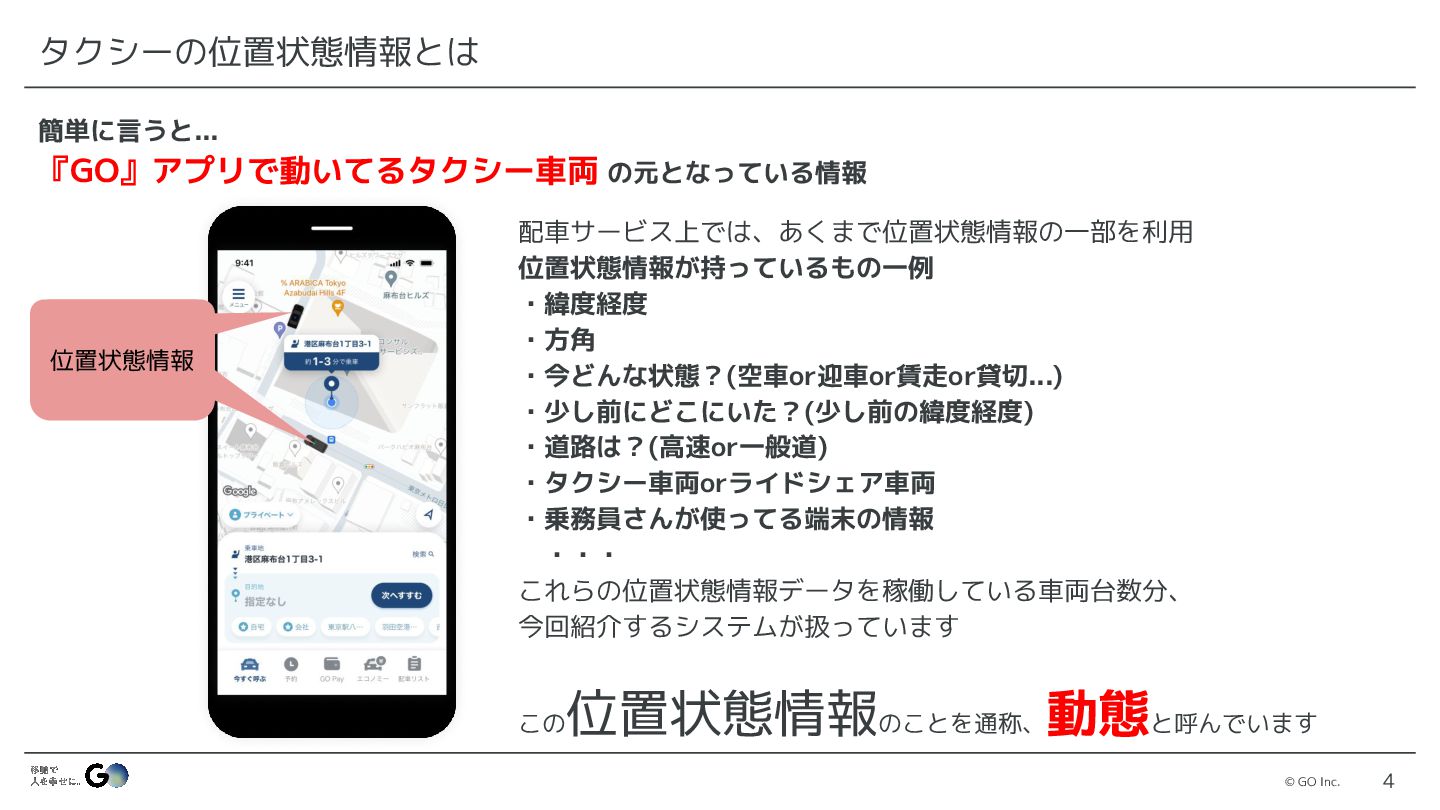 3. © GO Inc. タクシーの動態の利用用途 配車 データ解析 サービス連携 タクシーアプリ『GO』 『GO BUSINESS』