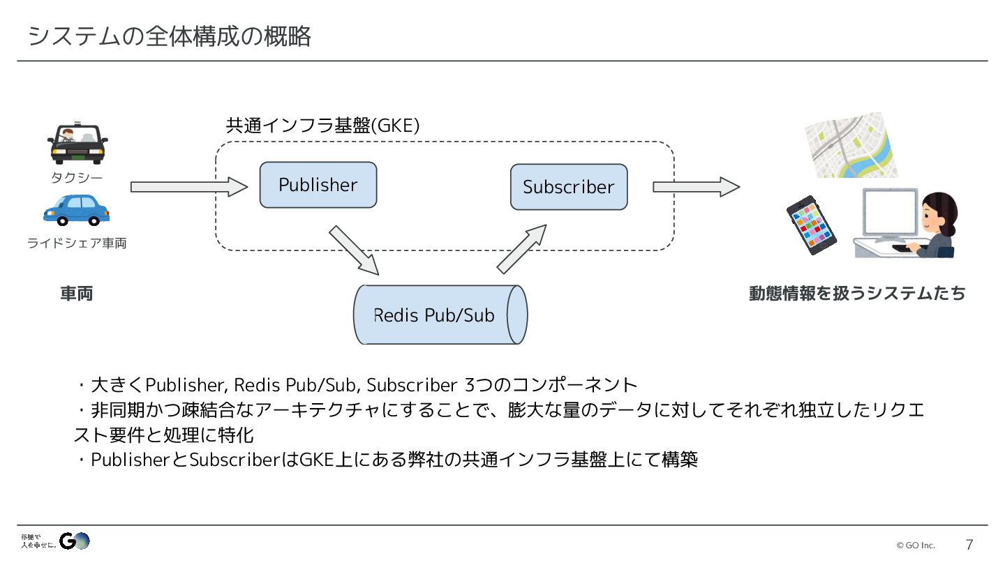 4. © GO Inc. システムの全体構成の概略 タクシー ライドシェア車両 動態情報を扱うシステムたち ・大きくPublisher, Redis Pub/Sub,