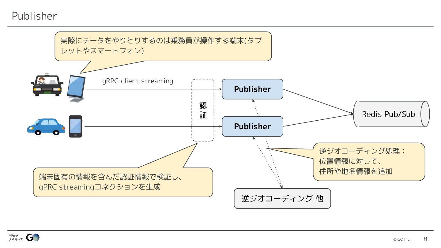 5. © GO Inc. Publisher Publisher 実際にデータをやりとりするのは乗務員が操作する端末(タブ レットやスマートフォン) gRPC client streaming